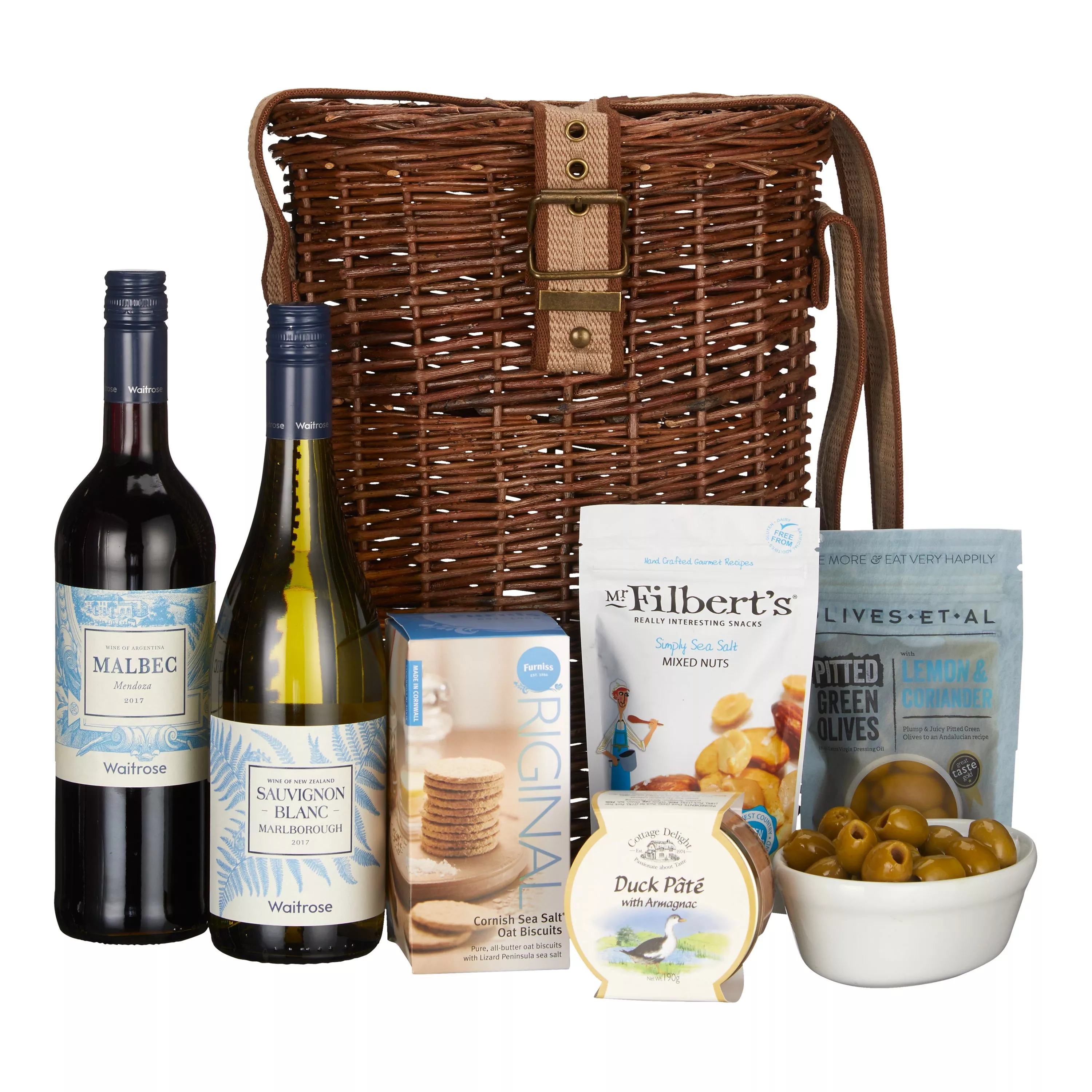 Enjoy a winter's evening in front of the fire with a glass of wine and a suitably seasonal snack. This lidded, woven basket includes red and white wines and a selection of delicious savoury accompaniments.