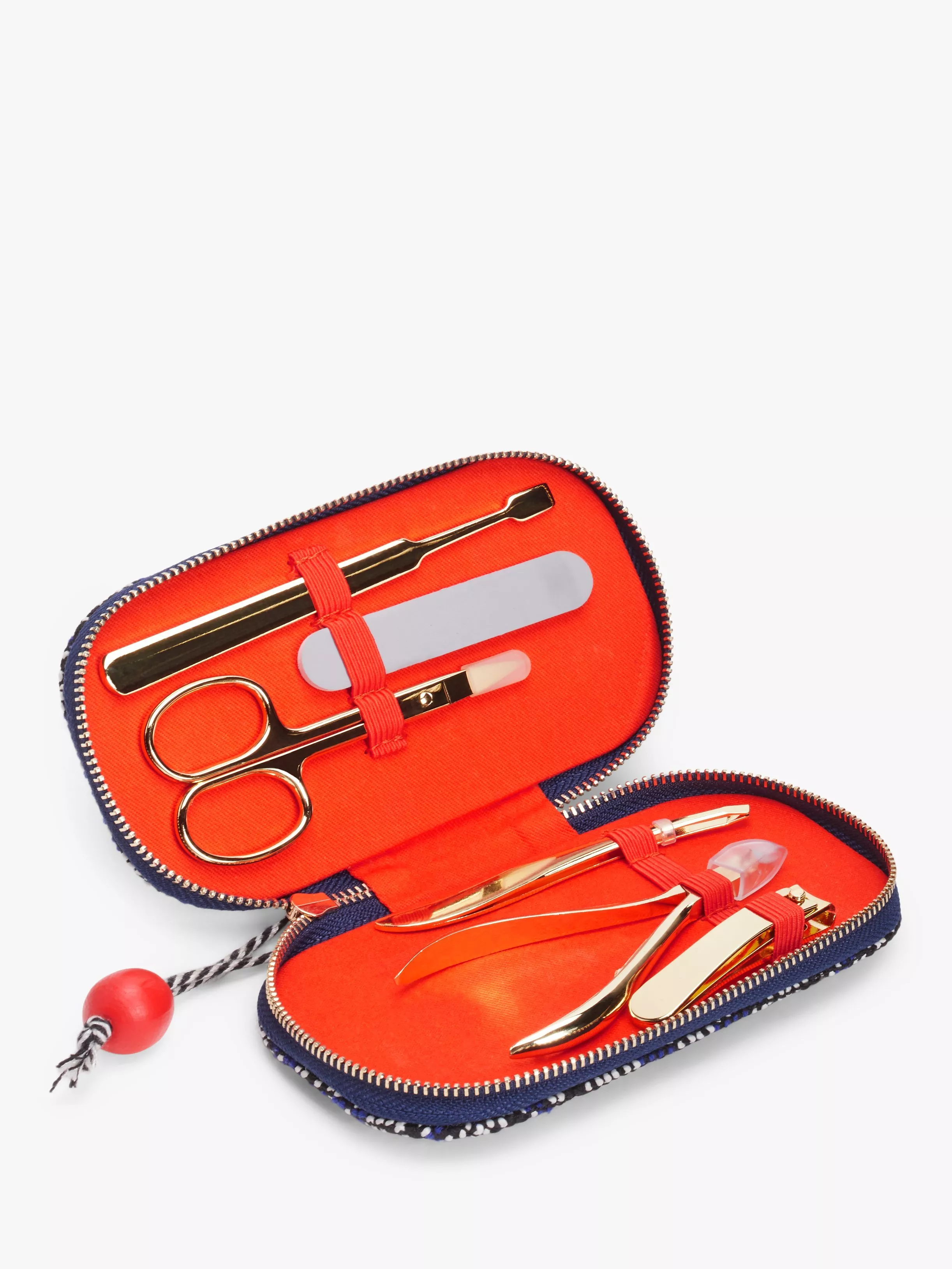 A woven manicure set with geometric design in navy and cream, comprised of all you need to keep your hands and feet prim and proper with a fun, striped zip-pill.