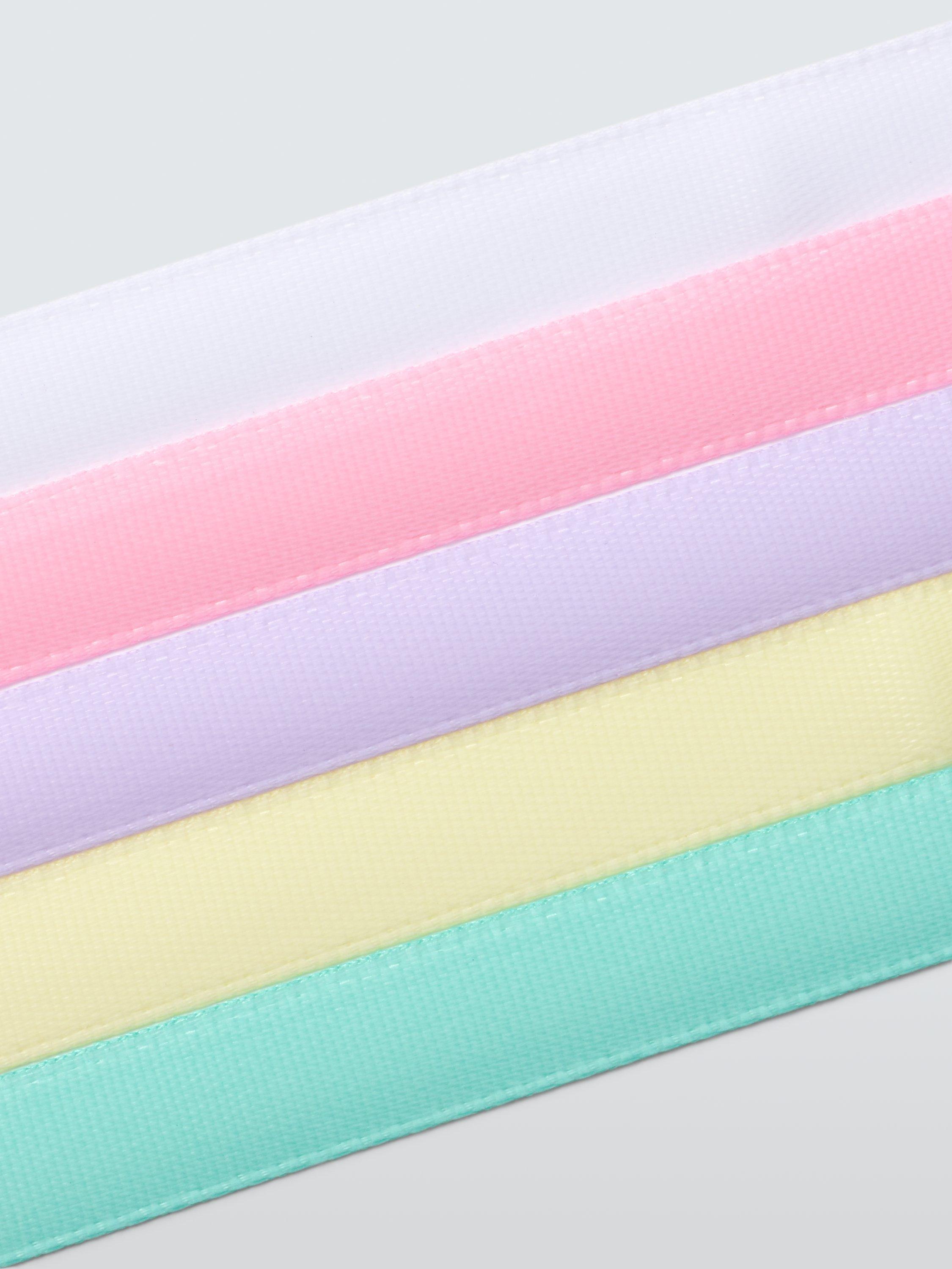 A set of 5 2 metre ribbons in pastel colours of white, pink, lilac, yellow & mint.