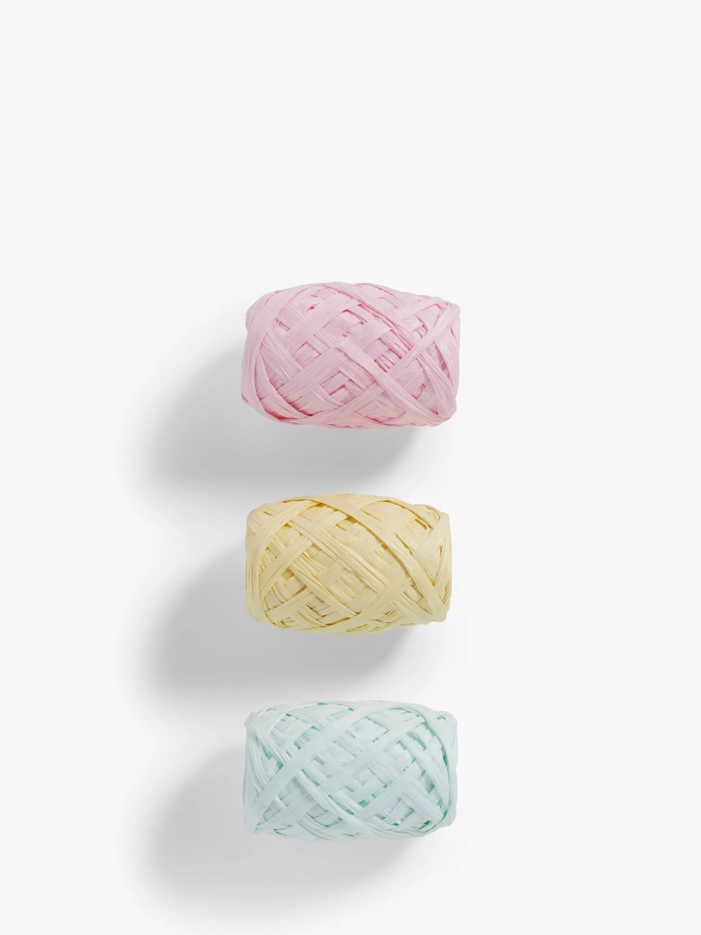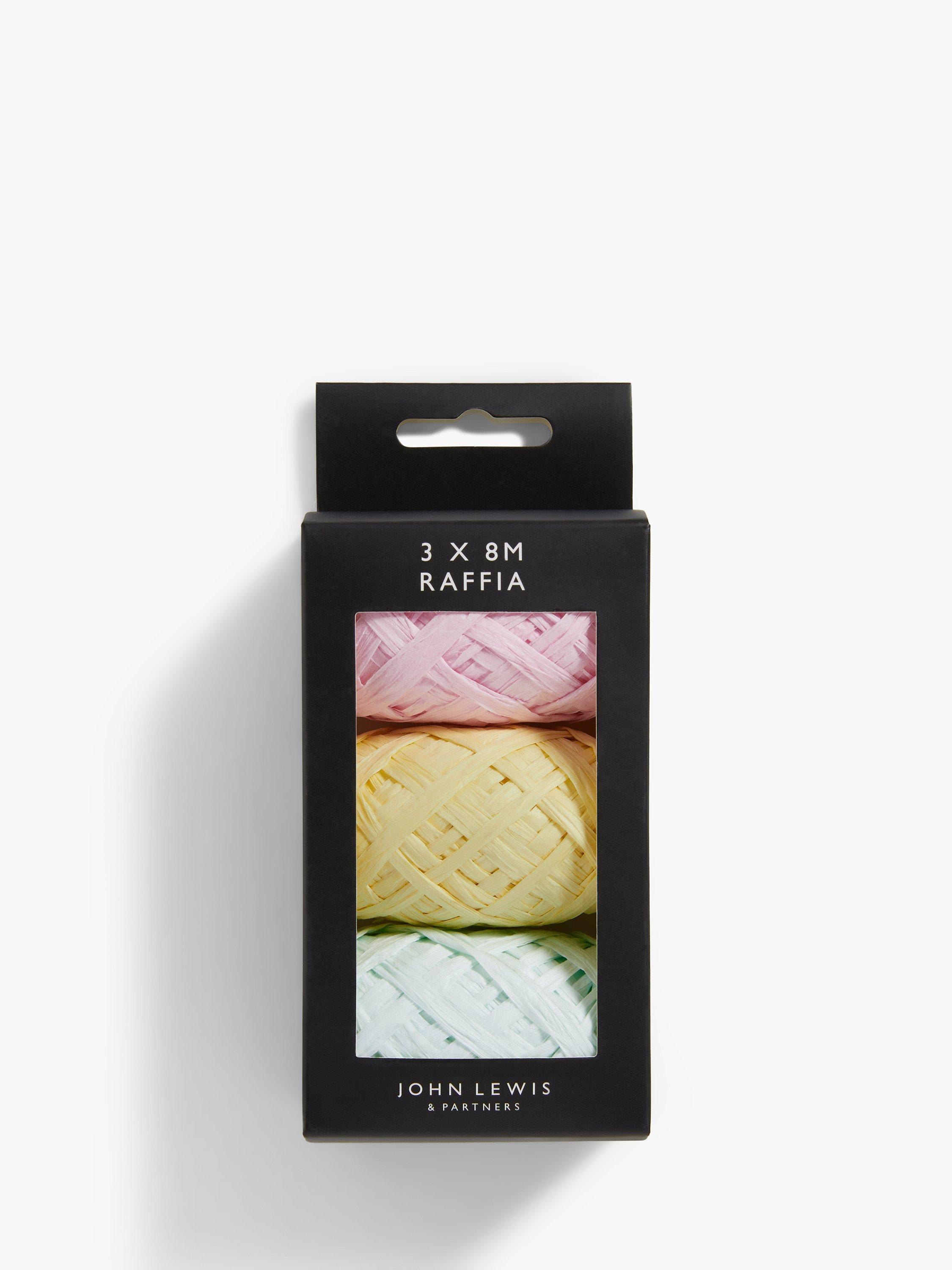 A pack of 3 x 8m pastel raffia cops for gift wrapping.