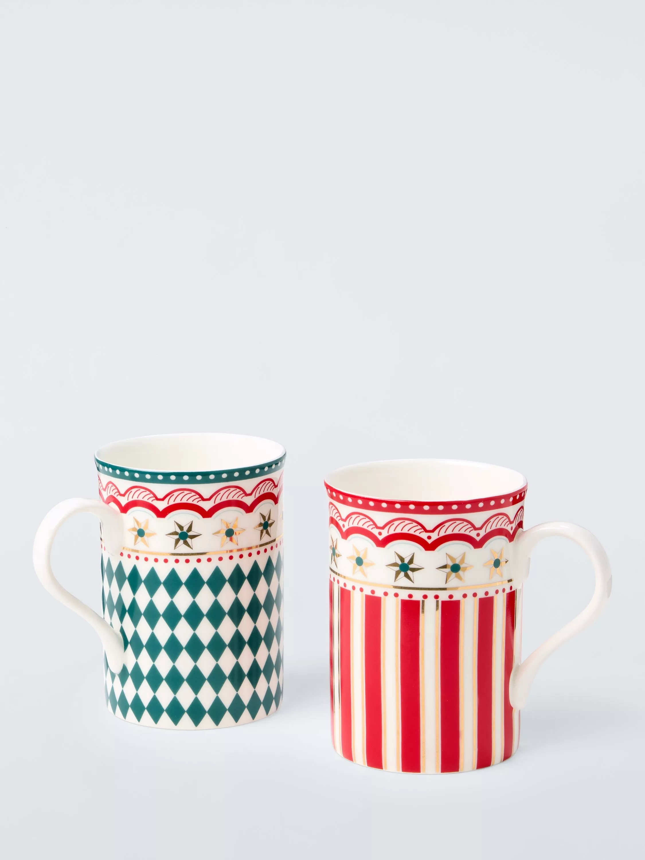 Pair of mugs in seasonal patterns and motifs, one with stripes and the other in a checkerboard design. Made of bone china, they're dishwasher and microwave-safe for everyday use.