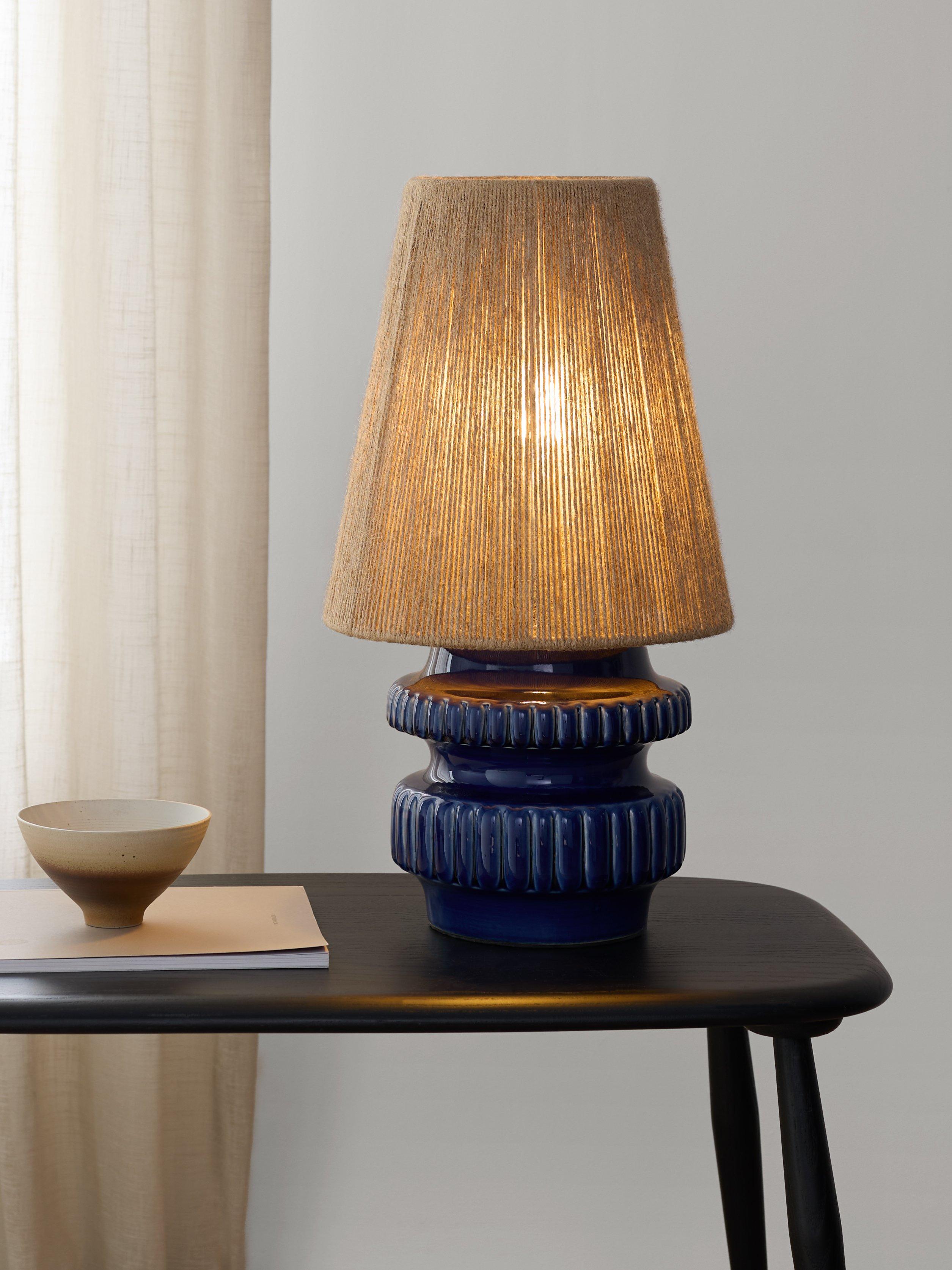 A retro shaped ceramic lamp base in a glossy reactive glaze which creates subtle variations in tone. Paired with natural jute string lampshade for an earthy textural look.