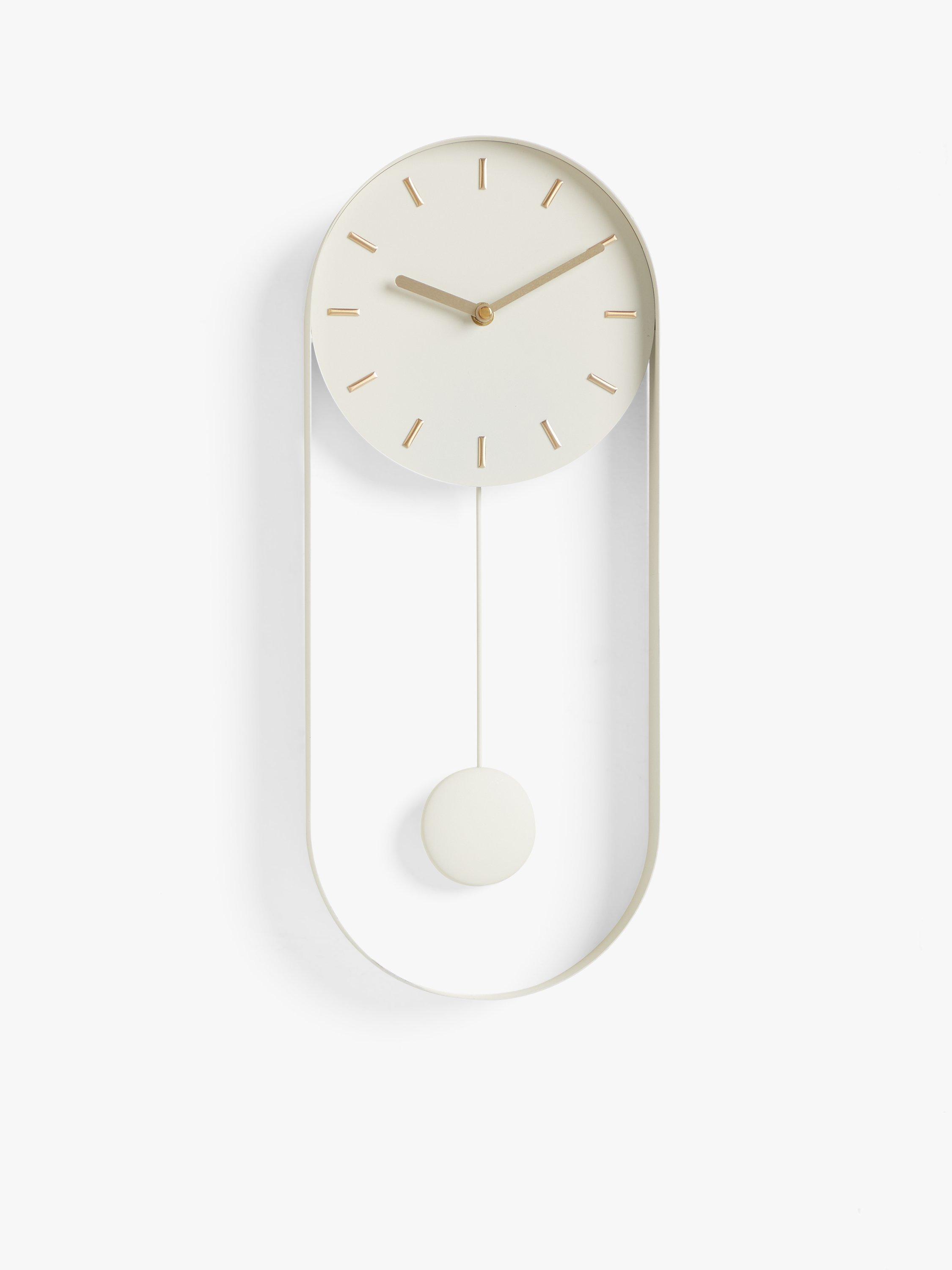 A contemporary take on a pendulum clock, this analogue design has an oval metal casing. The matching pendulum and round clock face are contrasted by gold-toned clocks hands and hour markers.