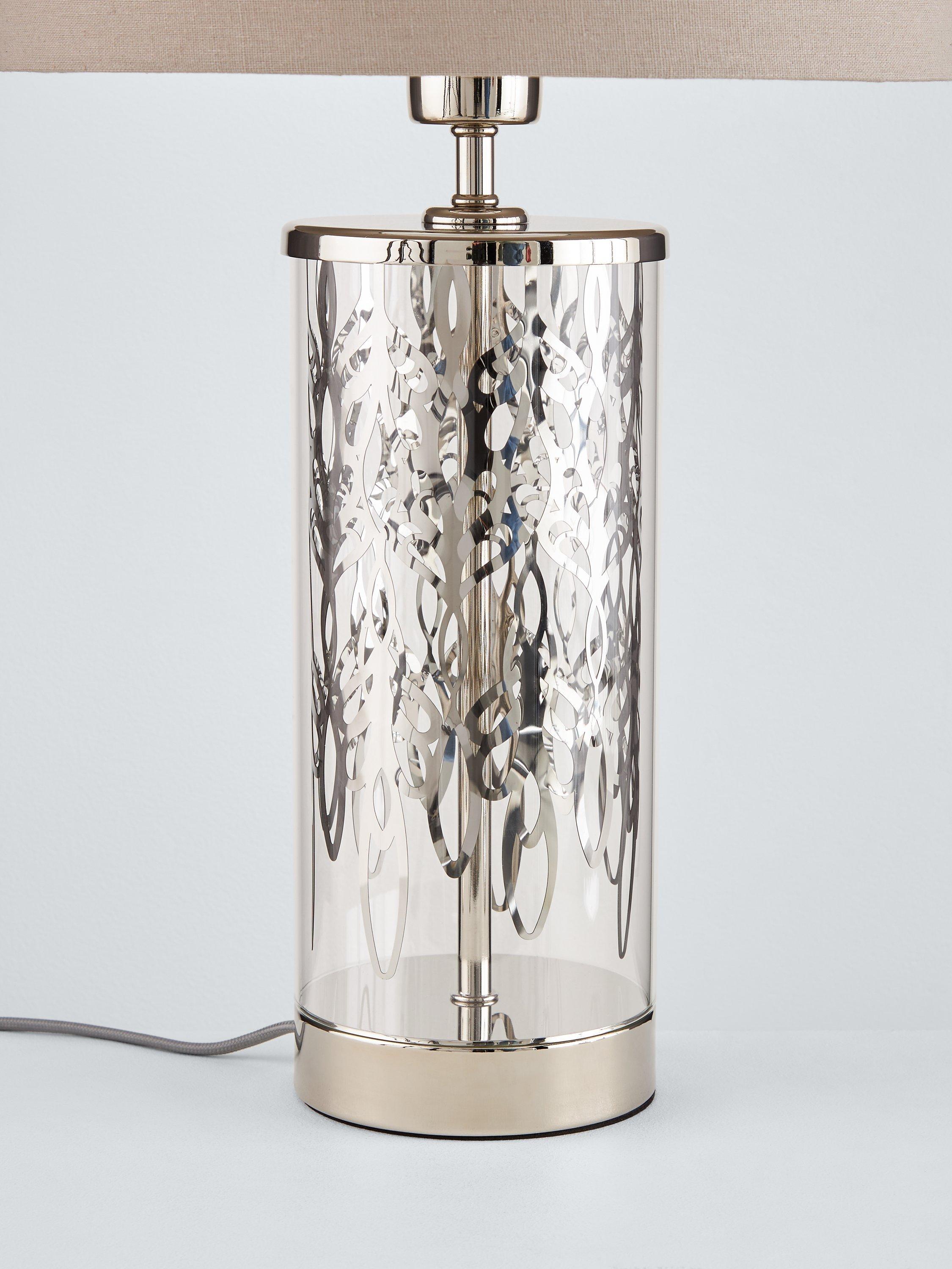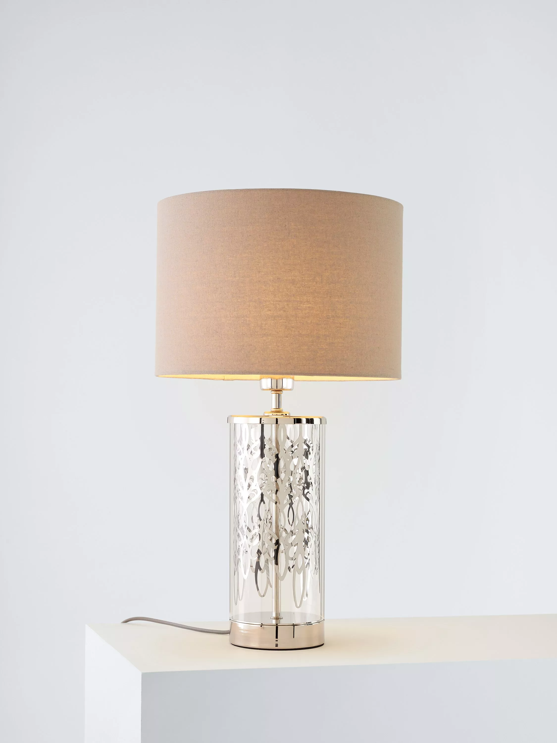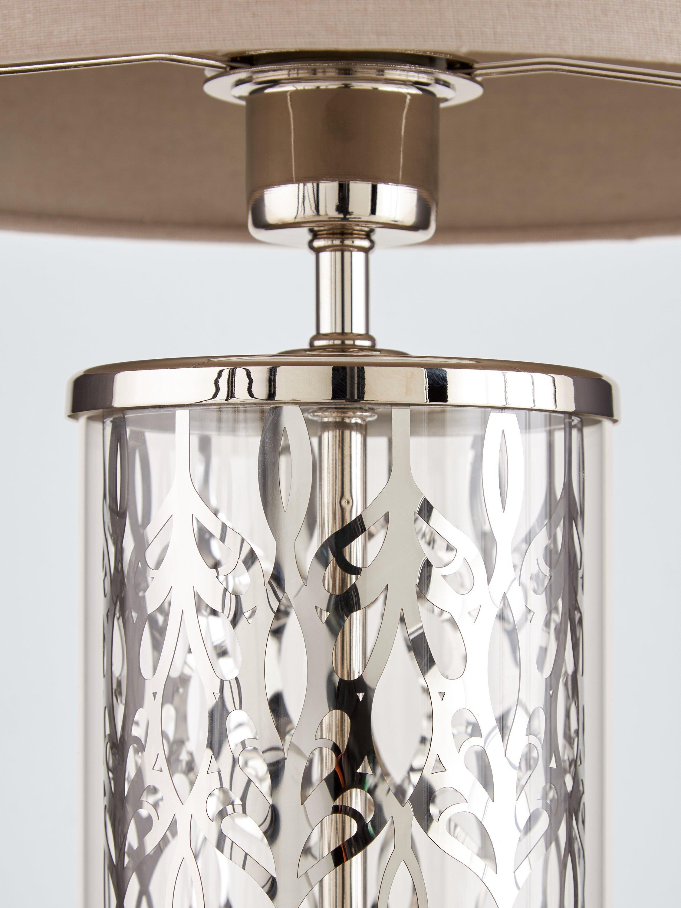 Subtle luxury for the classic interior. A cylinder glass format with etched peony pattern detail is smart and eye-catching. Clear glass alongside bright nickel metalwork sparkles in a neutral setting. A dove grey linen effect shade casts a soft, warm light. A touch on/off base feature makes this easy to interact with.