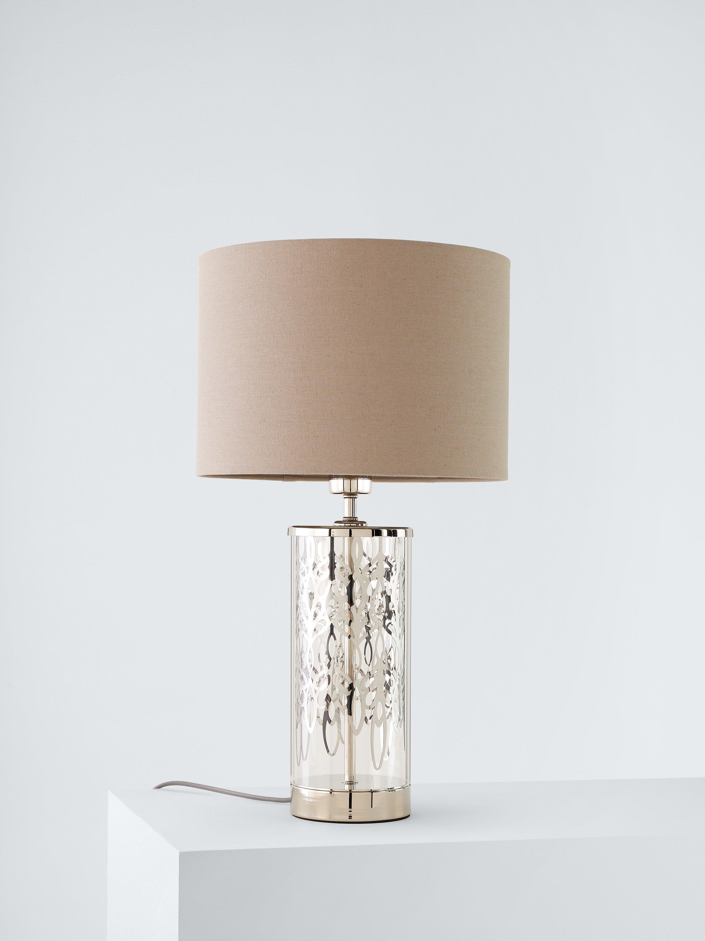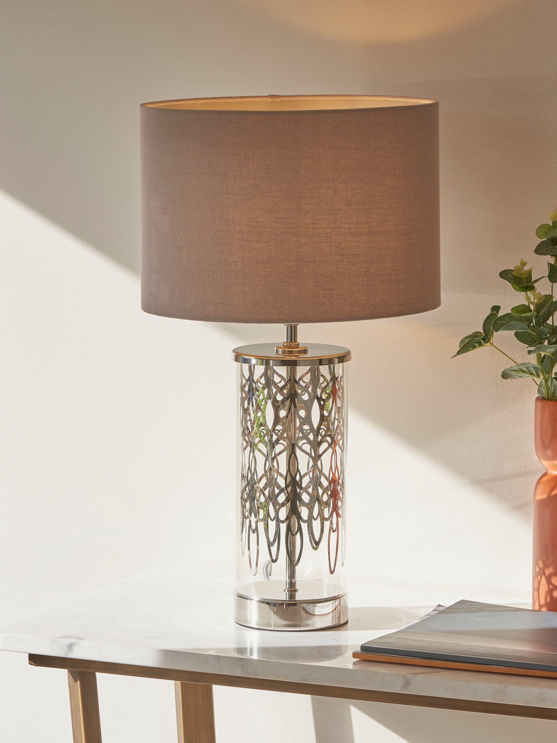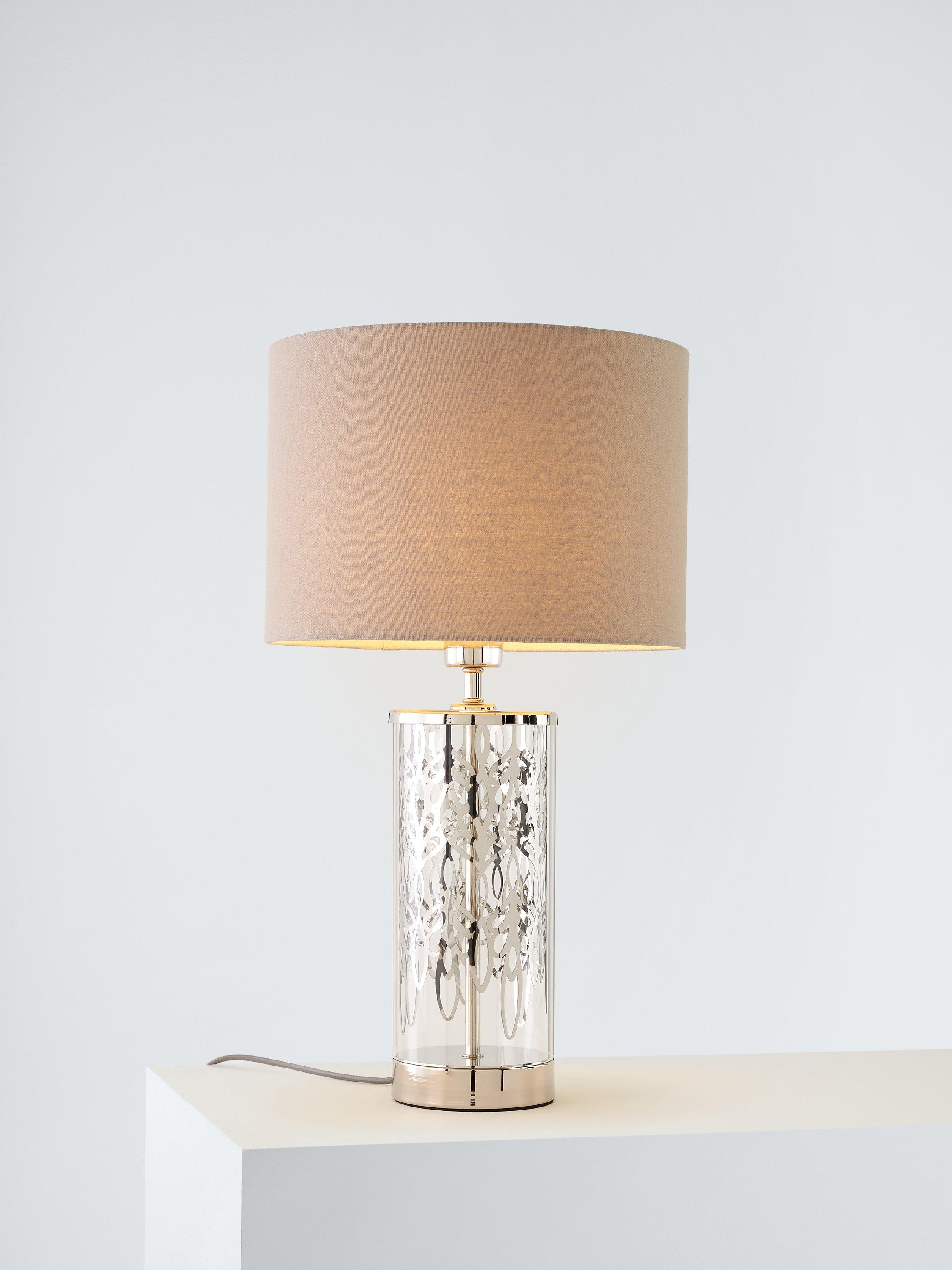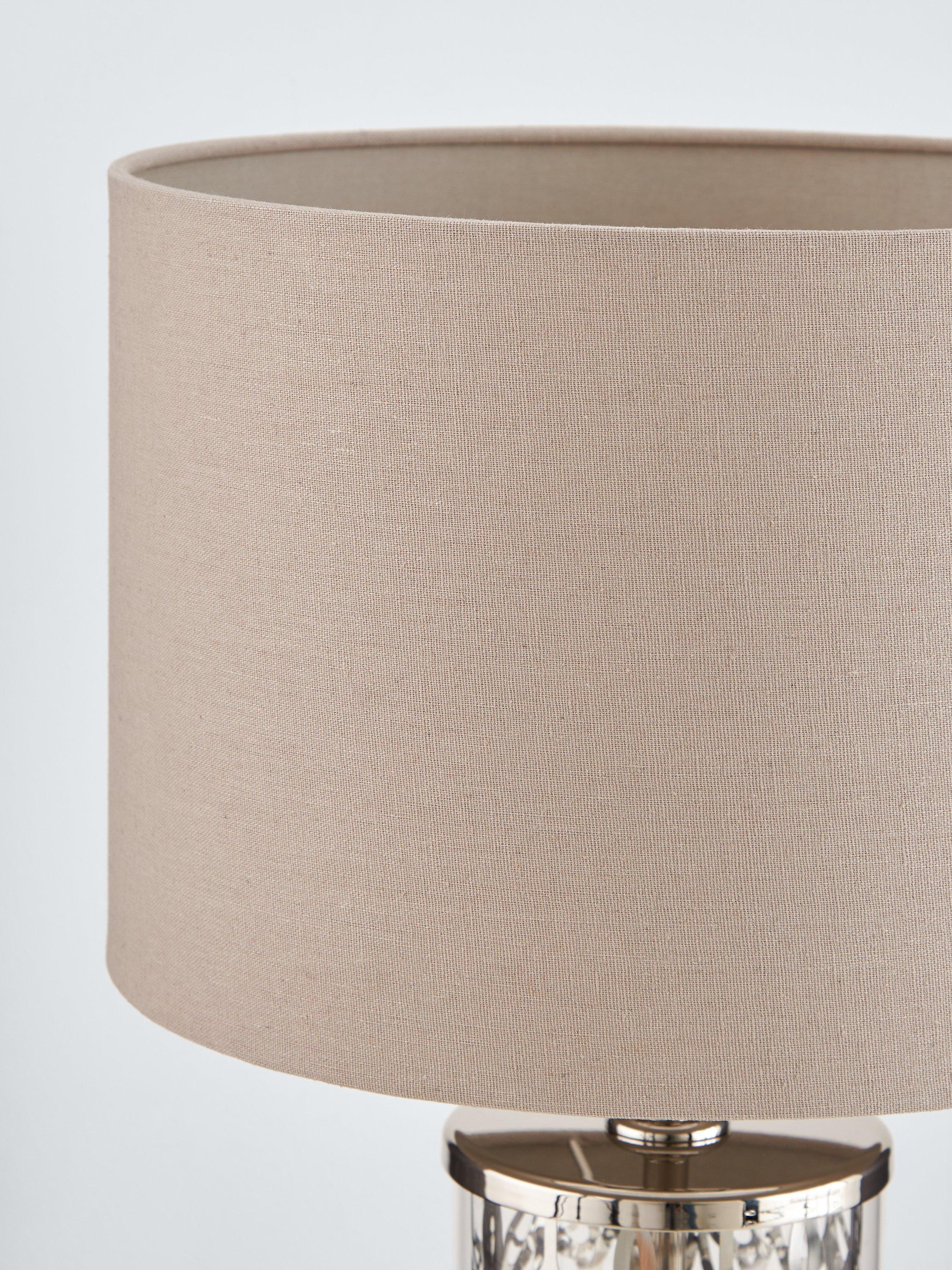 Subtle luxury for the classic interior. A cylinder glass format with etched peony pattern detail is smart and eye-catching. Clear glass alongside bright nickel metalwork sparkles in a neutral setting. A dove grey linen effect shade casts a soft, warm light. A touch on/off base feature makes this easy to interact with.