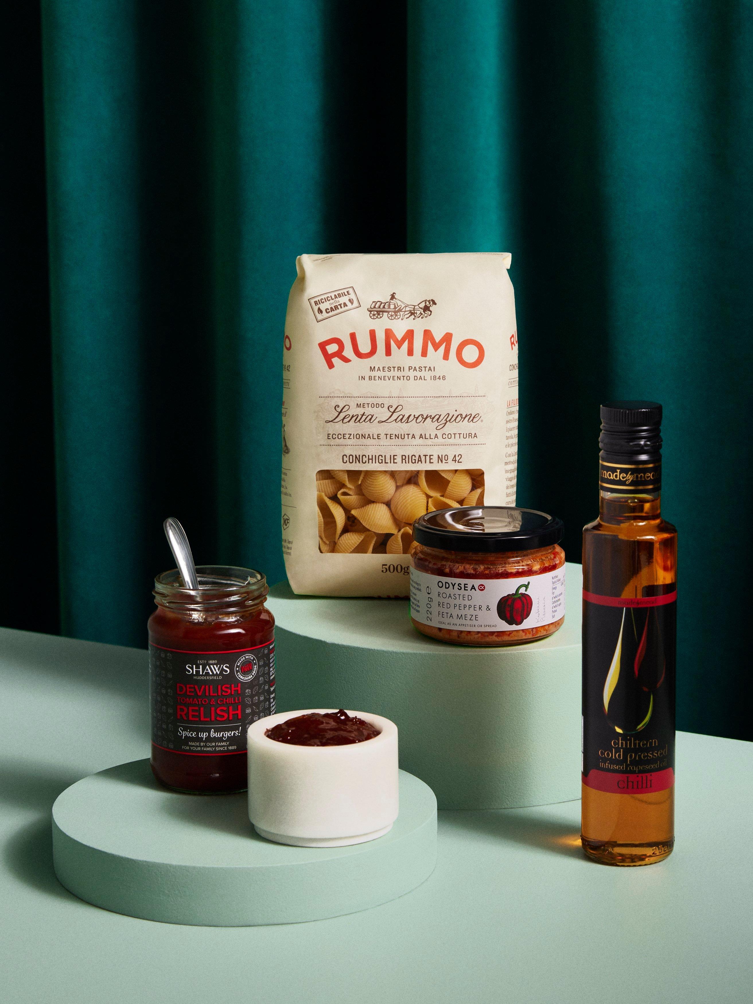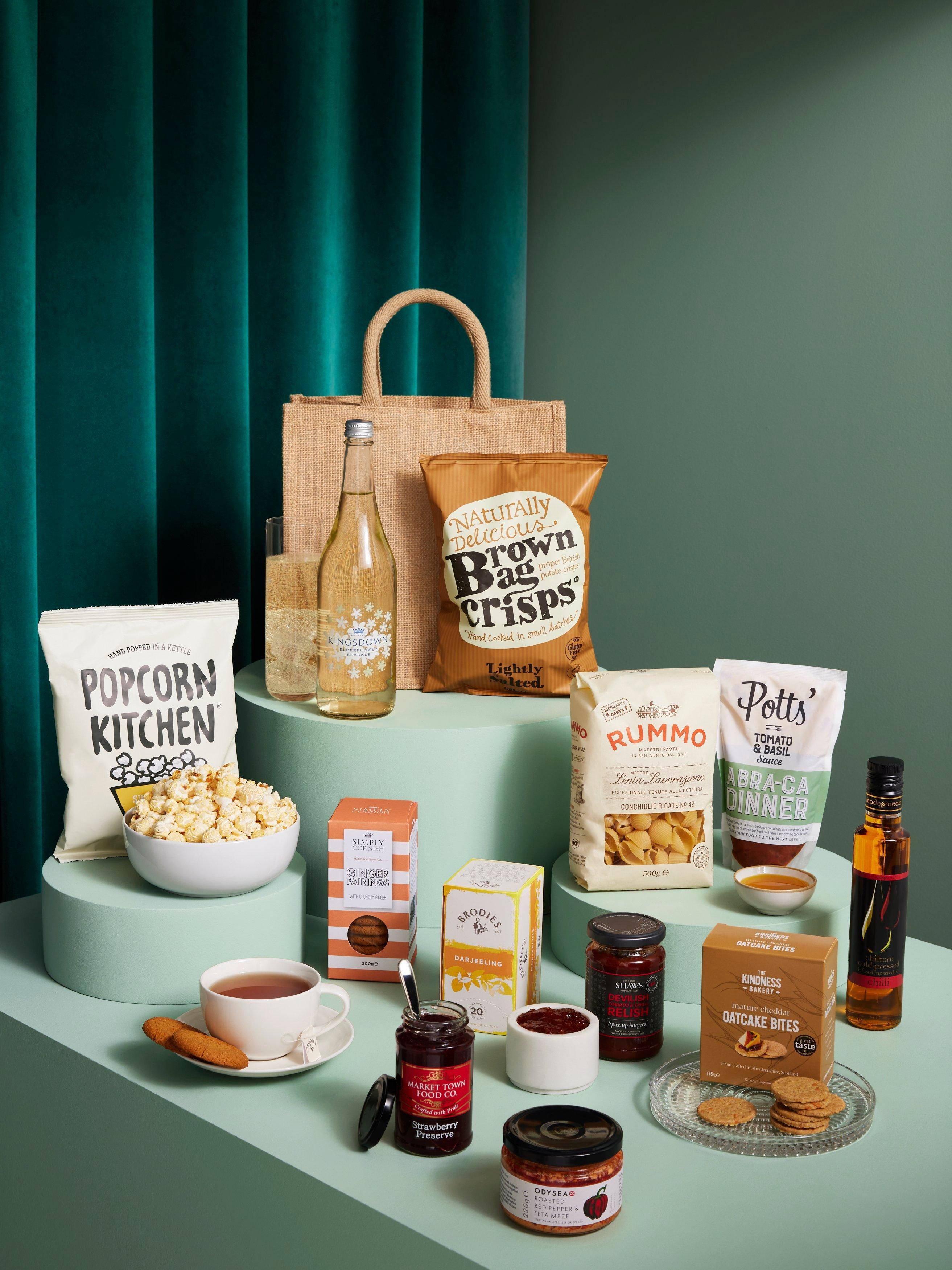 - Kingsdown Elderflower Sparkle 750ml Rummo Conchiglie Rigate No 42 500g Potts' Abra-ca Dinner Tomato & Basil Sauce 350g Shaws Devilish Tomato & Chilli Relish 300g Chiltern Cold Pressed Chilli Infused Rapeseed Oil 250ml Market Town Bakery Strawberry Preserve 227g Odysea Roasted Red Pepper & Feta Meze 220g Simply Cornish Ginger Fairings 200g The Kindness Bakery Mature Cheddar Cheese Oatcake Bites 175g Brown Bag Crisps Lightly Salted 150g Popcorn Kitchen Simply Sweet 100g Brodies Darjeeling Tea 20 Bags 40g