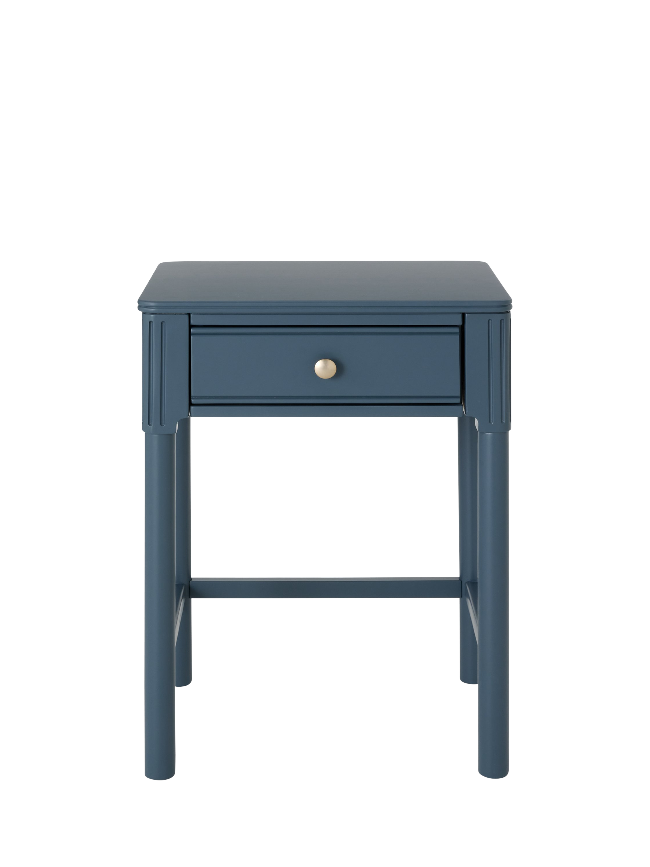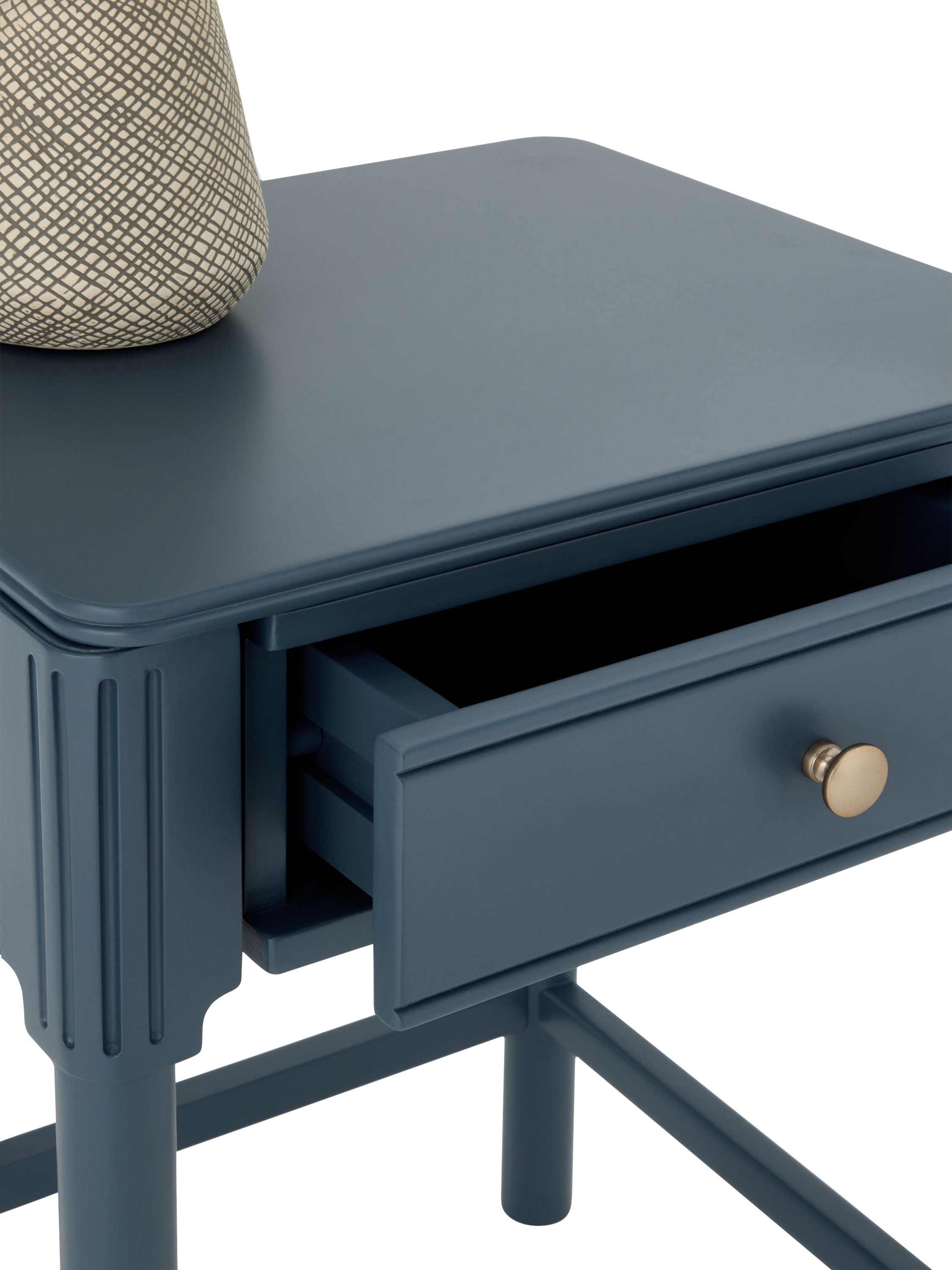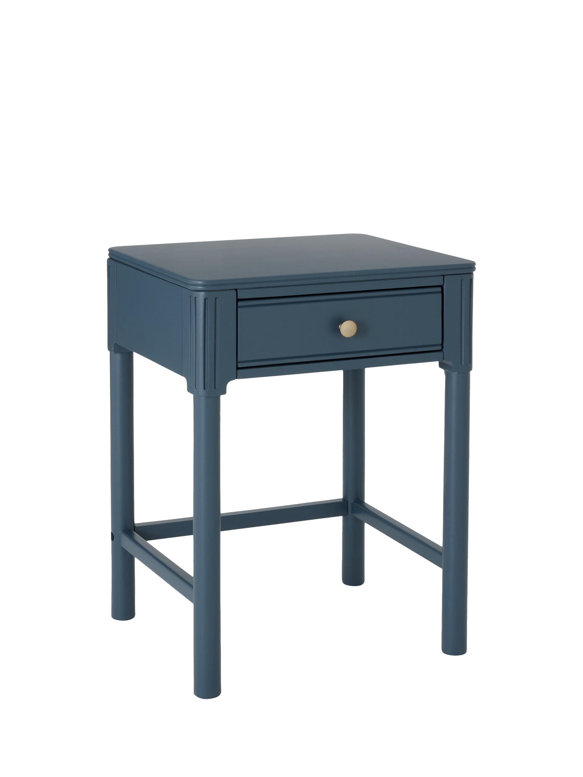Our Pillar range of bedroom furniture is timeless and practical. This bedside table is built from a combination of robust timbers and features a handy drawer for storage. We've embellished the edges of the frame and added a decorative rolled top which softens its profile and adds visual interest, and the gold hardware offers a luxe contrast. The painted finish will add an injection of colour to your bedroom.