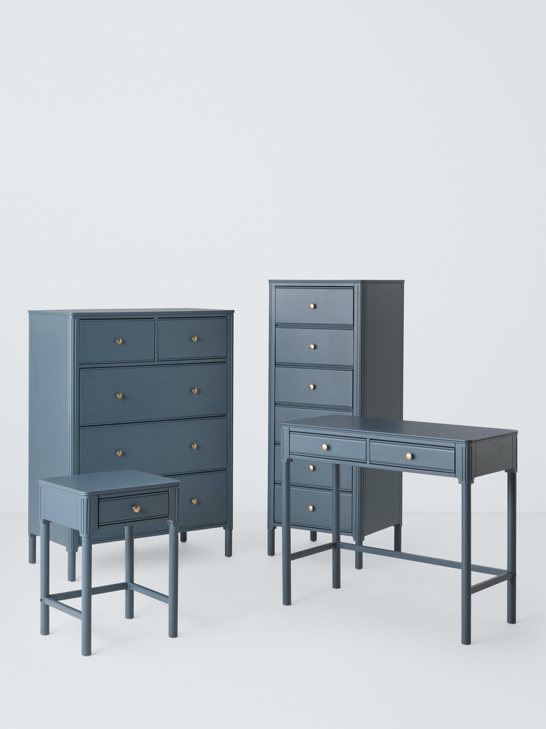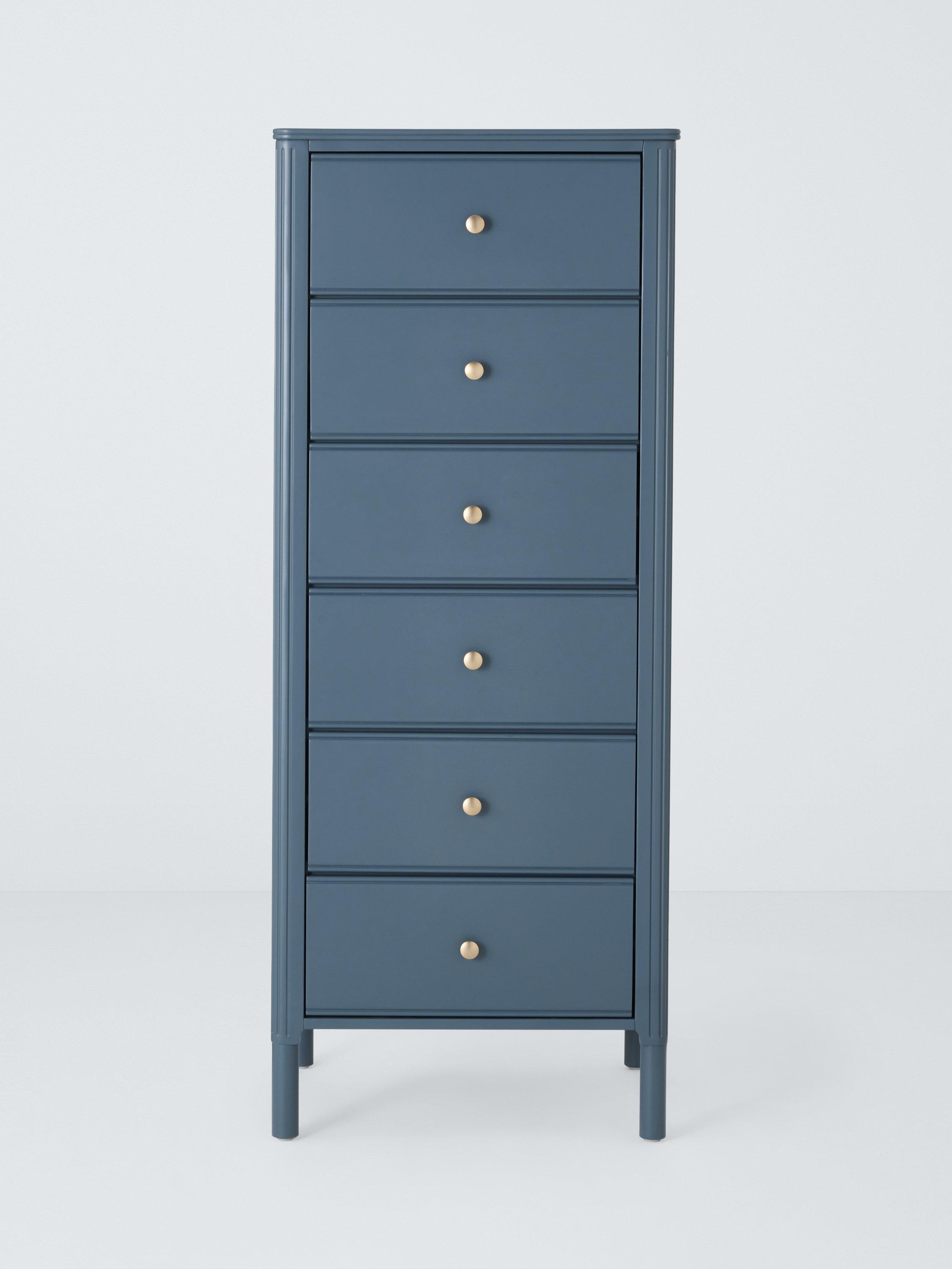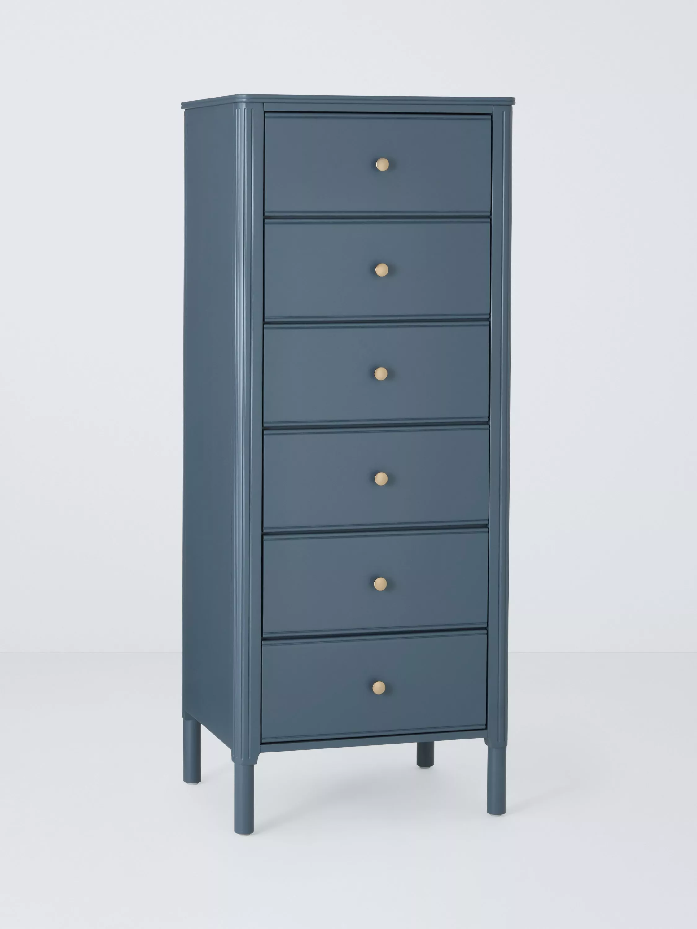 Our Pillar range of bedroom furniture is timeless and practical. This tallboy chest is an ideal option if floor space is limited in your bedroom, as its tall height and narrow profile mean it won't take up too much room. It's built from a combination of robust timbers and there's plenty of storage available in its six deep drawers. We've embellished the edges of the frame and added a decorative rolled top which softens its profile and adds visual interest, and the gold hardware offers a luxe contrast. The painted finish will add an injection of colour to your bedroom, too.