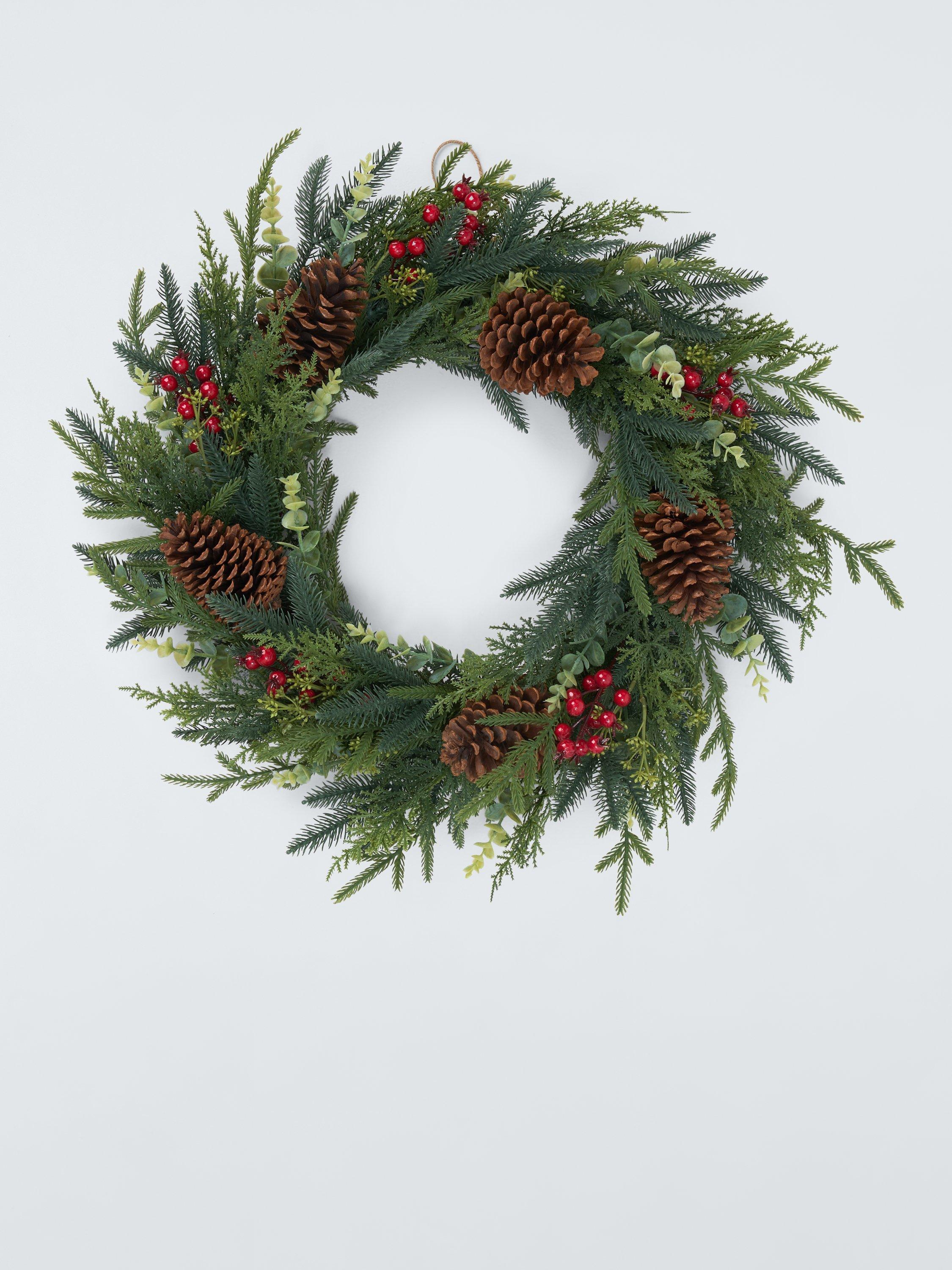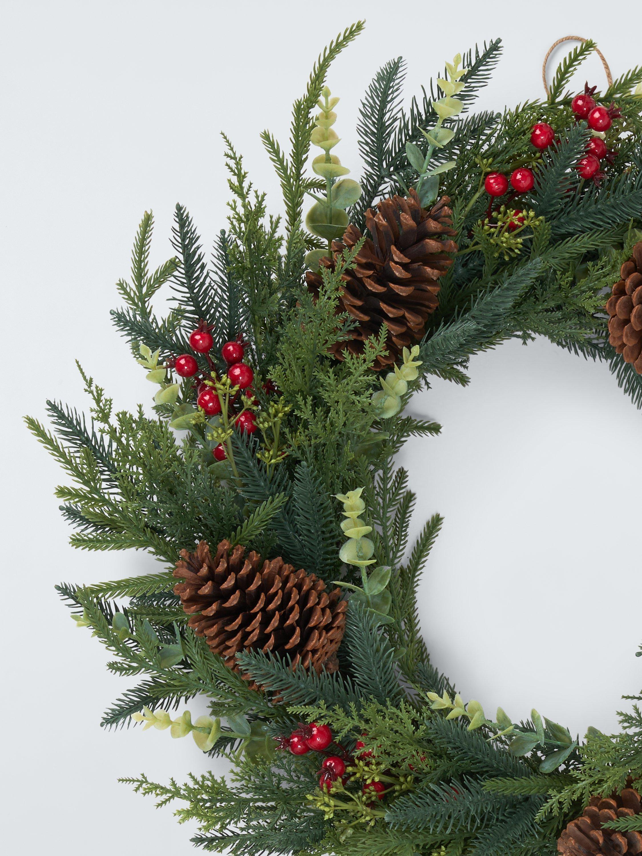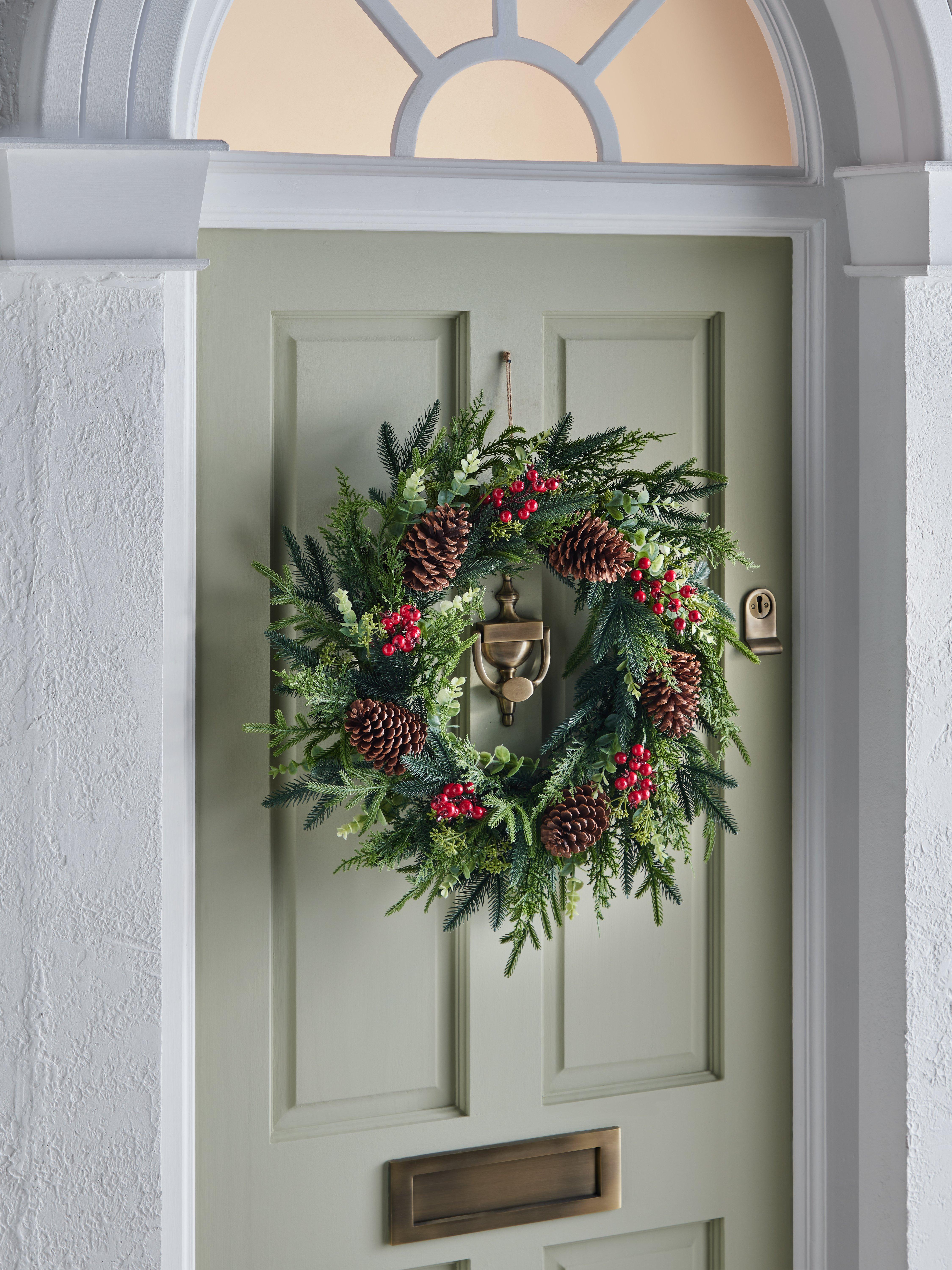 Adorned with vibrant red accents, natural pinecones, and lush greenery, this large wreath brings a warm, inviting touch to any door or wall. Perfect for creating a traditional welcome, this wreath is a festive favourite that captures the spirit of Christmas beautifully.