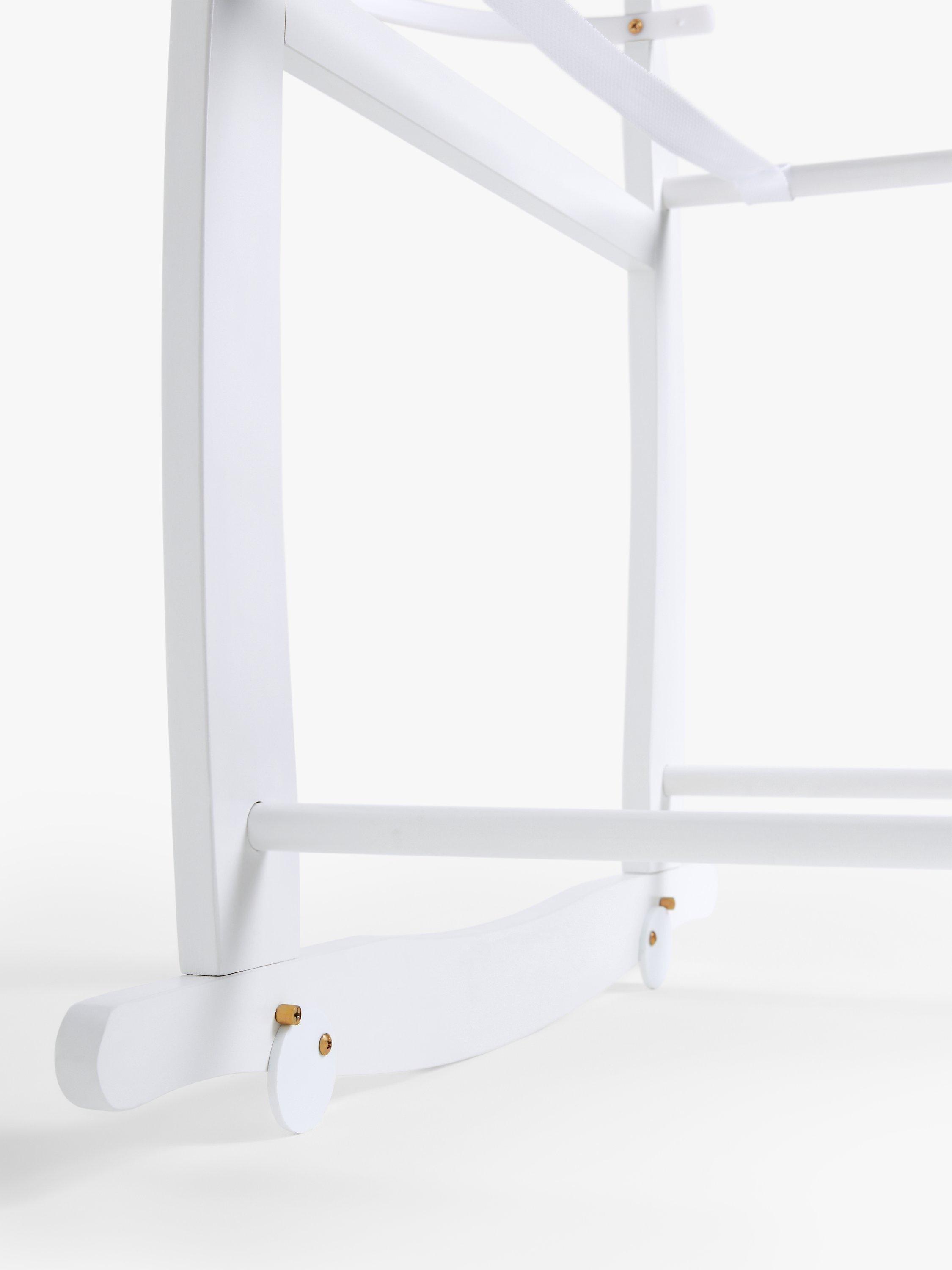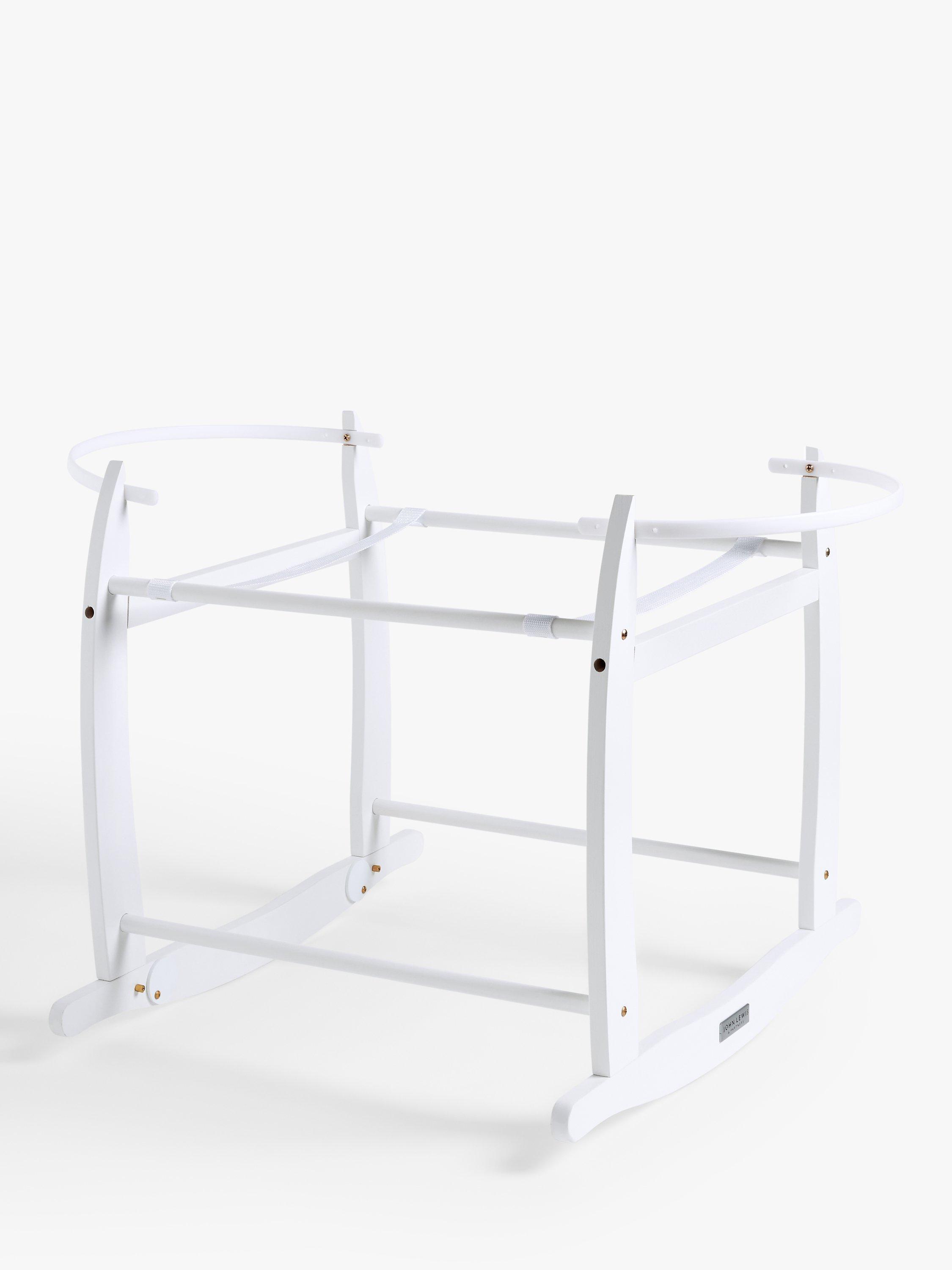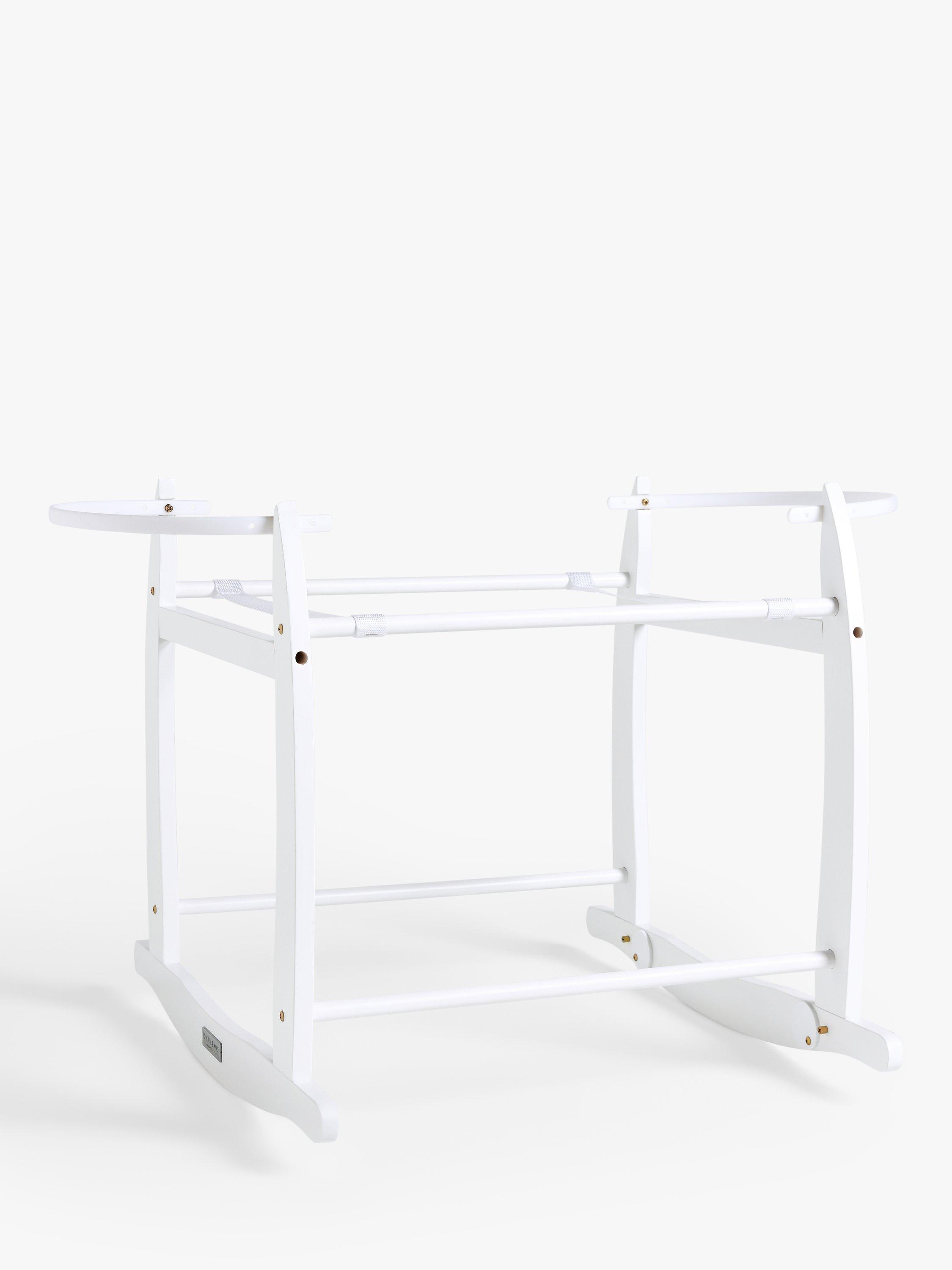 This Moses basket stand is made from solid pinewood and has a natural finish. The stand features curved legs that allow you to rock your little one to sleep and a safety railing at the top and bottom.
