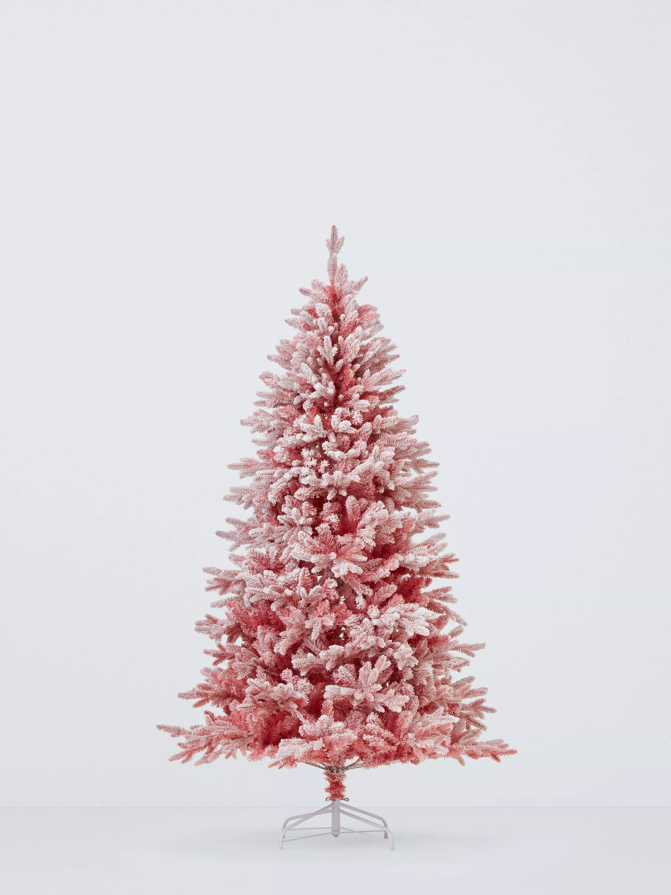 A bushy artificial Christmas tree in white and sugary pinks, with flocking for a full and fluffy appearance.