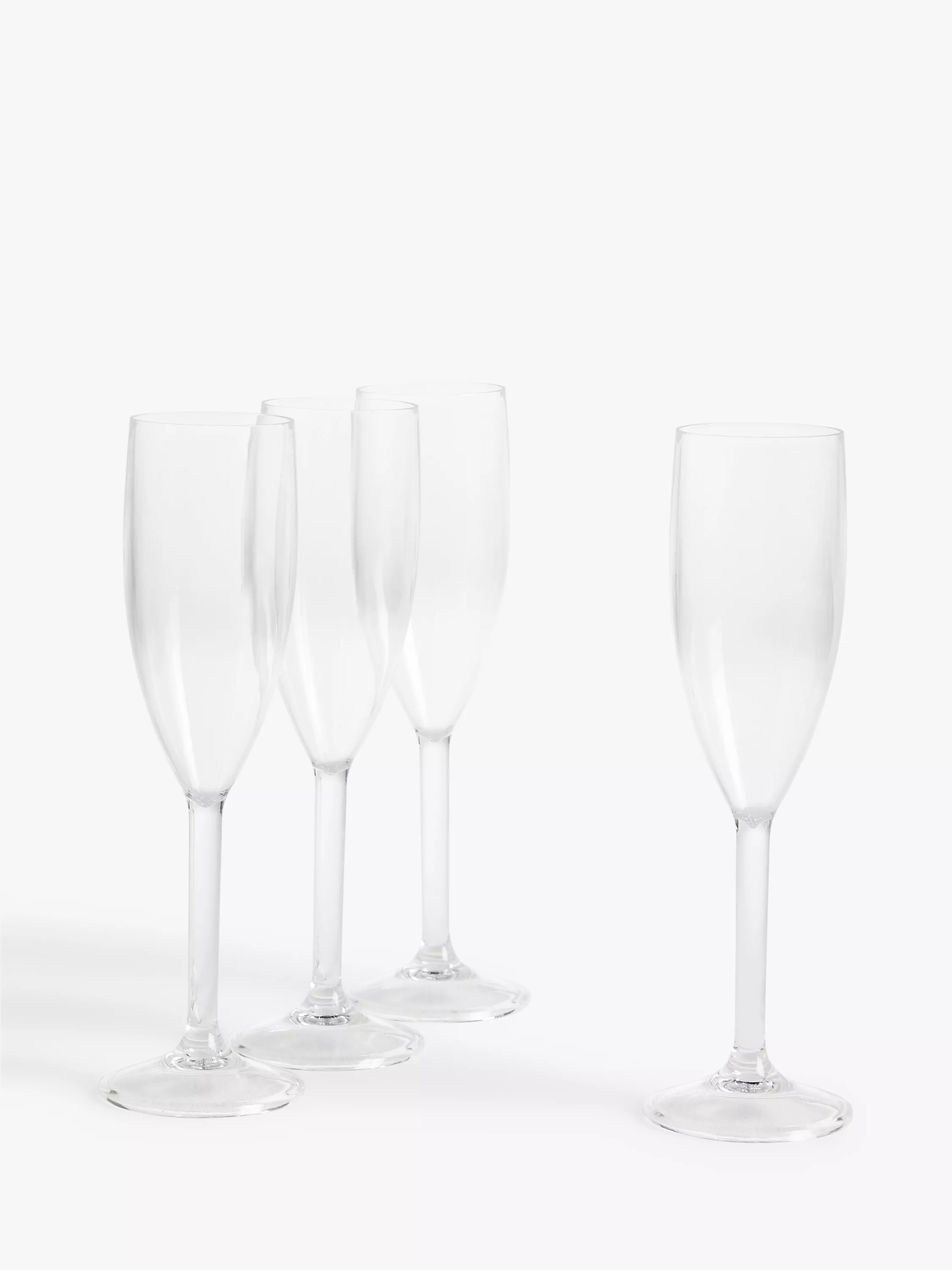 A set of four lightweight and transparent plastic flutes for parties and picnics. The long stem helps keep your drink chilled in the bowl when you're holding the flute. The narrow shape retains fizz and aroma when enjoying champagne, prosecco or sparkling wine.