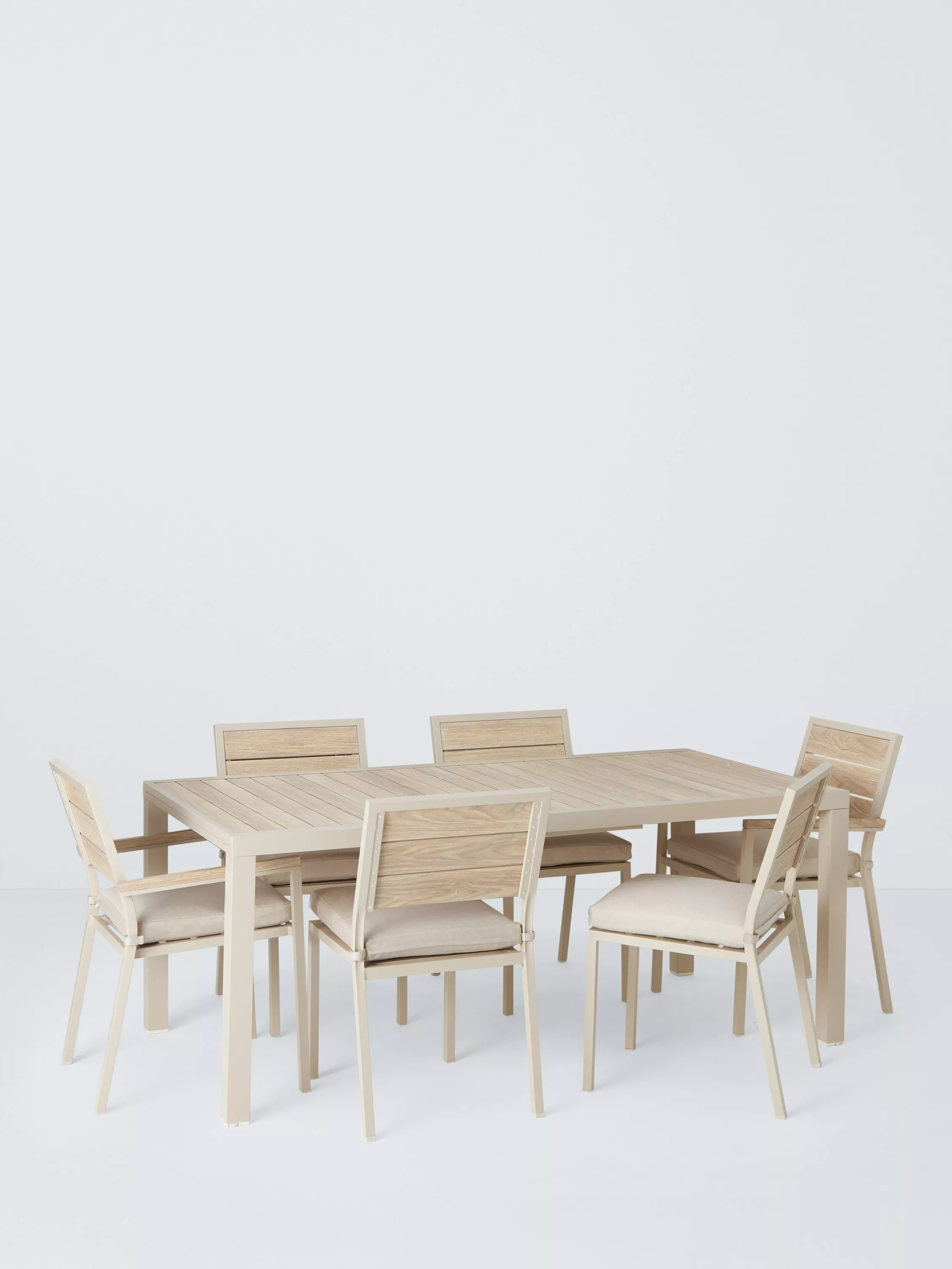 Our Platform extendable garden dining set seats up to six people comfortably and can be extended to accommodate eight people. A modern design, it boasts wood-effect details on the tabletop, echoed on the backs of the included dining chairs. This table comes with four dining chairs, and two more chairs with armrests are included.