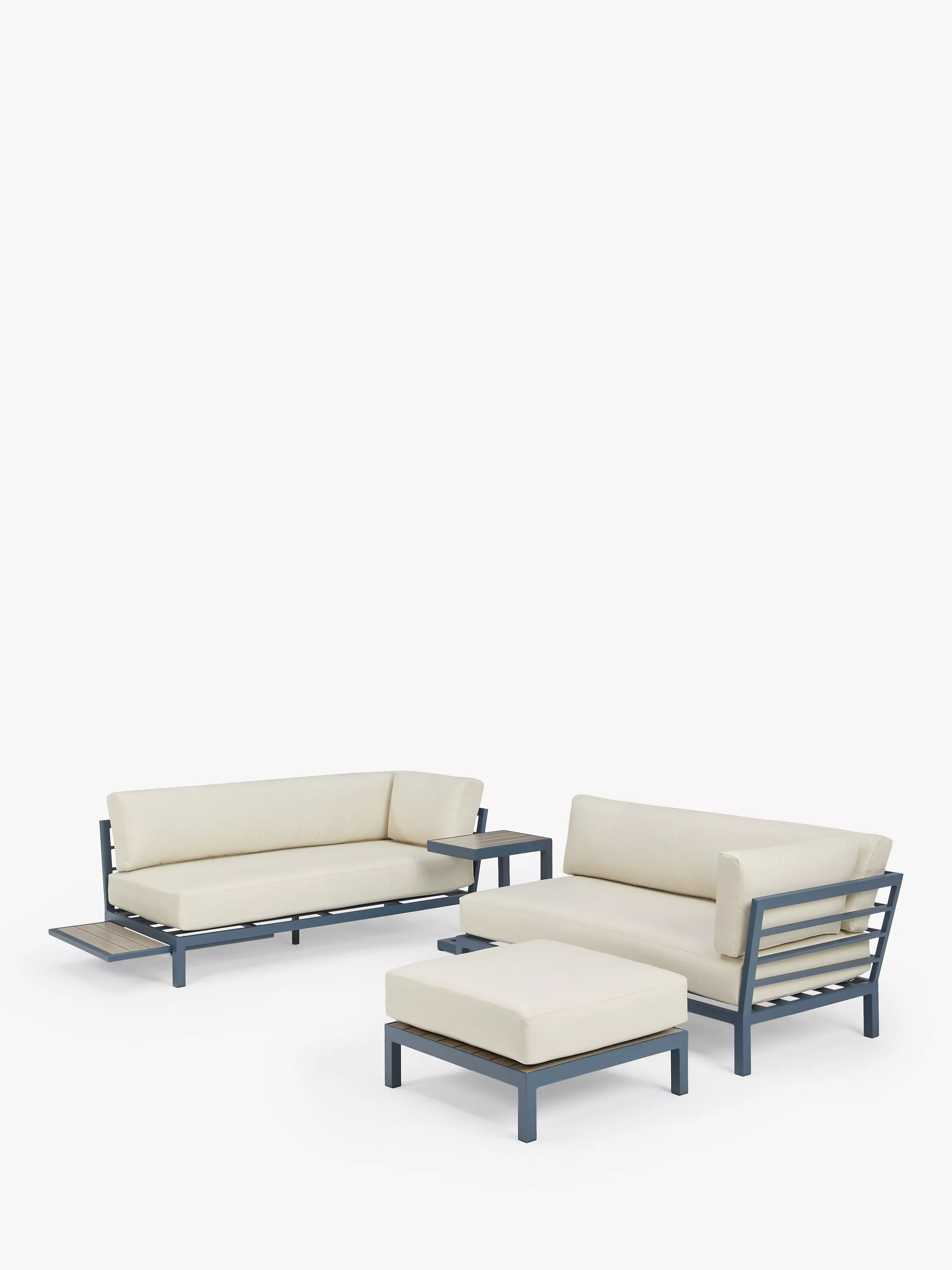 Our Platform four-seater corner modular lounging set can be arranged to suit your space, whether it's in the garden or conservatory. A modern design, it boasts wood-effect details on robust aluminium frames for a premium look. This lightweight, rust-proof and weather-resistant set includes a square coffee table with a wood-effect top, echoed on the side table and pull-out side table on one sofa end.