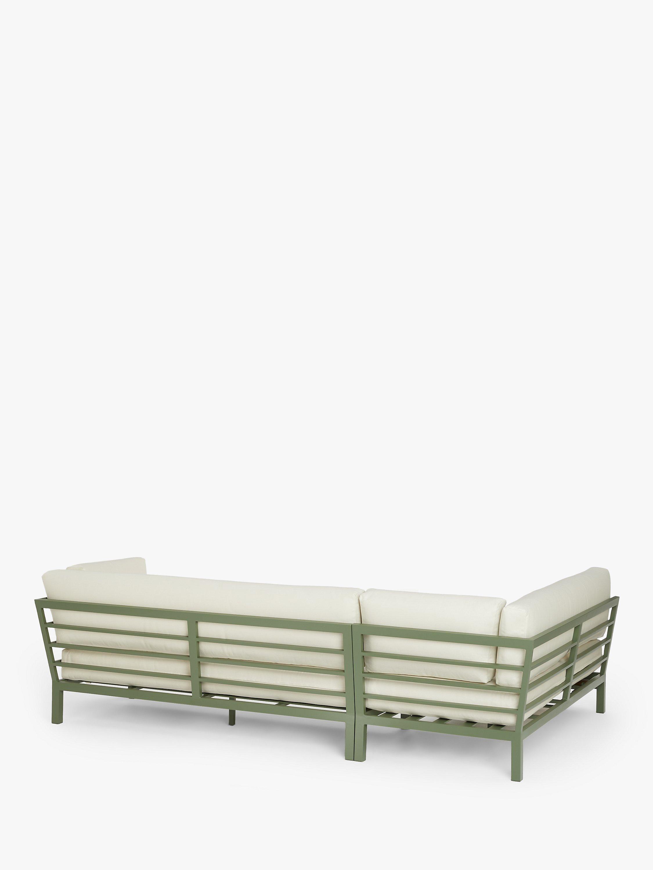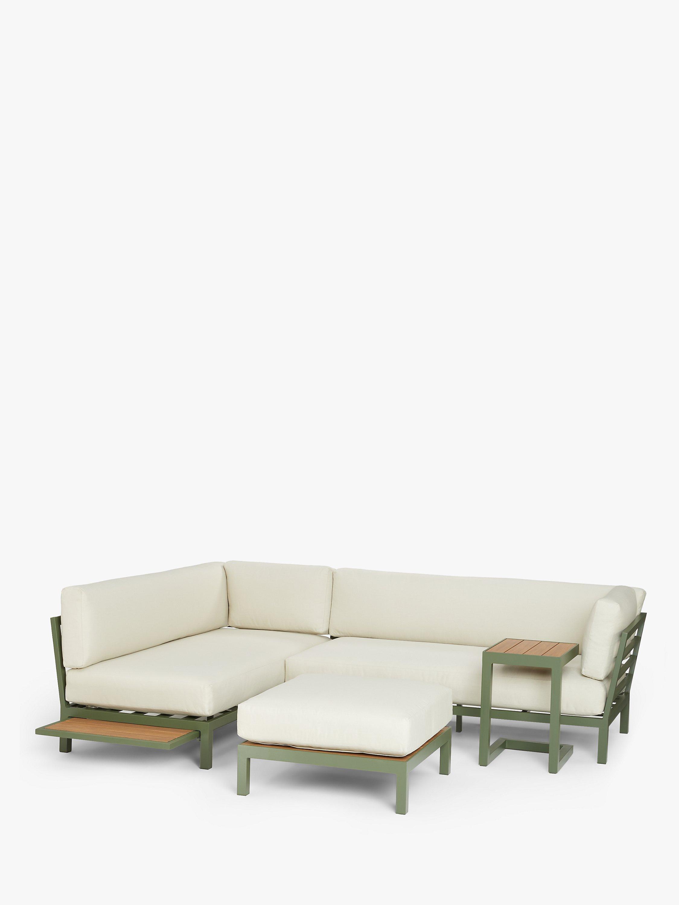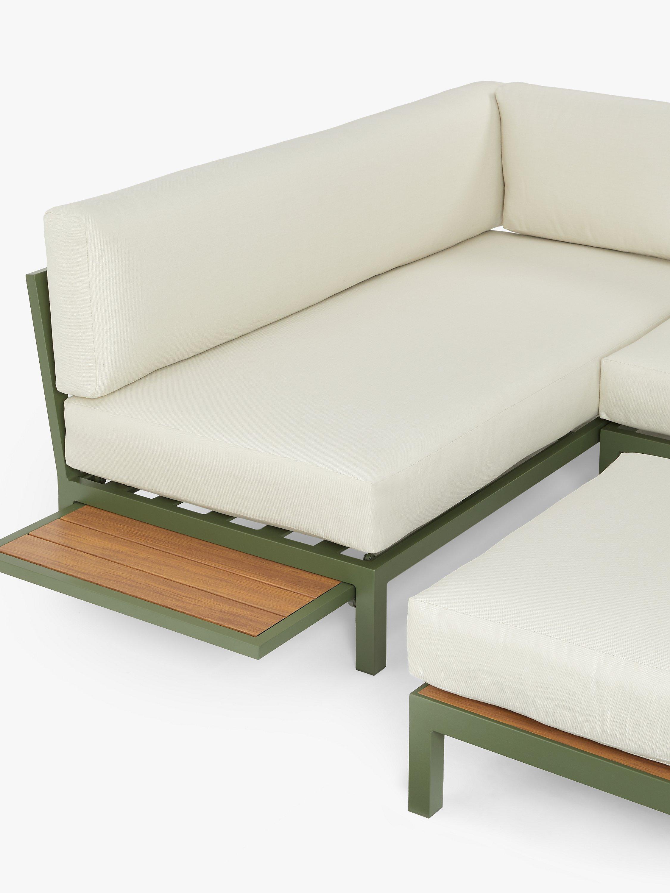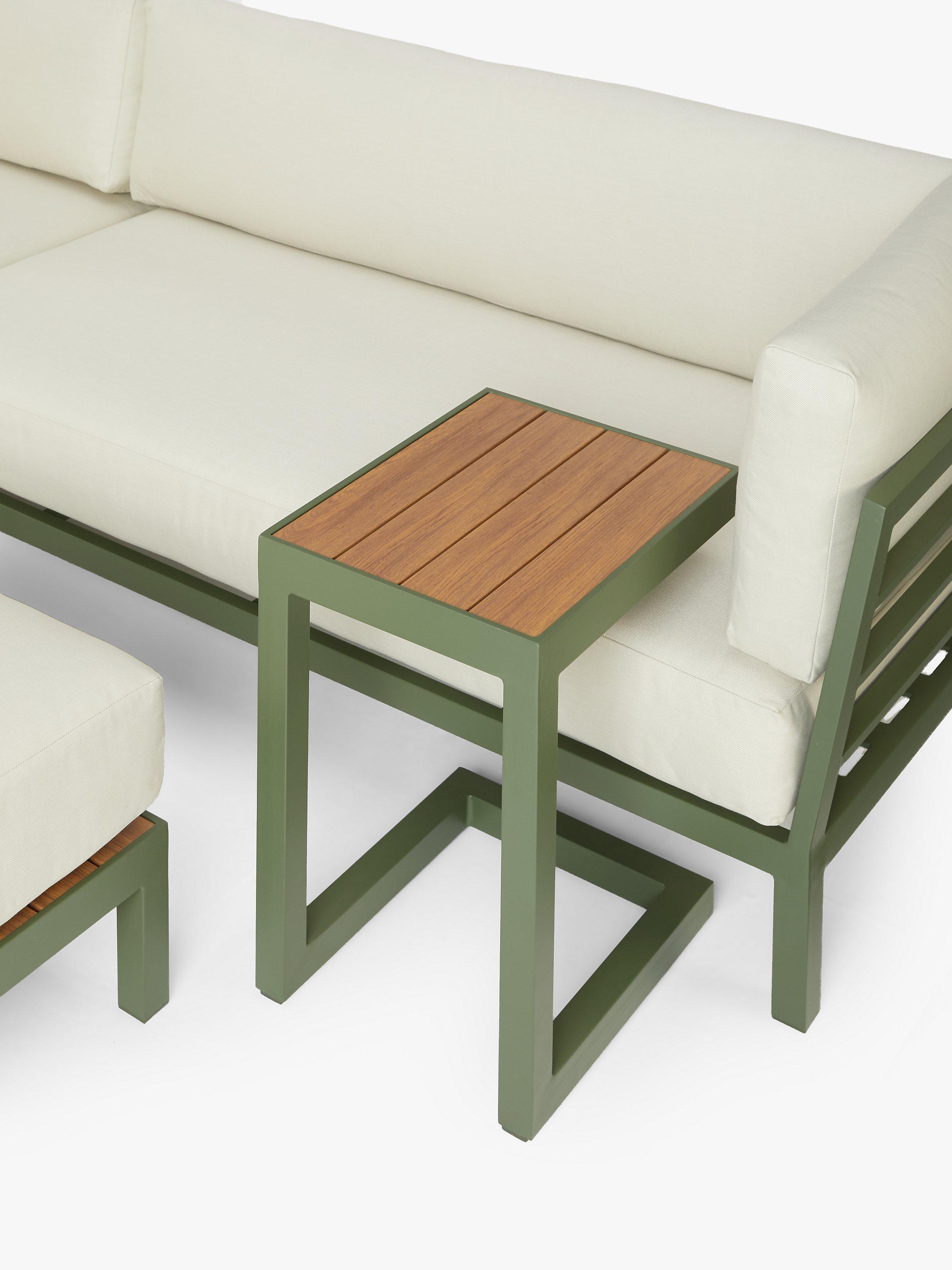 Our Platform four-seater corner modular lounging set can be arranged to suit your space, whether it's in the garden or conservatory. A modern design, it boasts wood-effect details on robust aluminium frames for a premium look. This lightweight, rust-proof and weather-resistant set includes a square coffee table with a wood-effect top, echoed on the side table and pull-out side table on one sofa end.