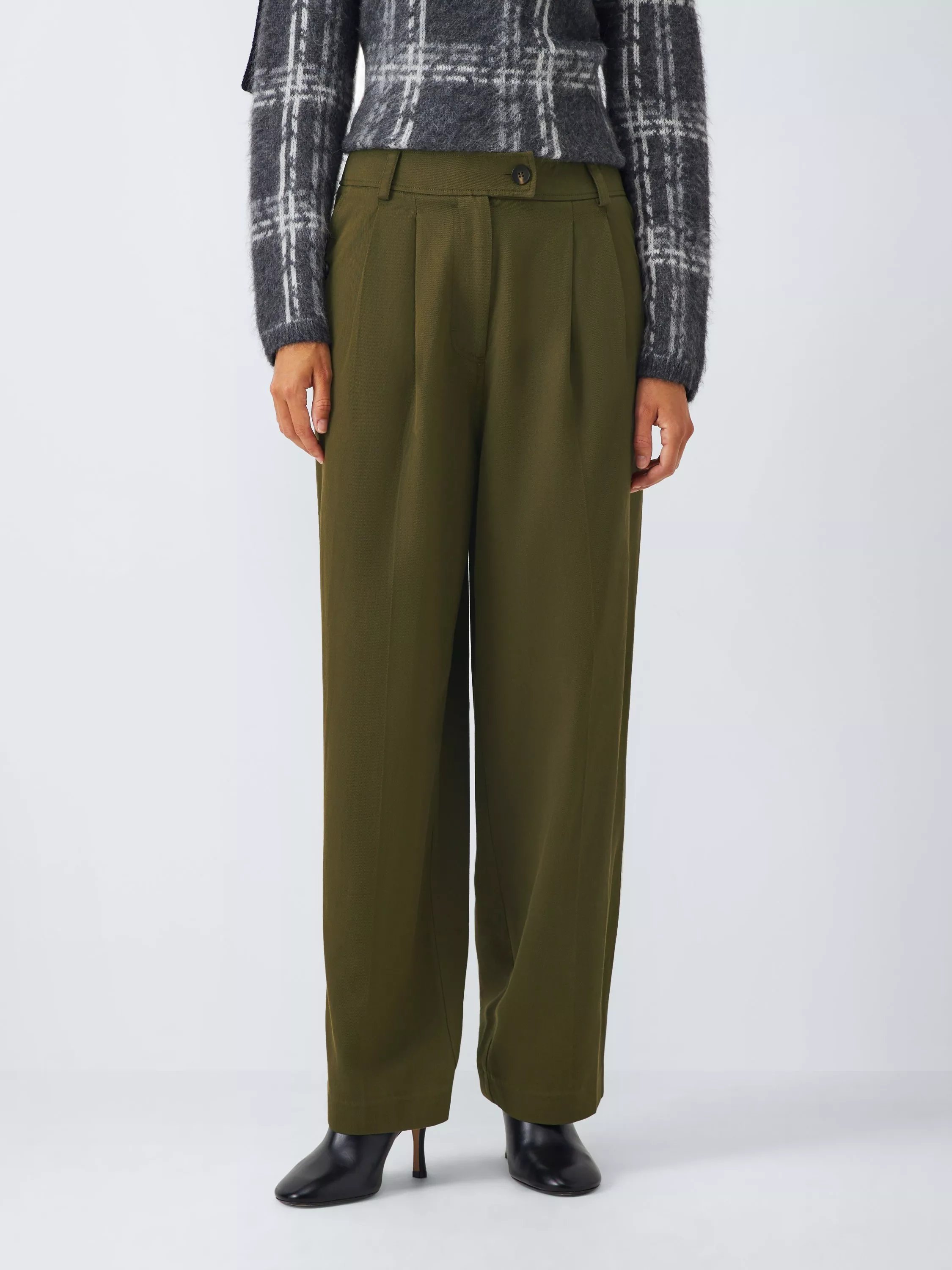 Woven cotton-blend trousers with pleated front details. Buttons on the pockets add a utility cargo-inspired look.