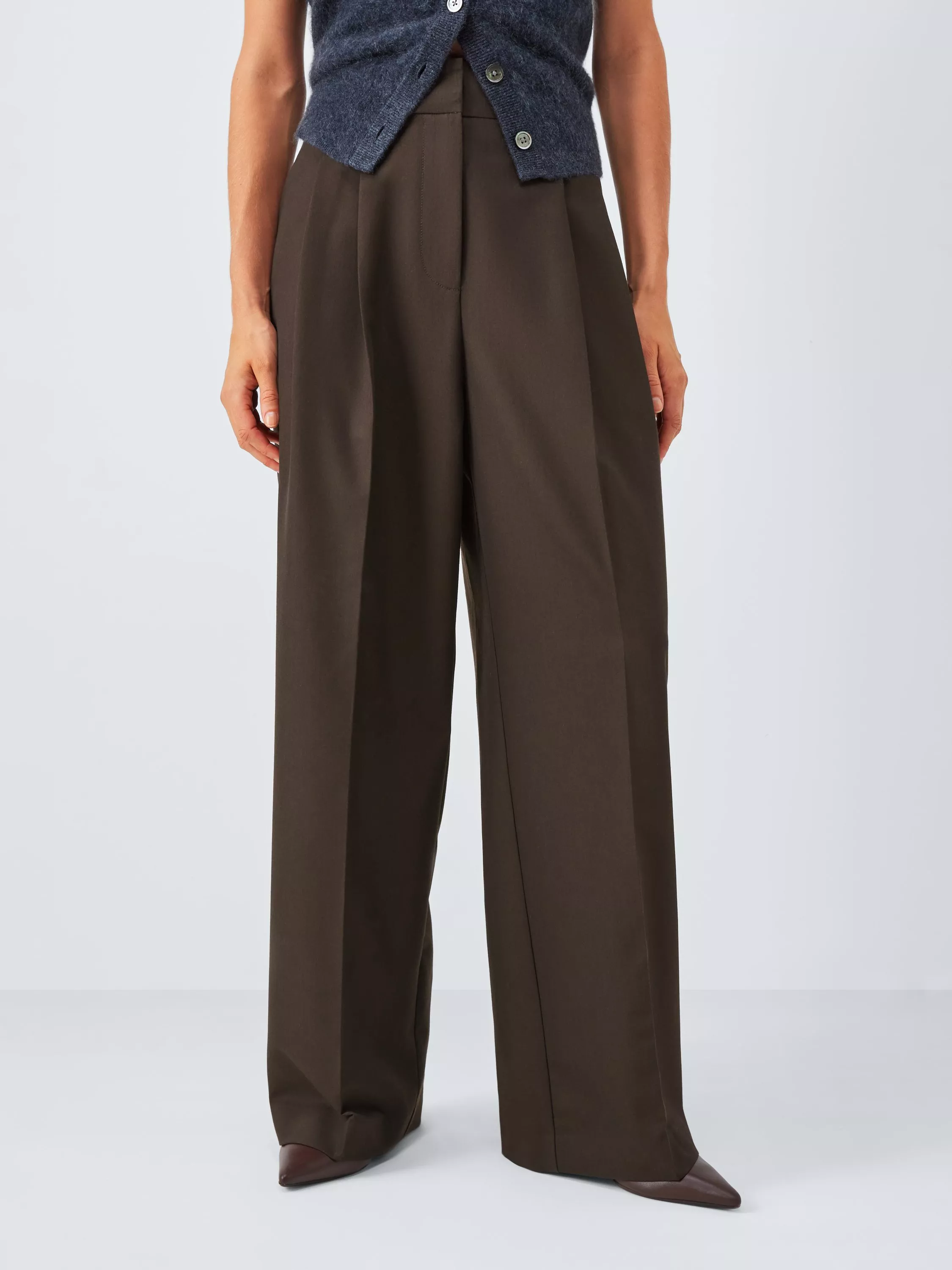 Wide-leg plain trousers with pleated details on the leg. Made with belt loops and a concealed zip fly.