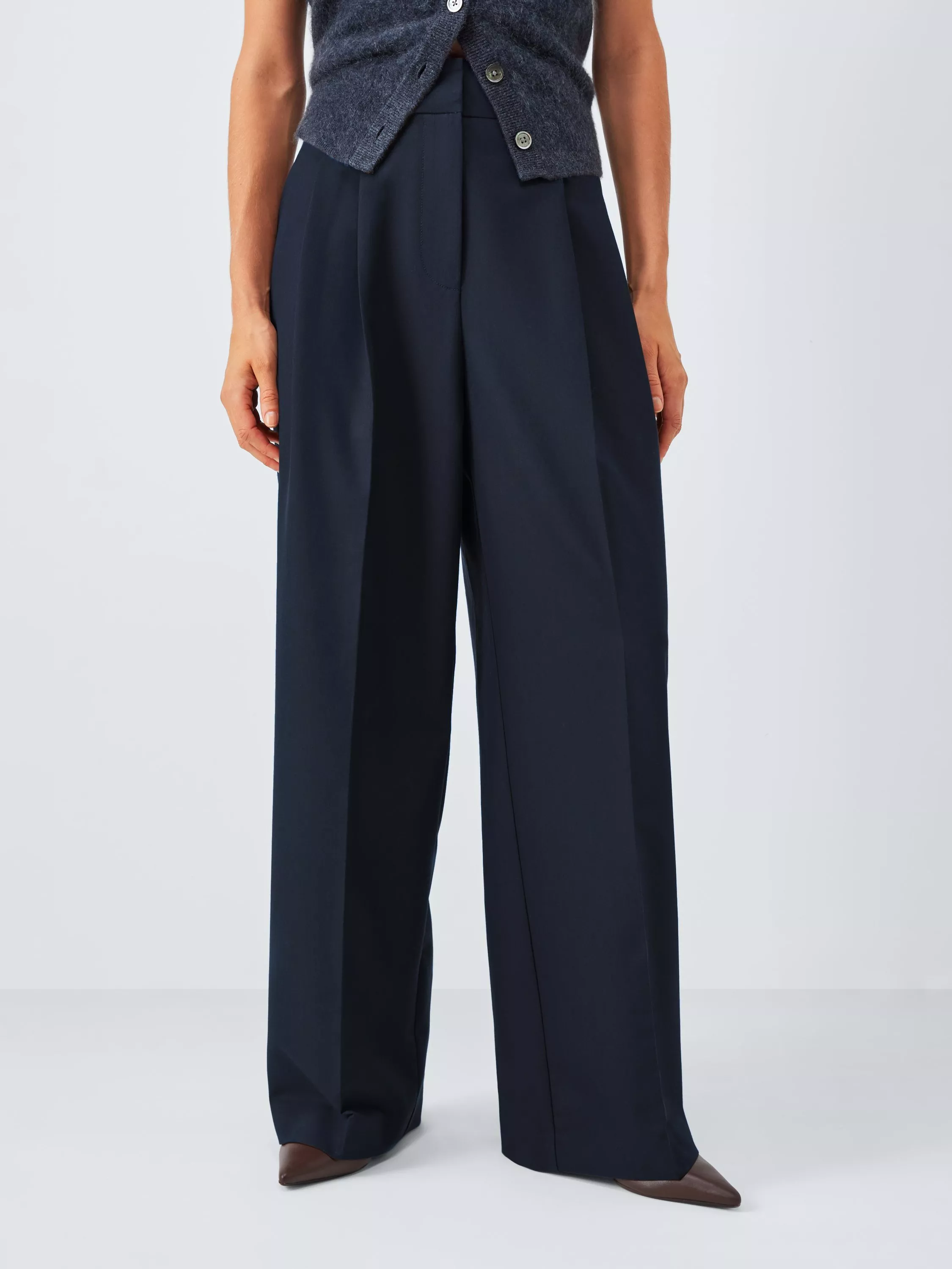 Wide-leg plain trousers with pleated details on the leg. Made with belt loops and a concealed zip fly.