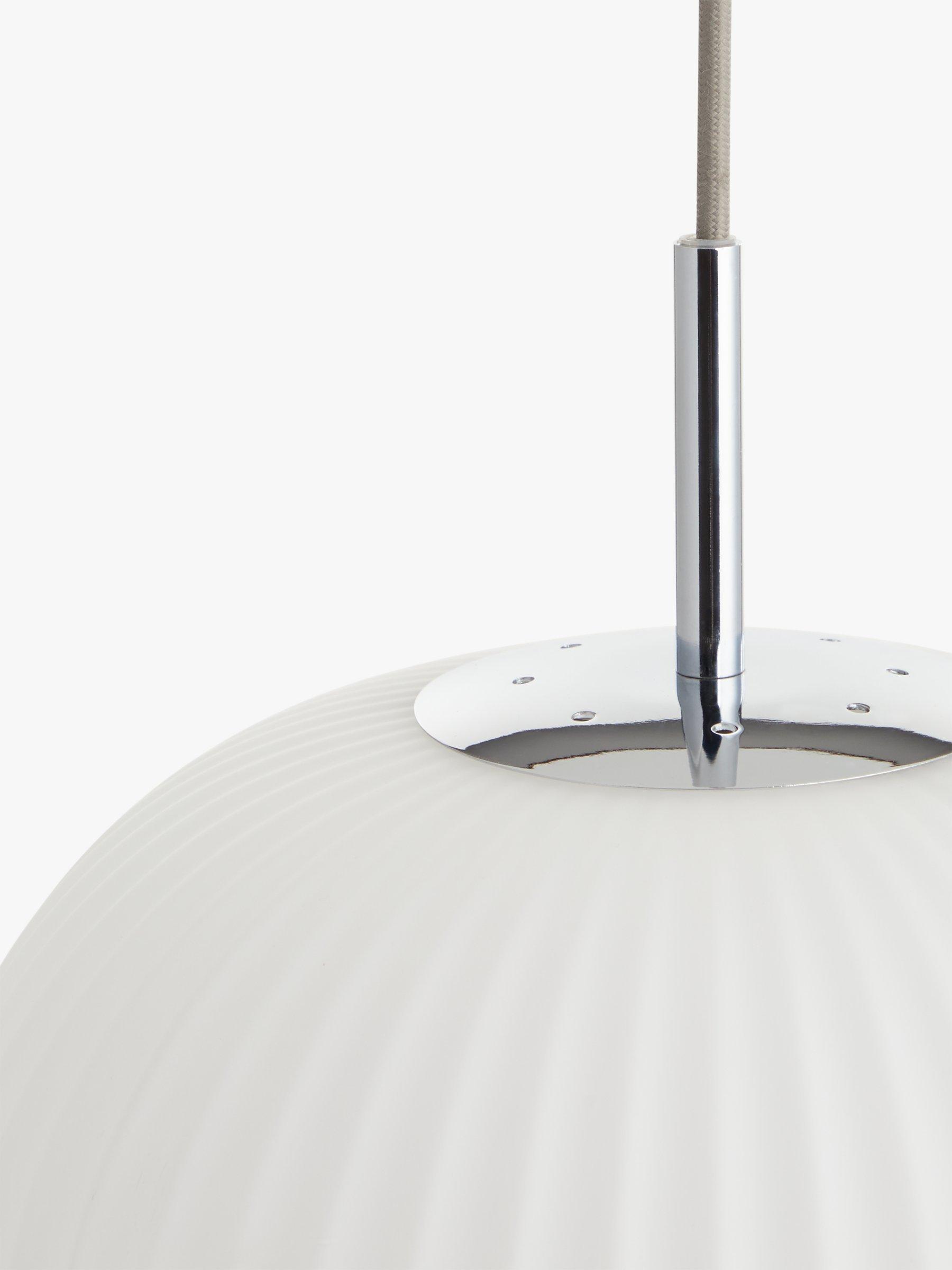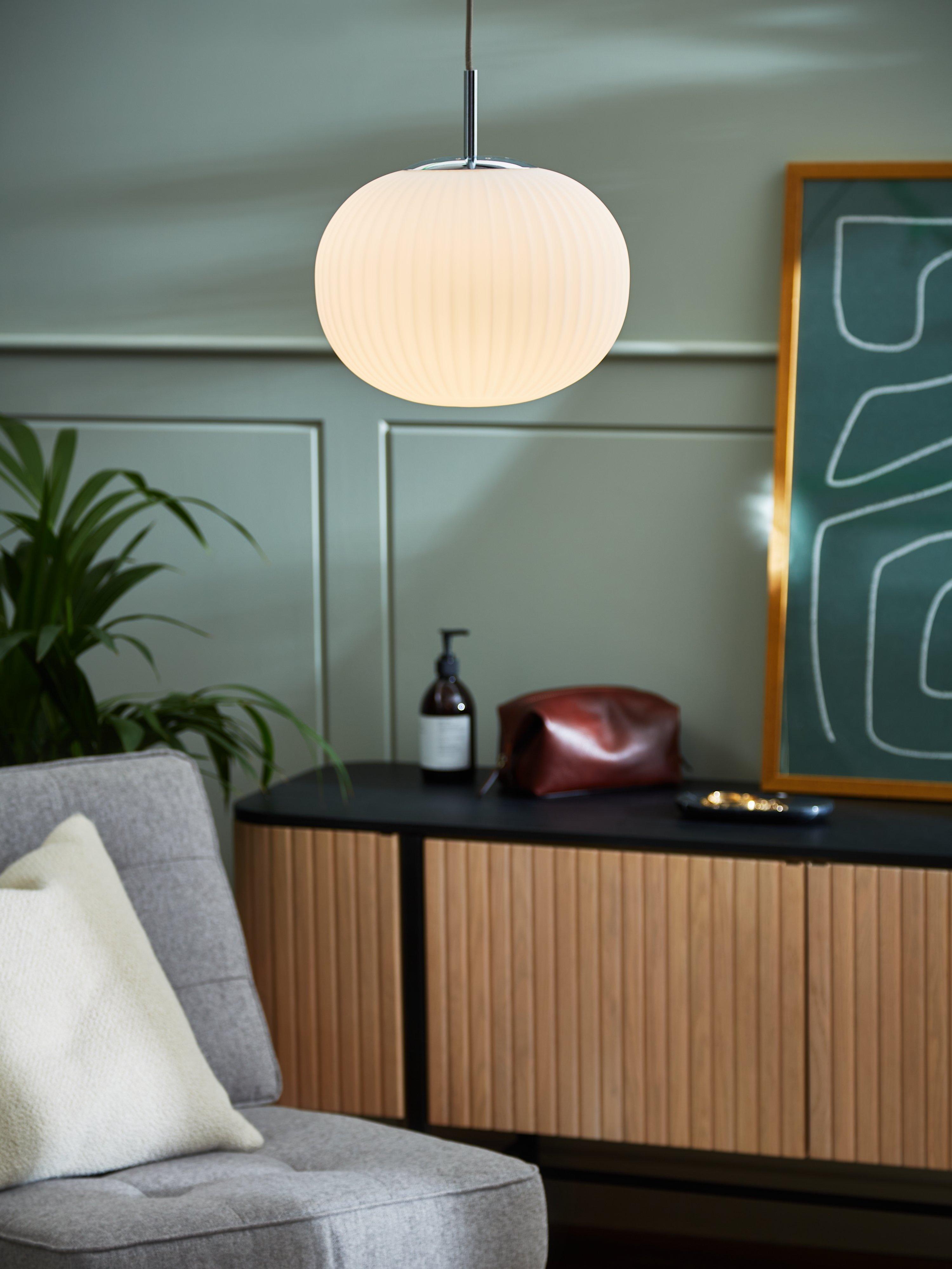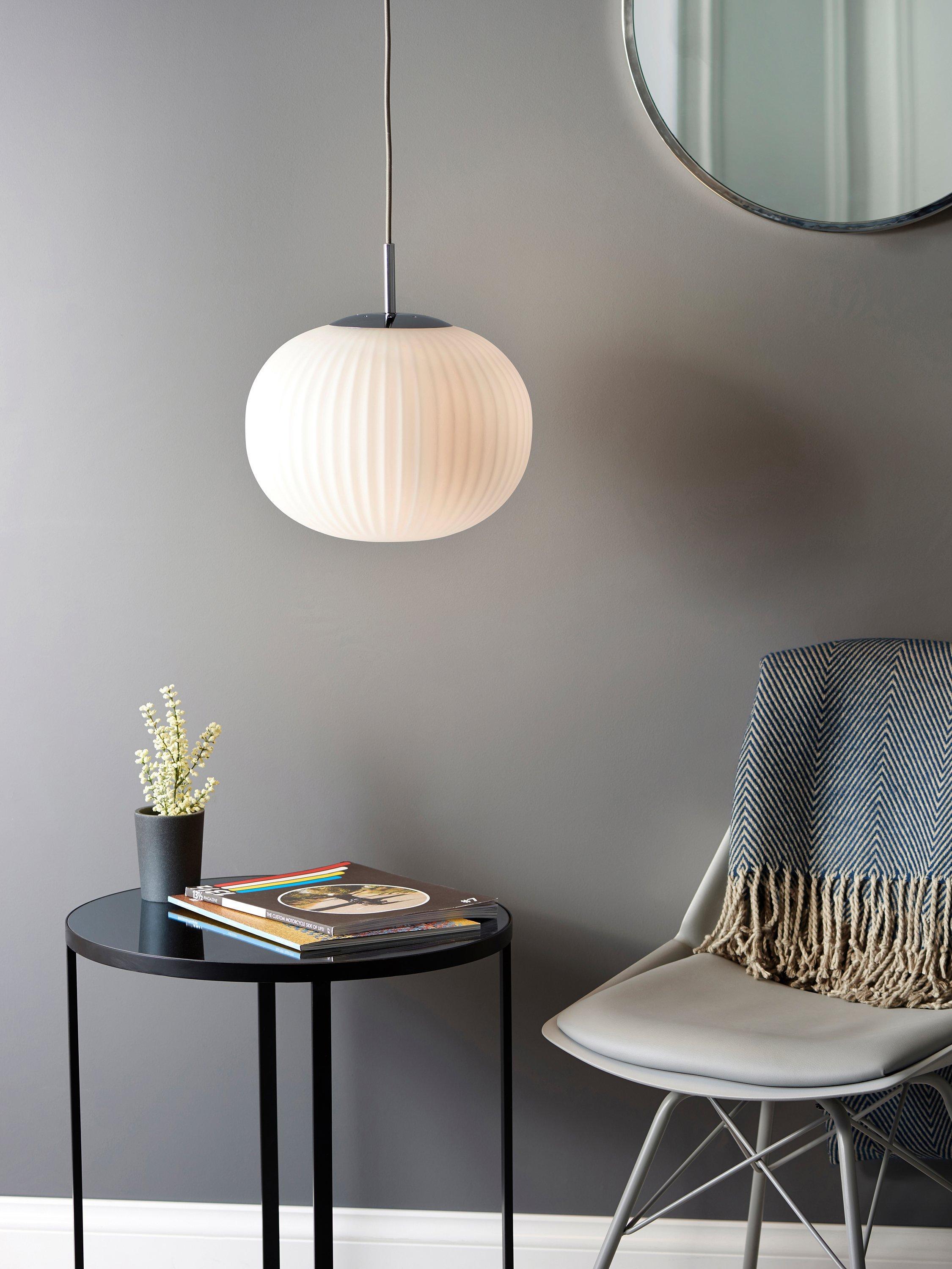 This contemporary pendant will enhance any living area, thanks to its natural and softly curved design. The globe shade is made from matt opal duplex glass that's accented with ribbed detailing for a subtle texture, creating depth when illuminated. Providing a soft, ambient wash of light, the chrome plated details enhance its smart and modern style, and the braided flex allows you to install it perfectly within your space. Place it directly over dining tables for statement interior styling.