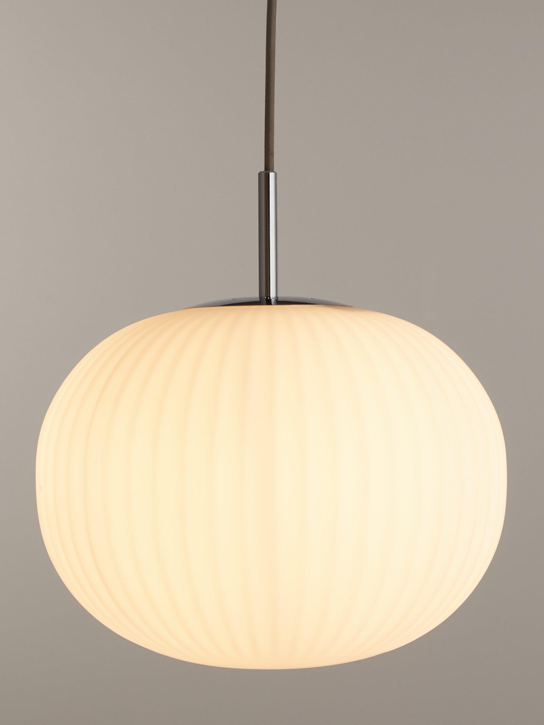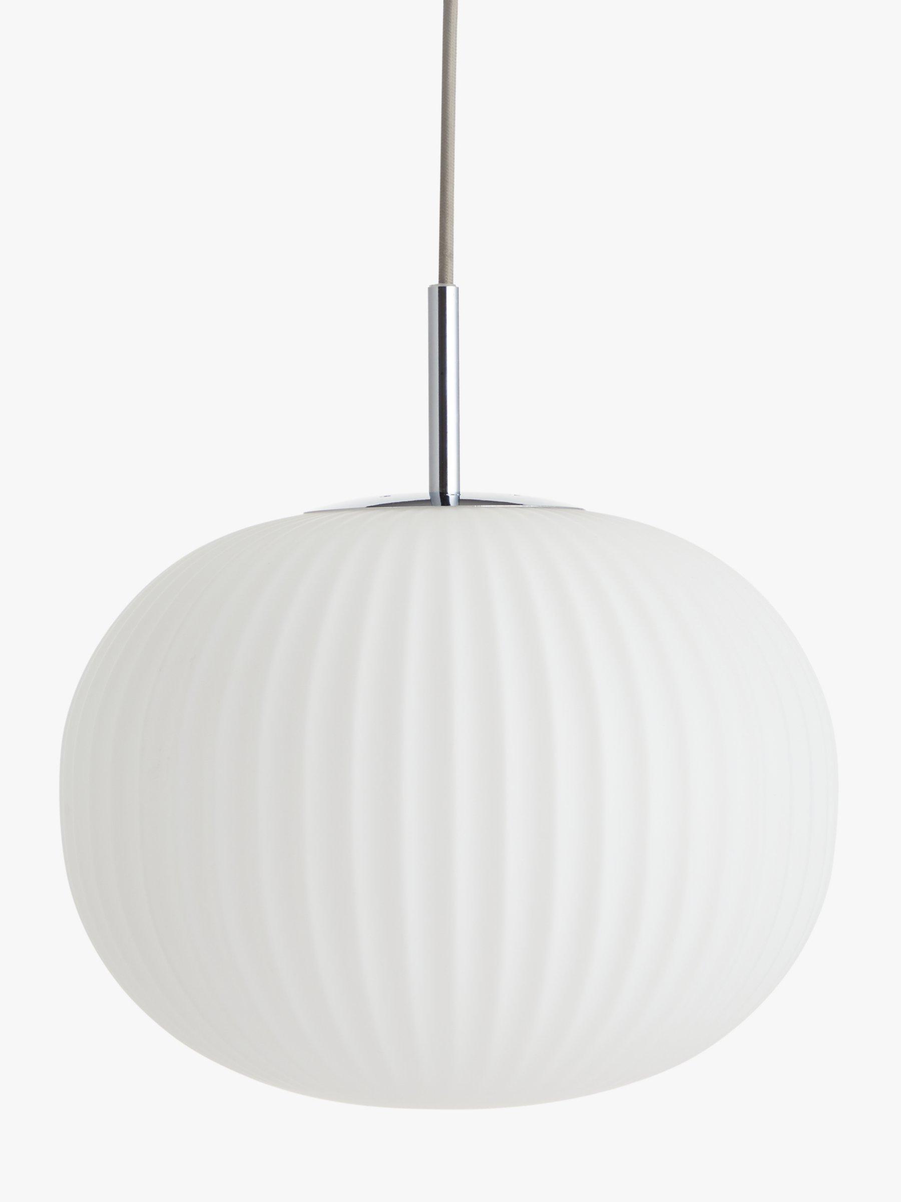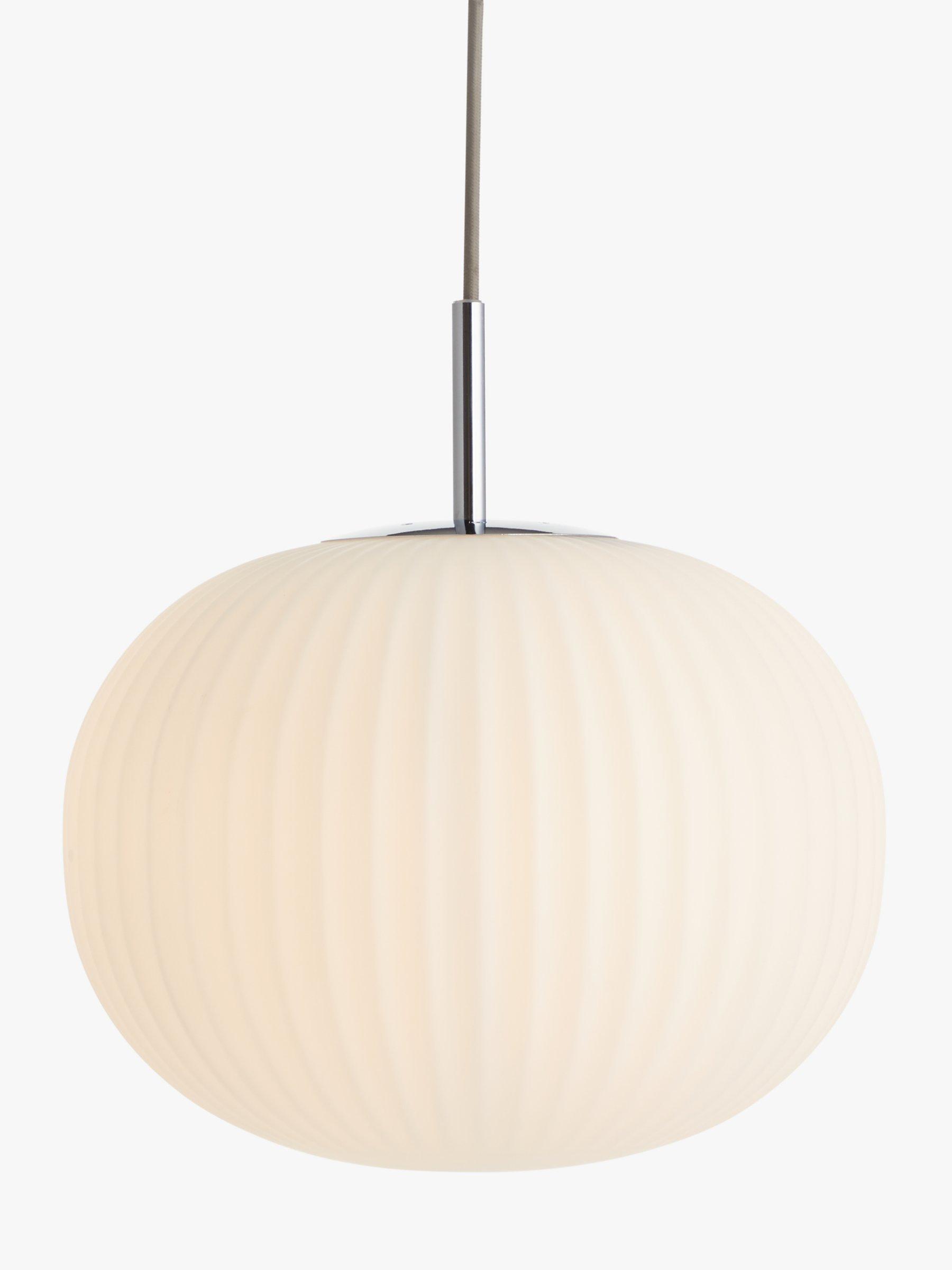 This contemporary pendant will enhance any living area, thanks to its natural and softly curved design. The globe shade is made from matt opal duplex glass that's accented with ribbed detailing for a subtle texture, creating depth when illuminated. Providing a soft, ambient wash of light, the chrome plated details enhance its smart and modern style, and the braided flex allows you to install it perfectly within your space. Place it directly over dining tables for statement interior styling.