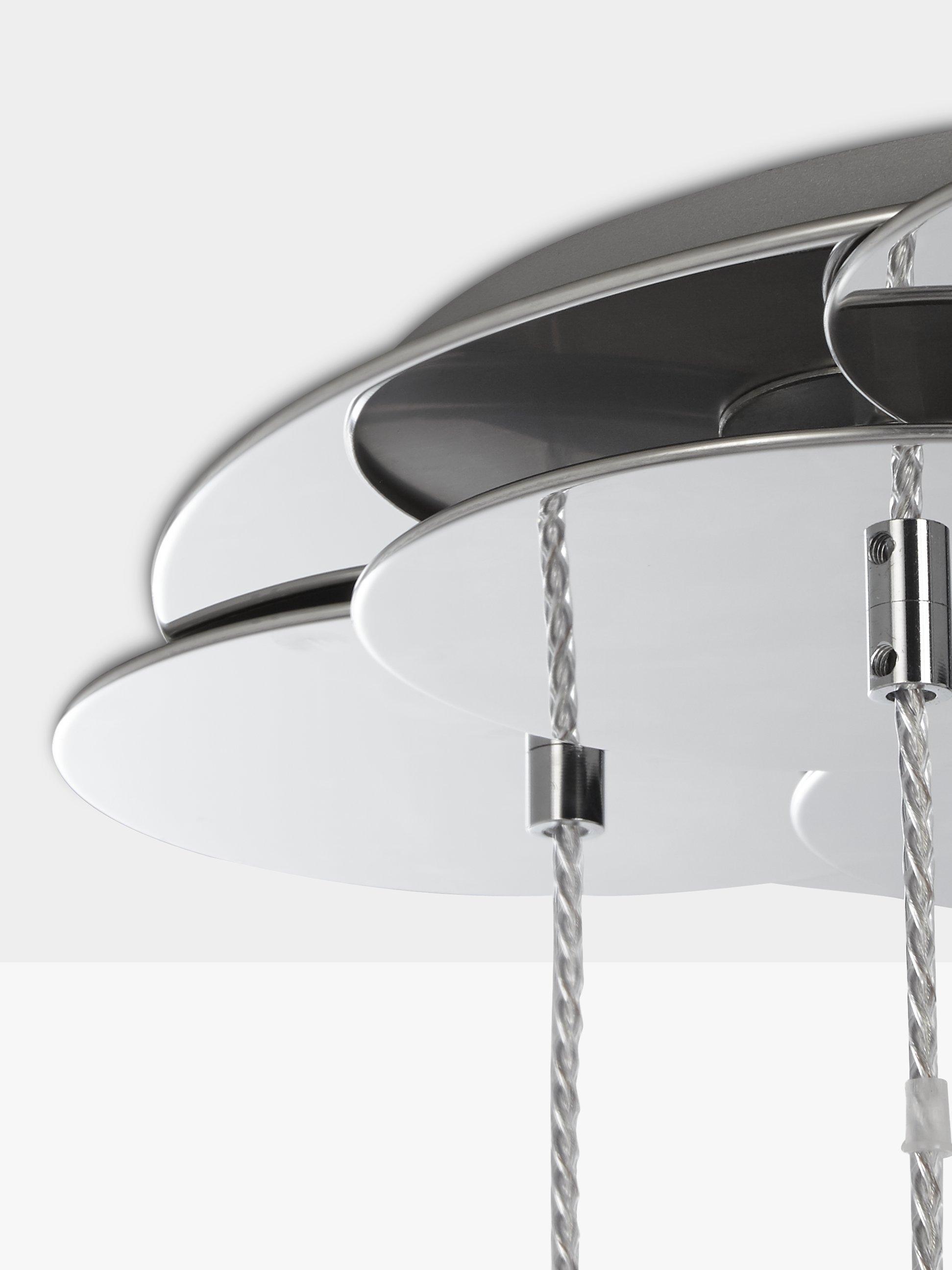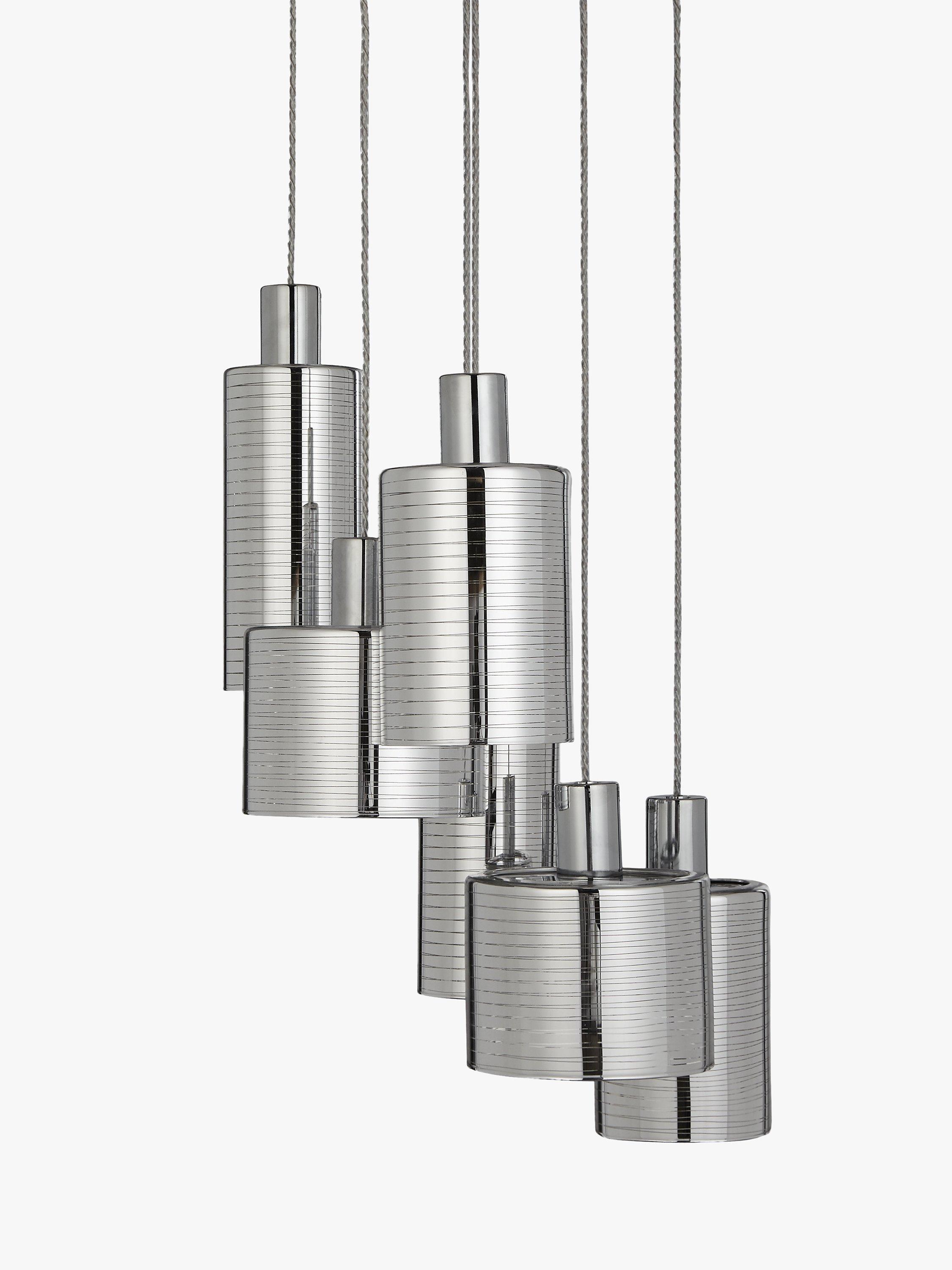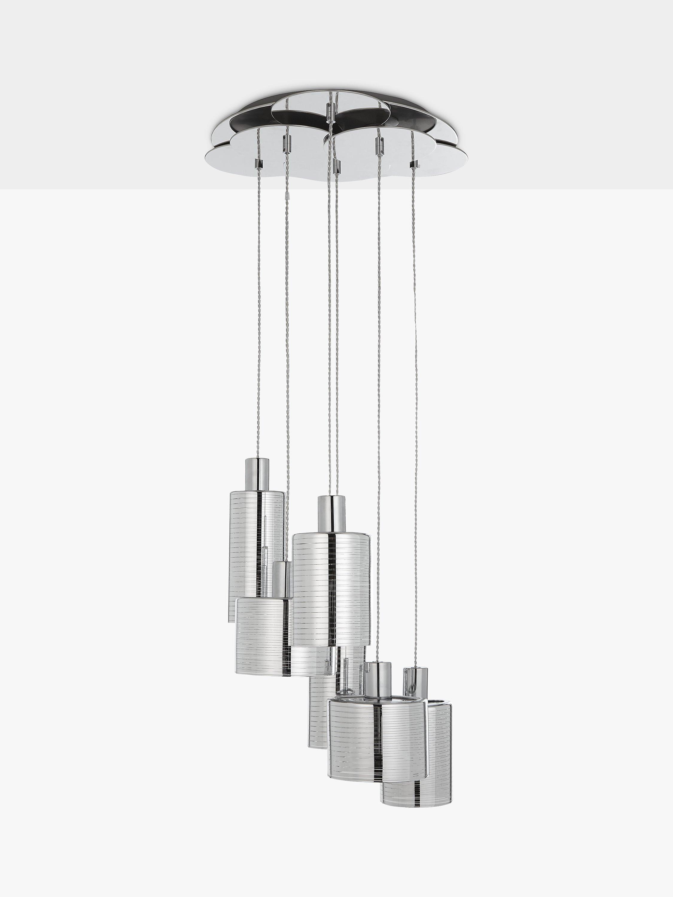 Lend a contemporary update to your lighting with our Pluto cluster ceiling light. This eye-catching fitting is designed with 6 asymmetric pendants, each decorated with an overlapping disk detail. The inner plating of each shade creates a smoked effect when the light is switched on.
