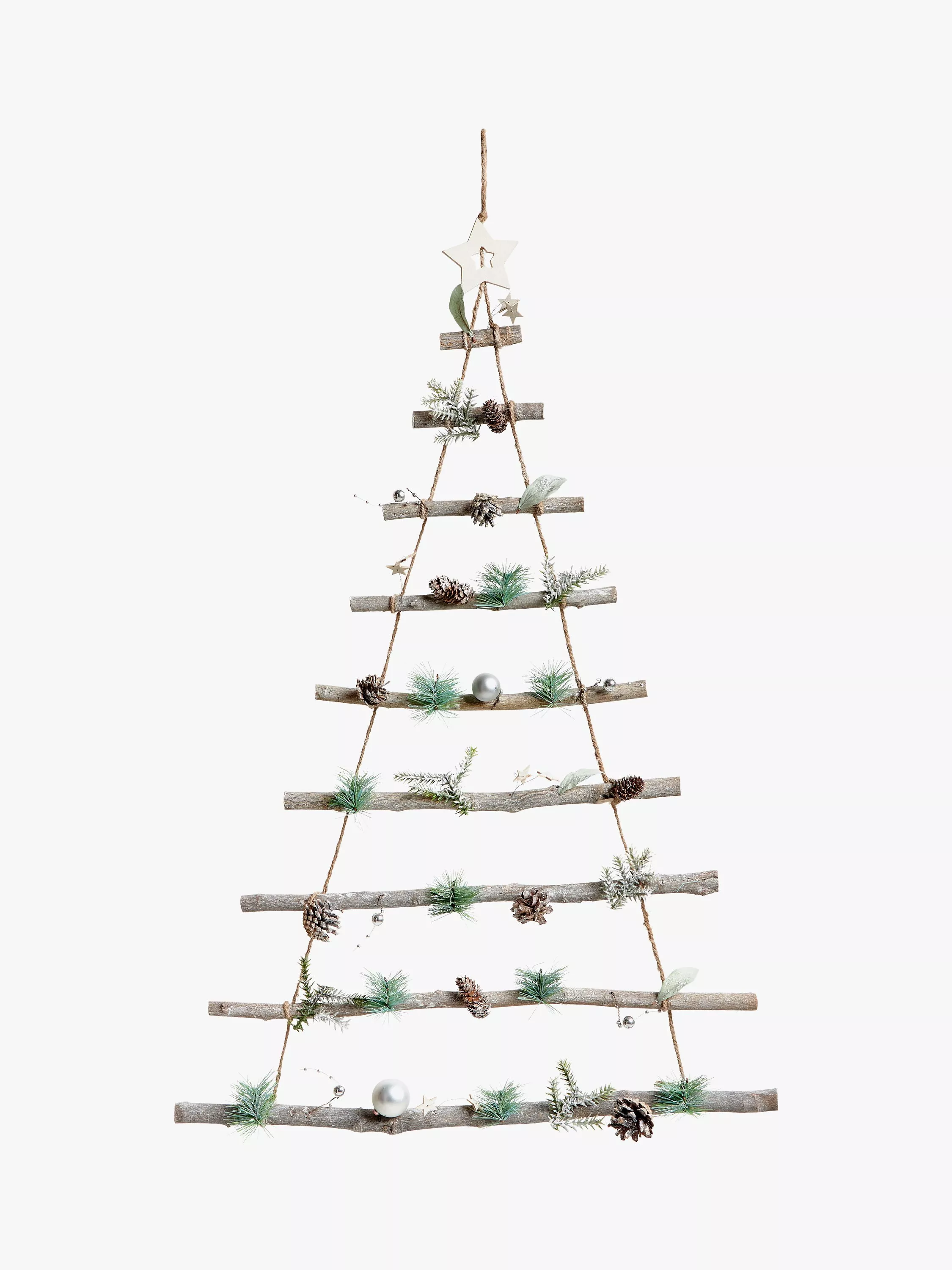 This attractive and unusual wall-hanging decoration comes in the form of a "ladder" tree, made from painted twigs and string and decorated with baubles, sprigs, berries and pine cones.