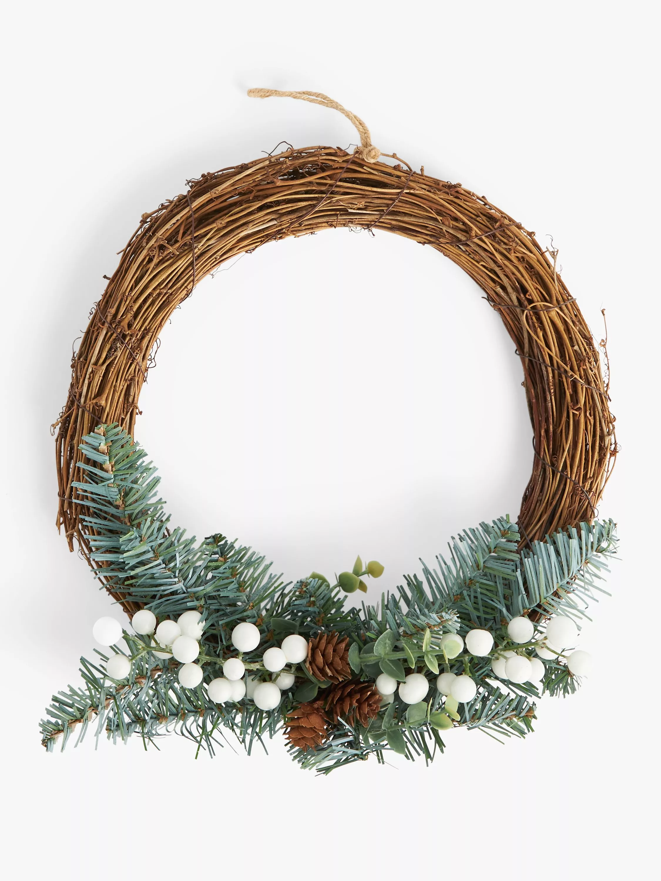 Mini pine cones and sprigs of eucalyptus nestle among pine sprigs on this rattan half wreath.