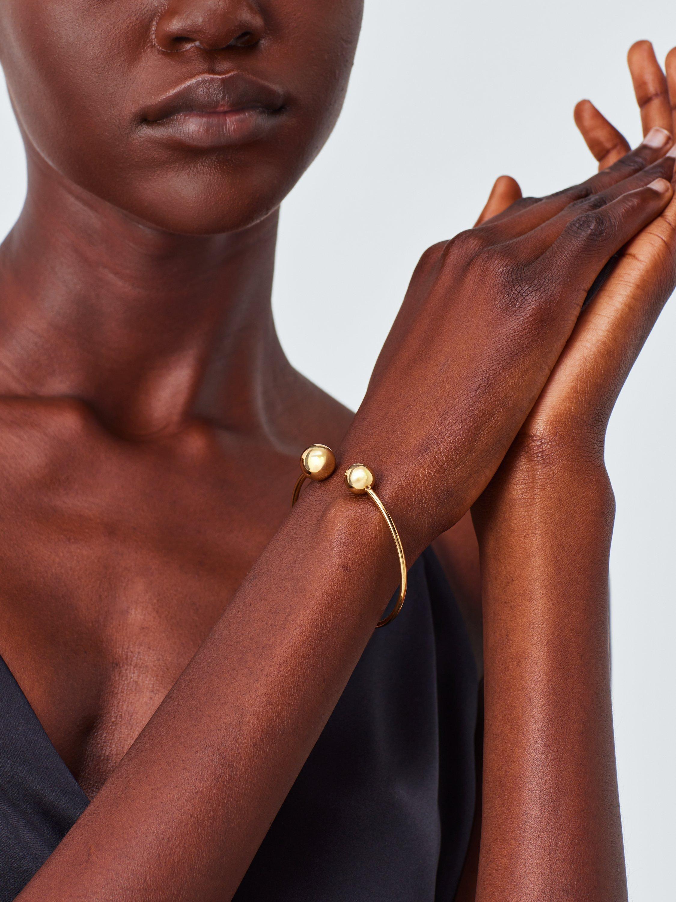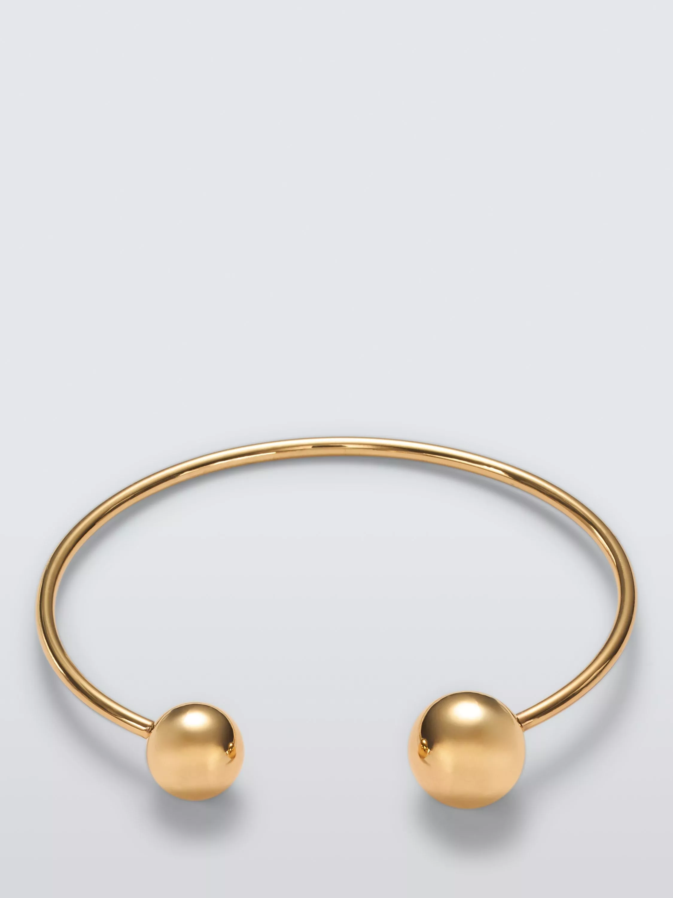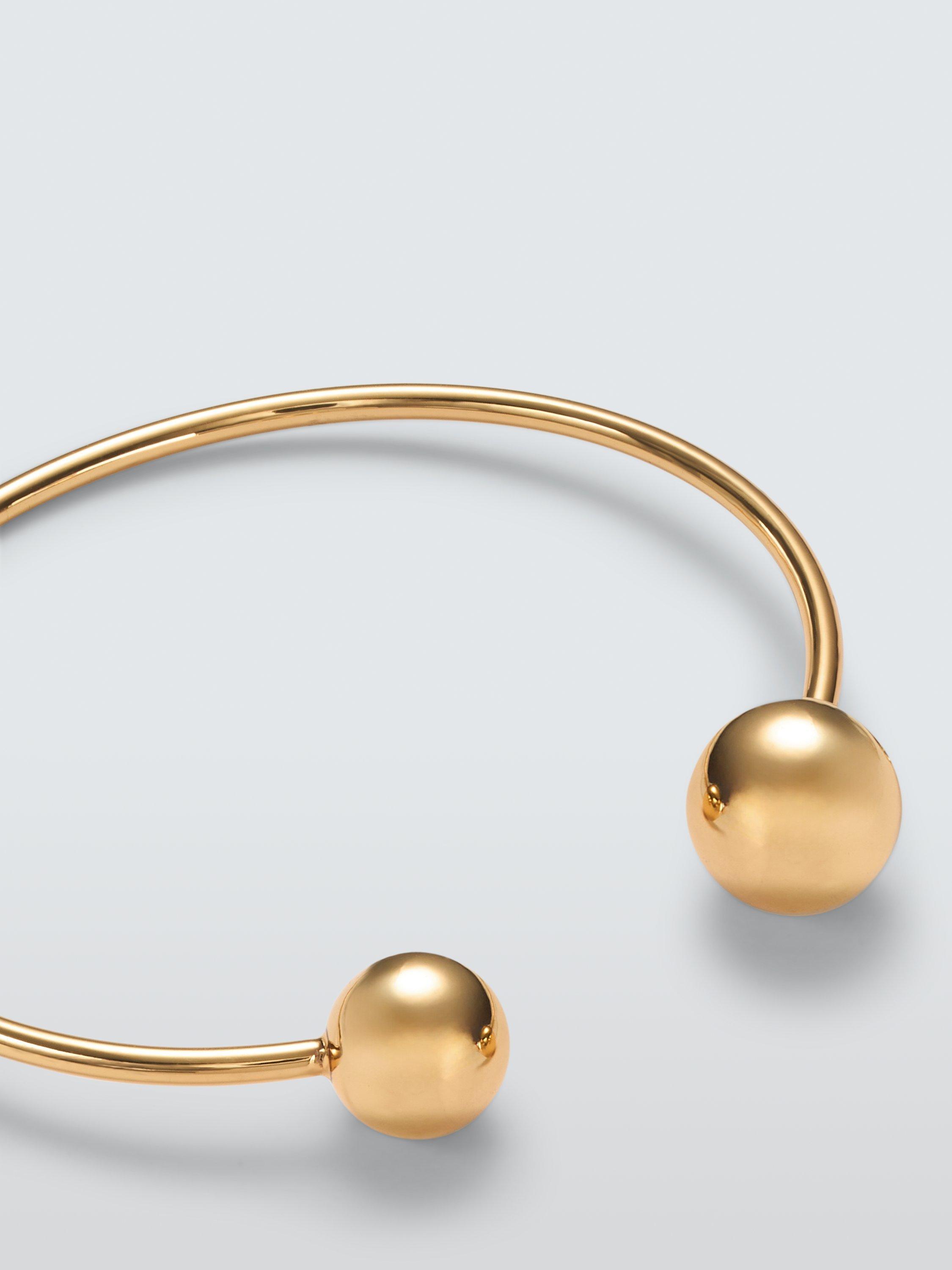 A wear anytime, anywhere polished open bangle with sphere ends.