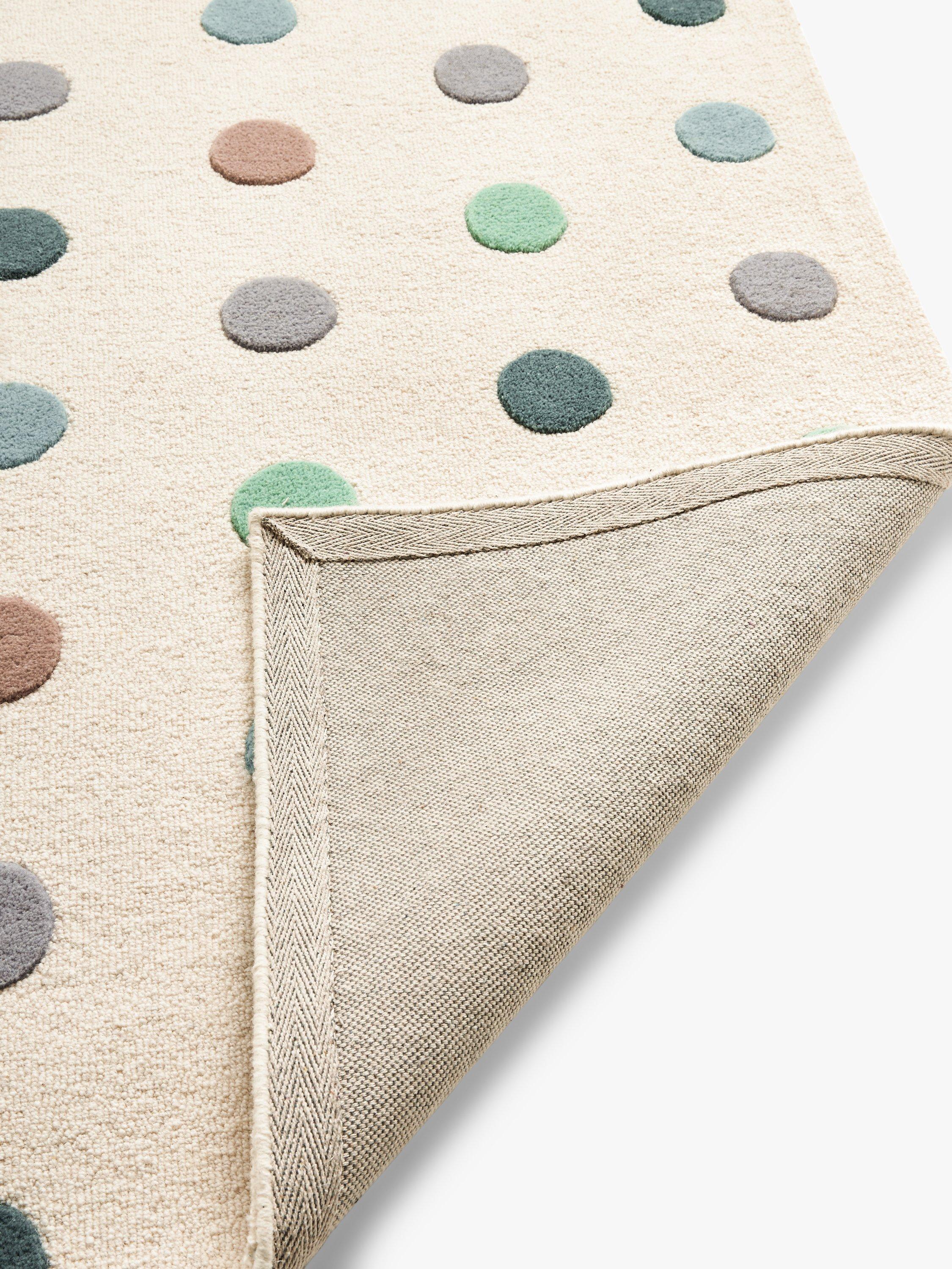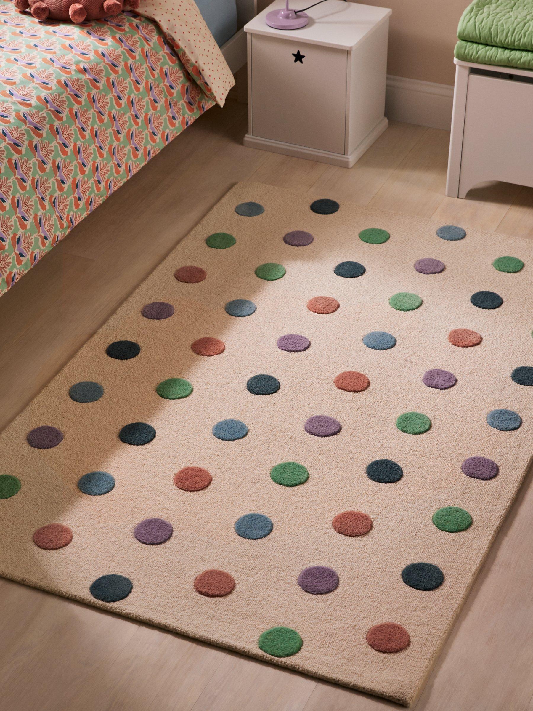 Coloured Polka dots never go out of style. Made with a plush wool pile, this is a perfect playroom rug.