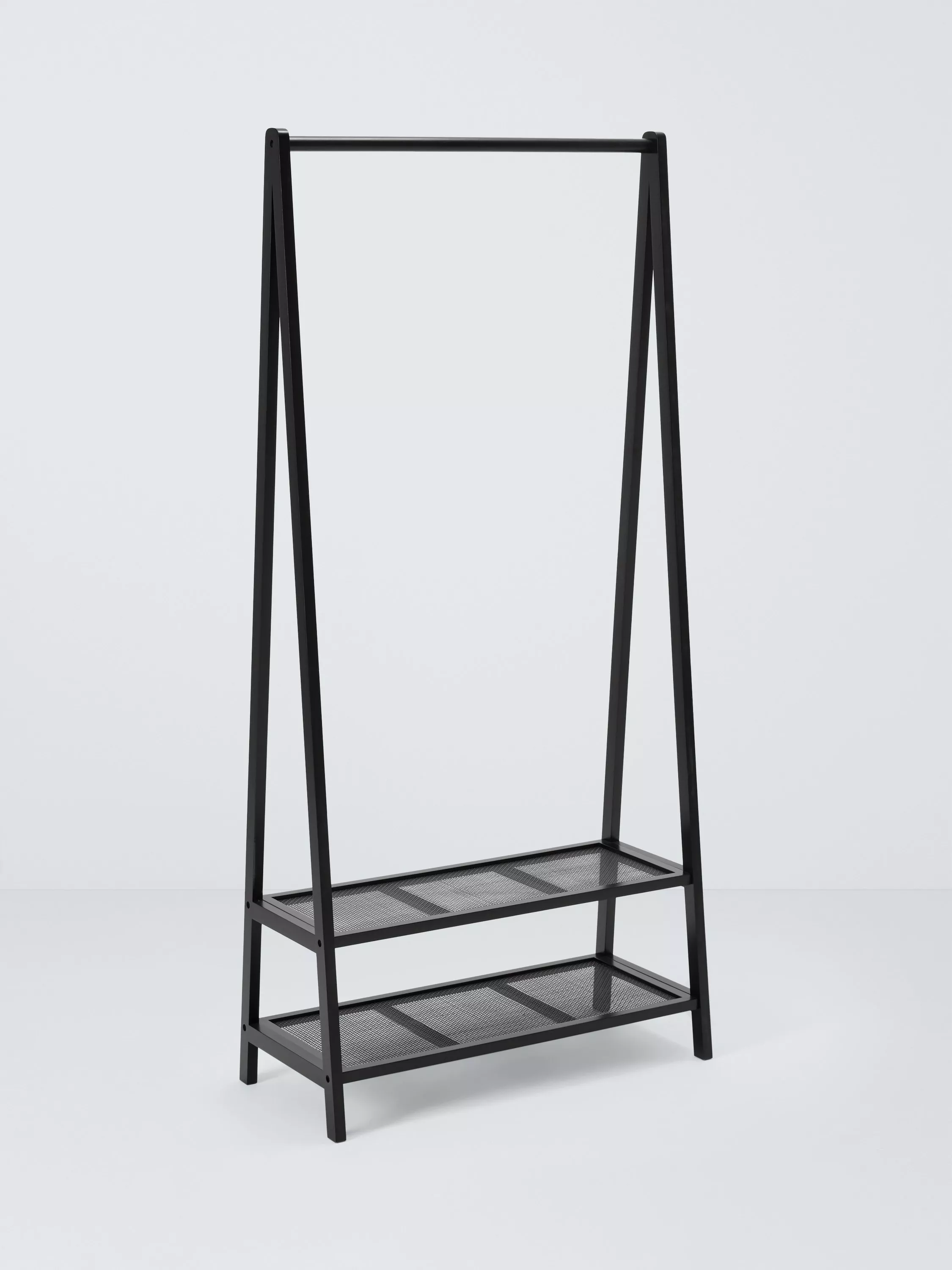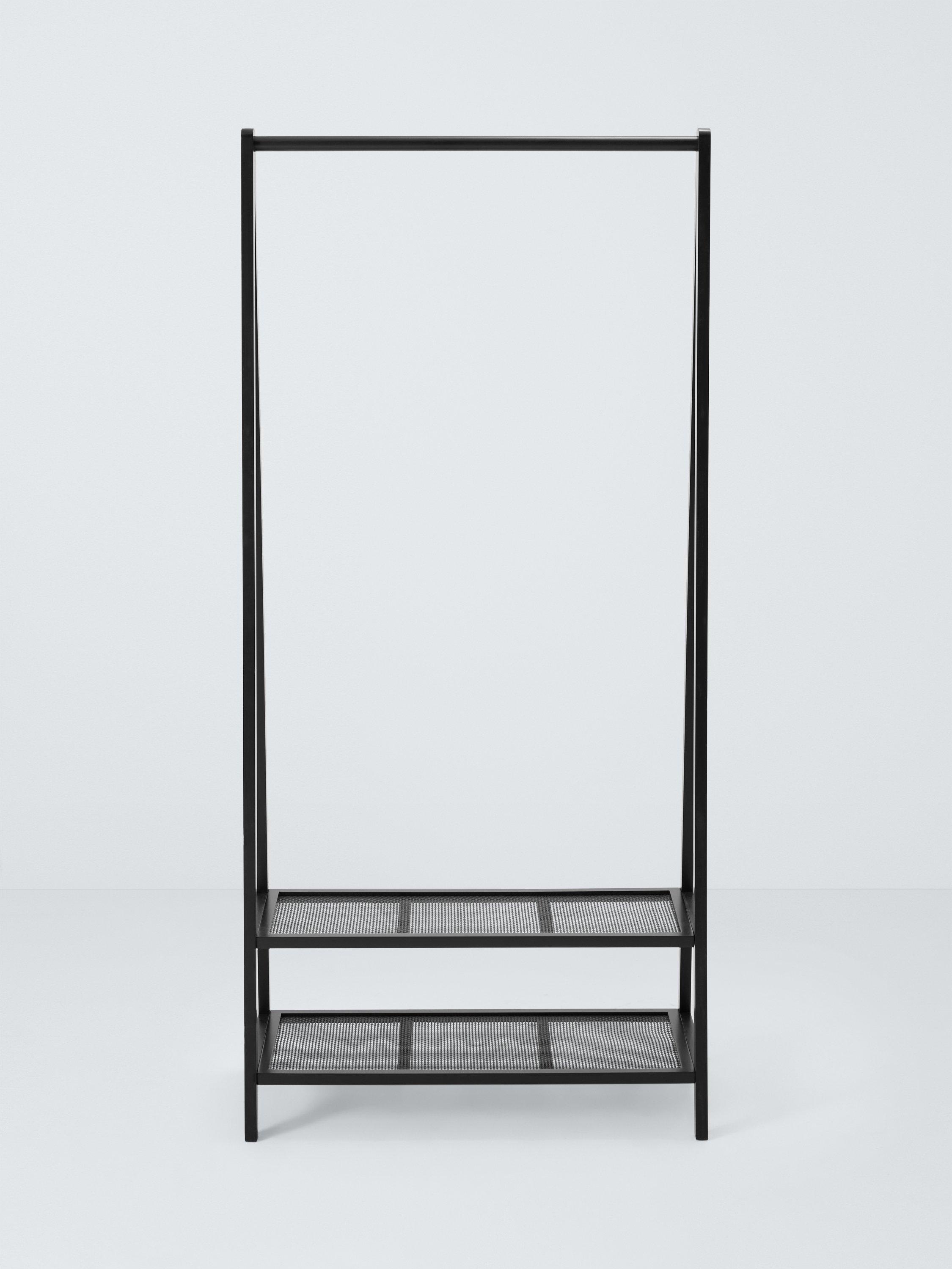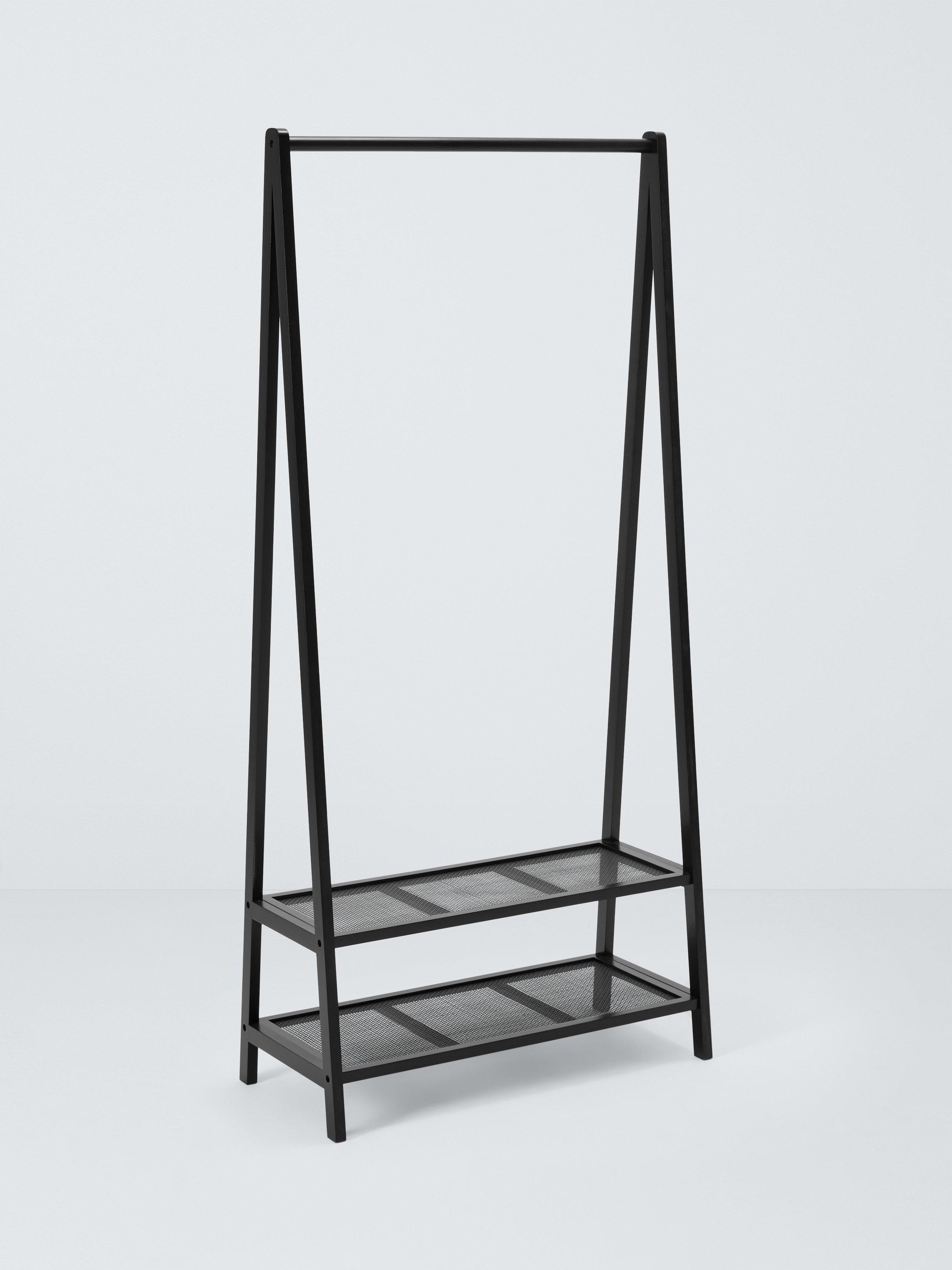 This black finish clothes rail stand has two attractive poly rattan shelves at the base for storing shoes, bags and other accessories.