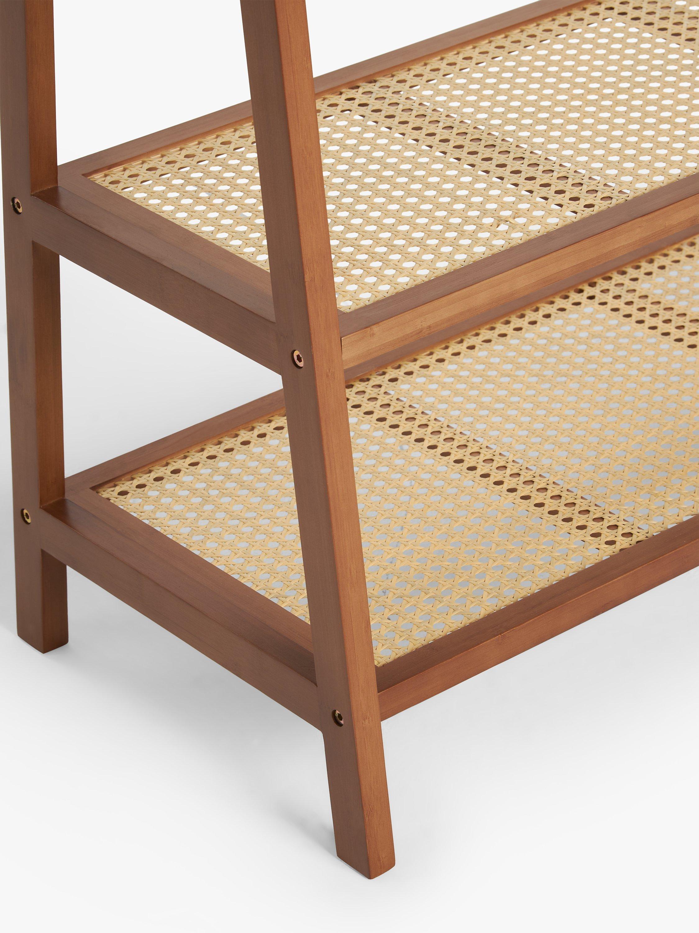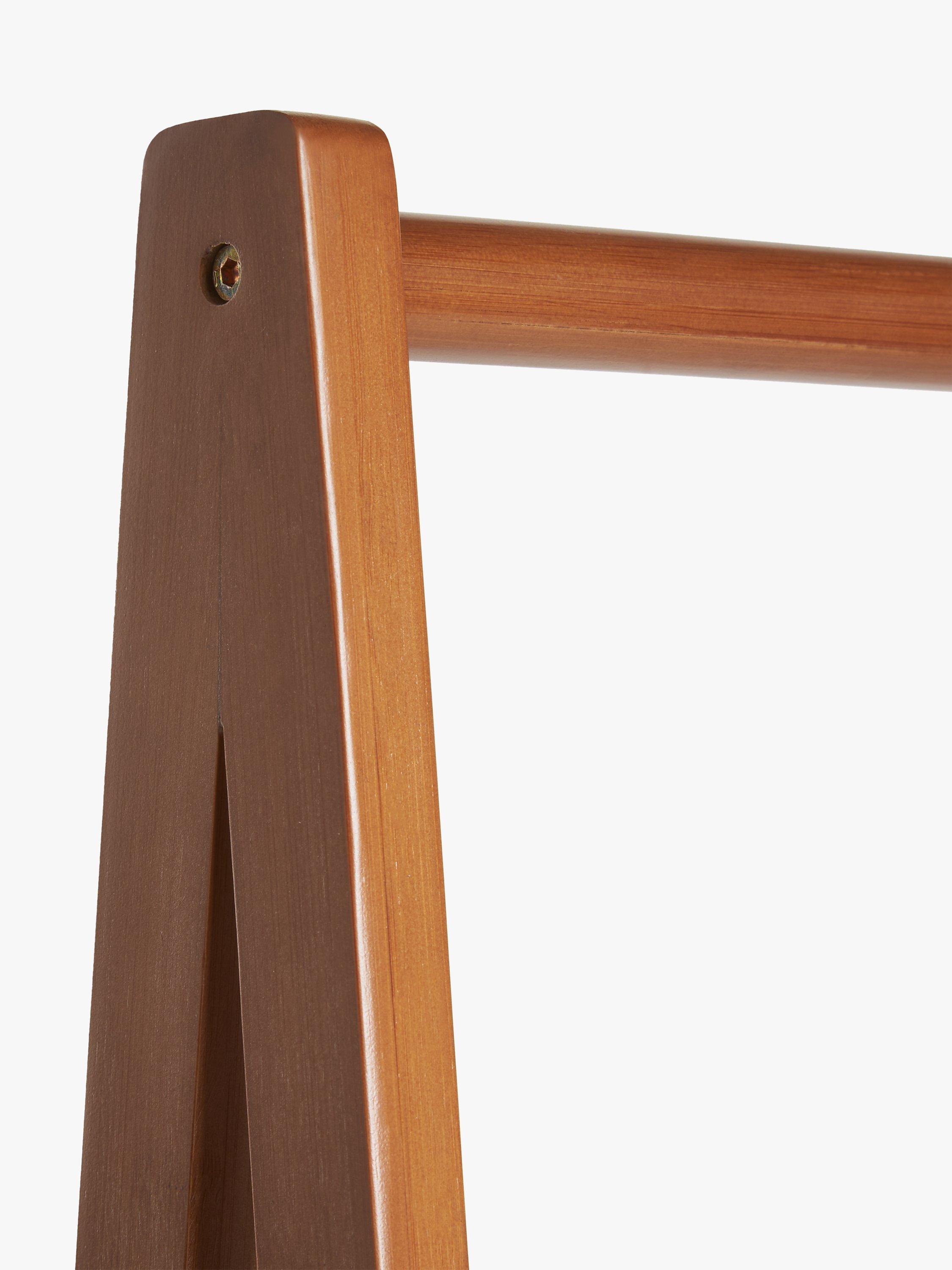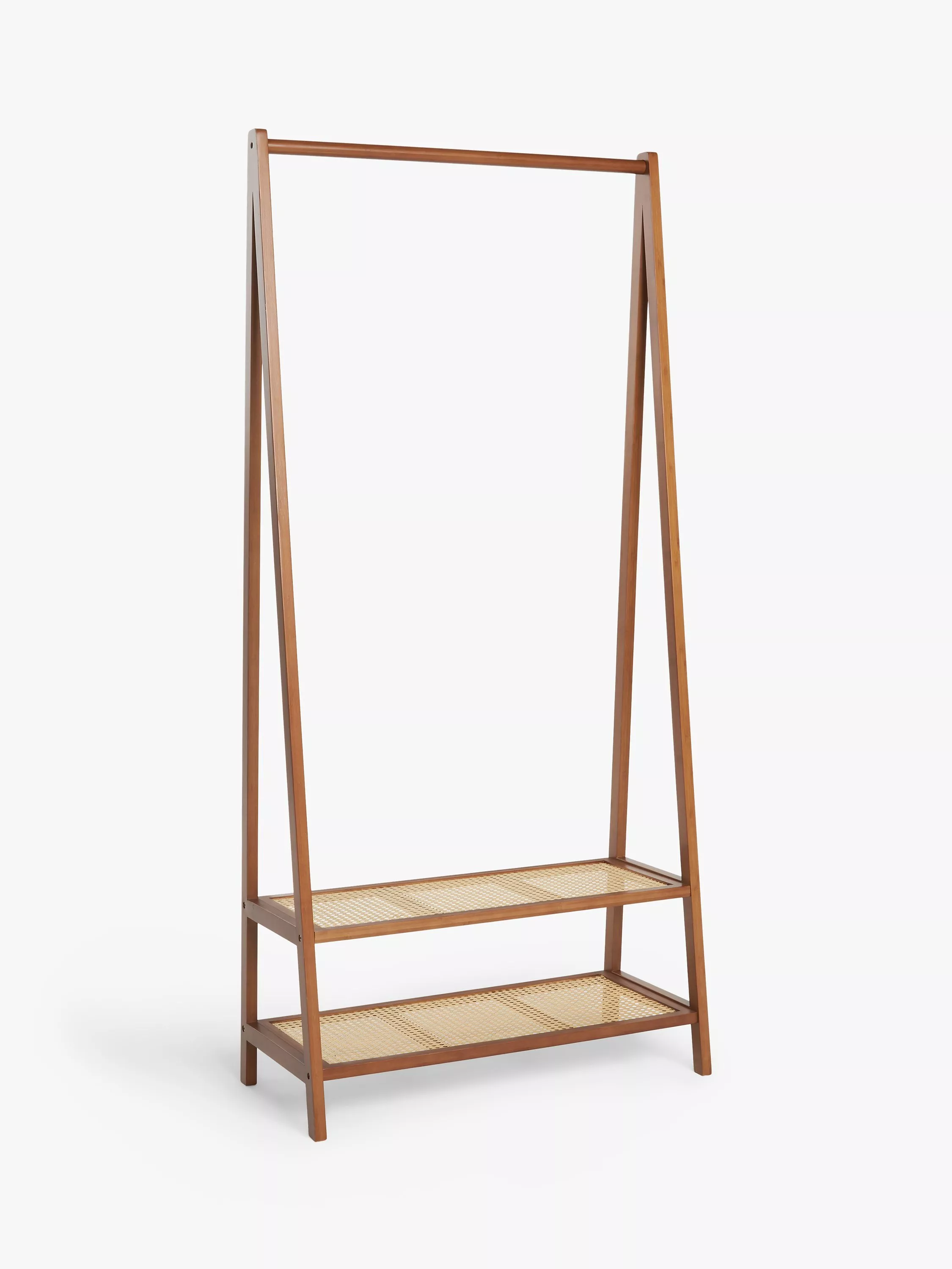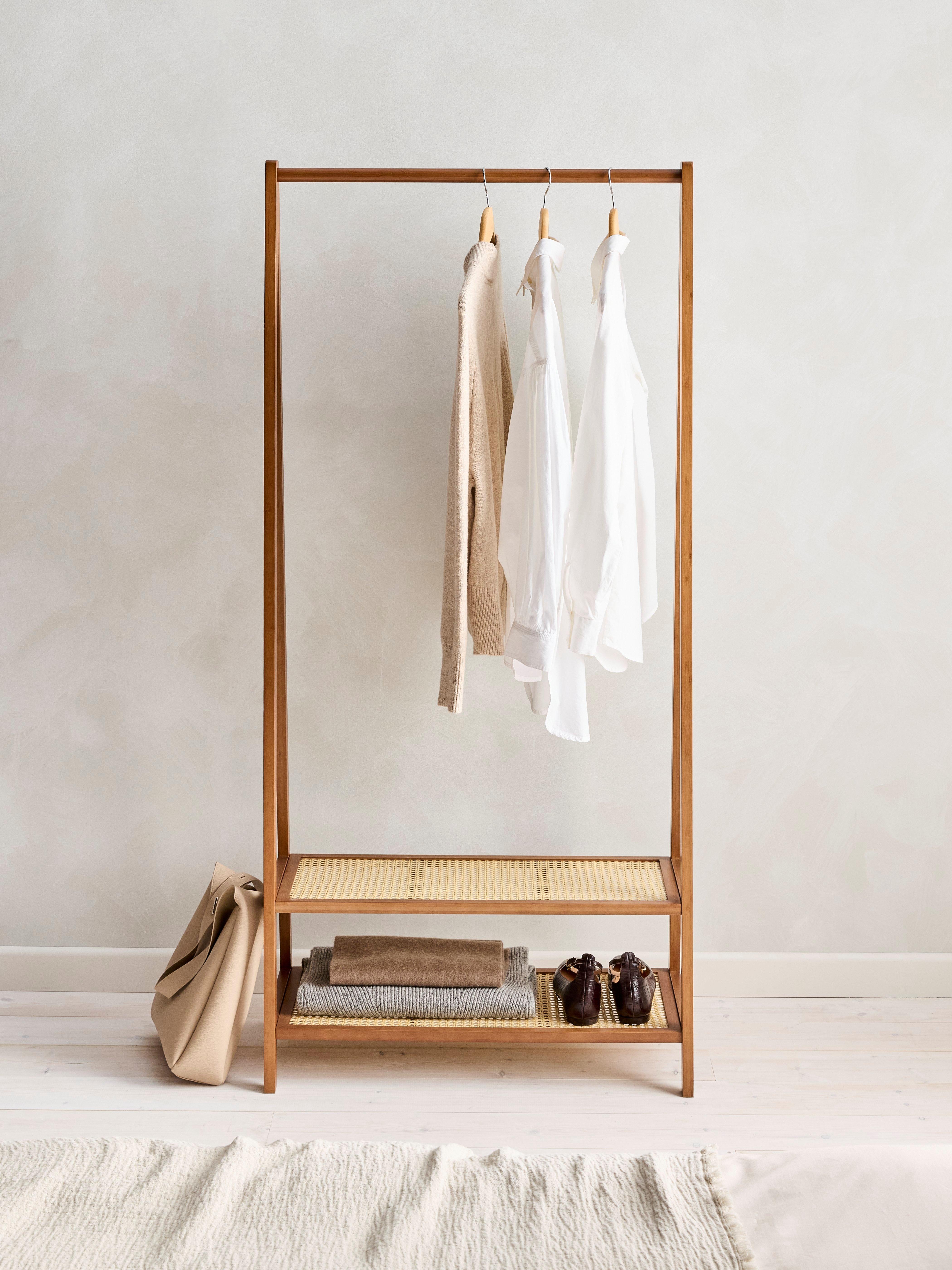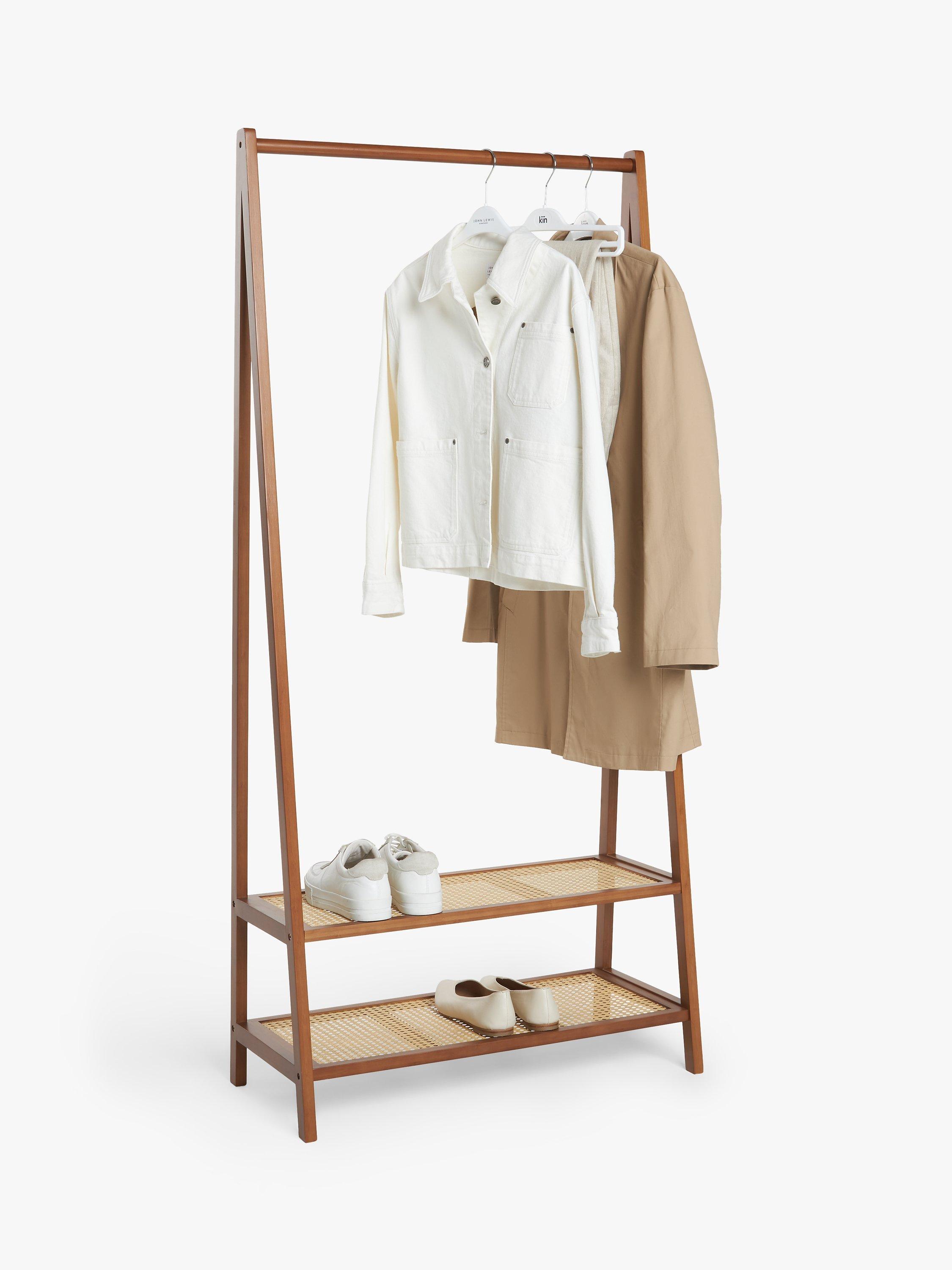 This light cherry wood-effect finish clothes rail stand has two attractive poly rattan shelves at the base for storing shoes, bags and other accessories.