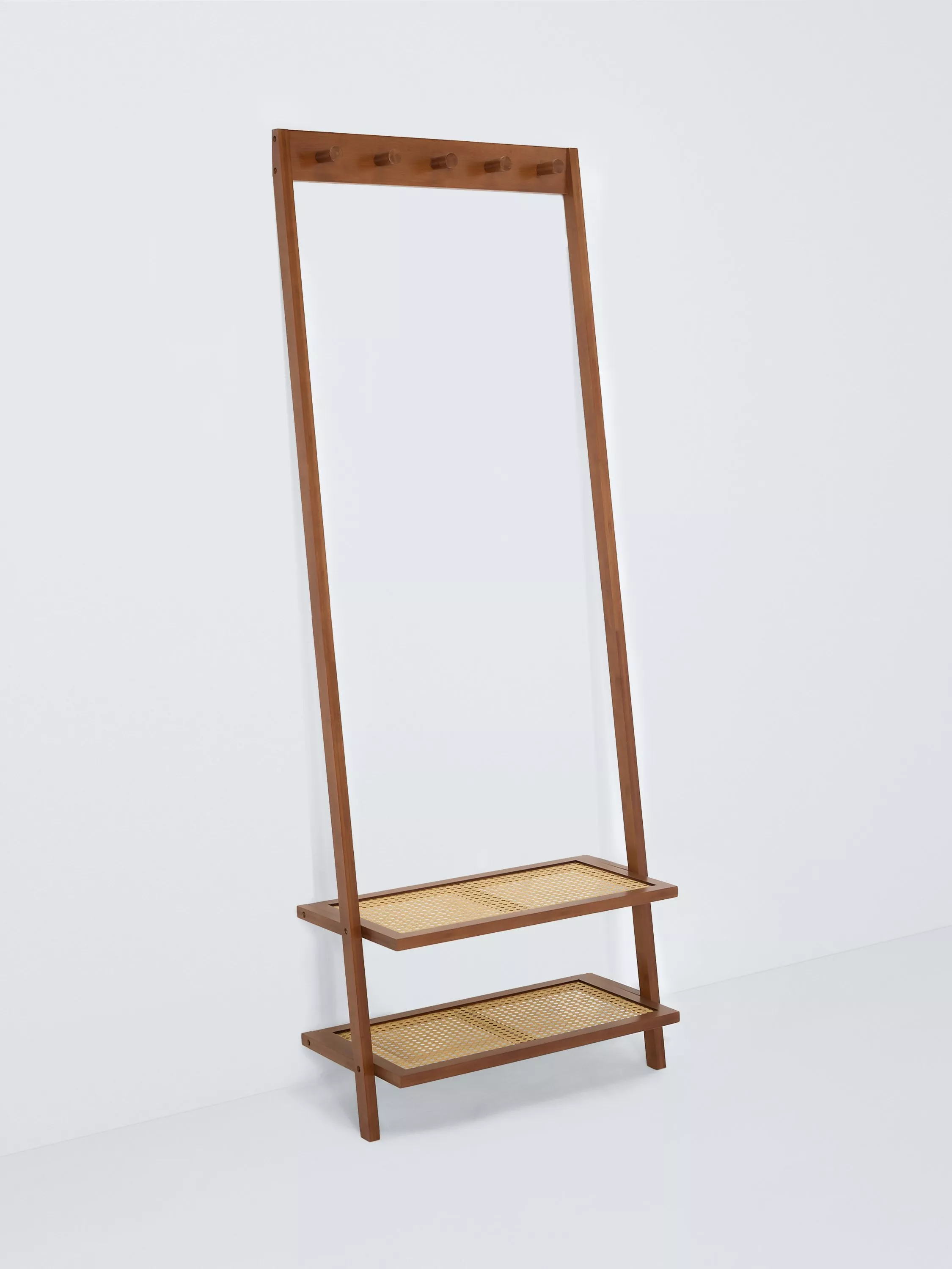 This light cherry wood-effect finish clothes rail stand has two attractive poly rattan shelves at the base for storing shoes, bags and other accessories and a row of hanging knobs at the top.