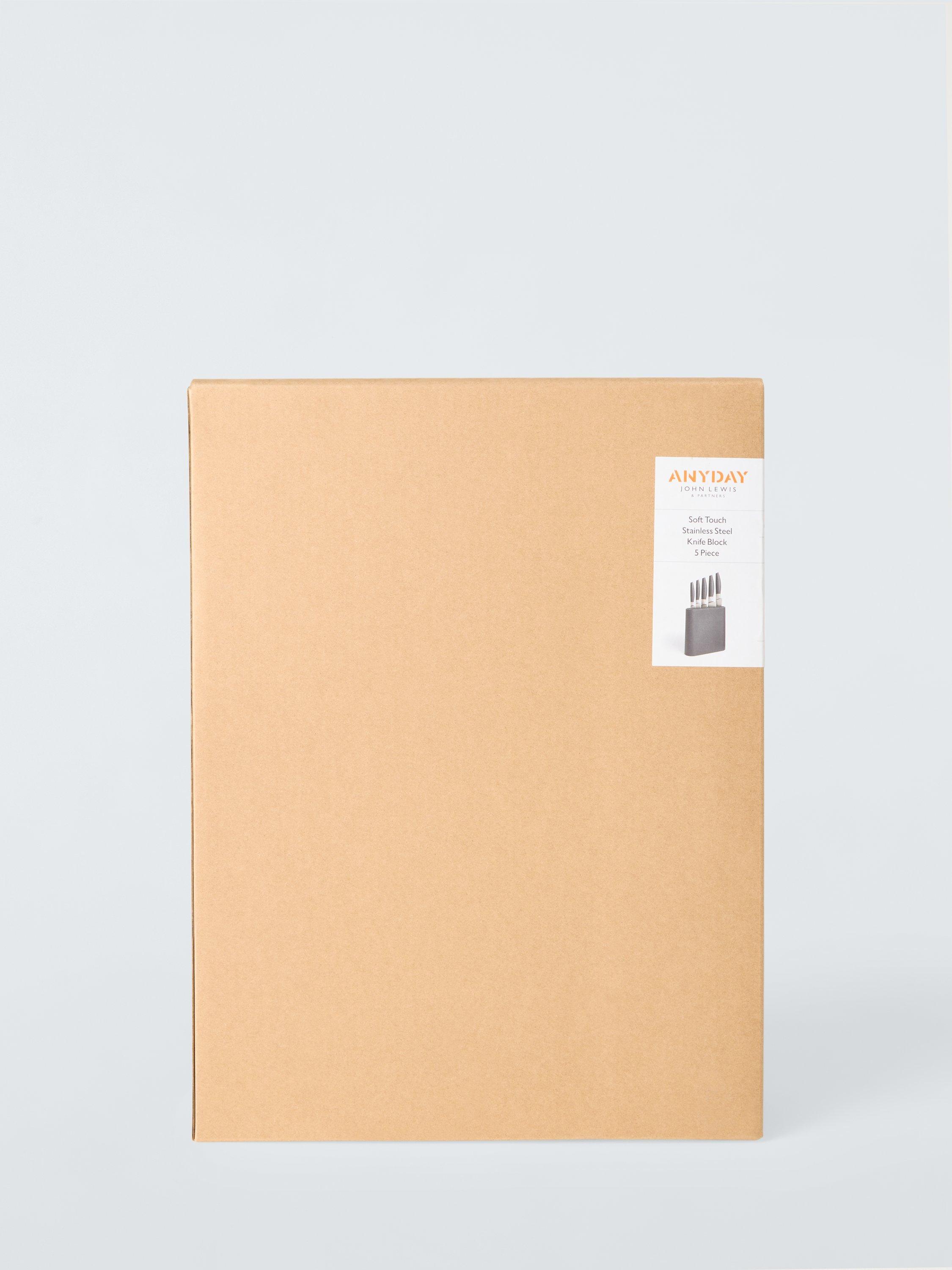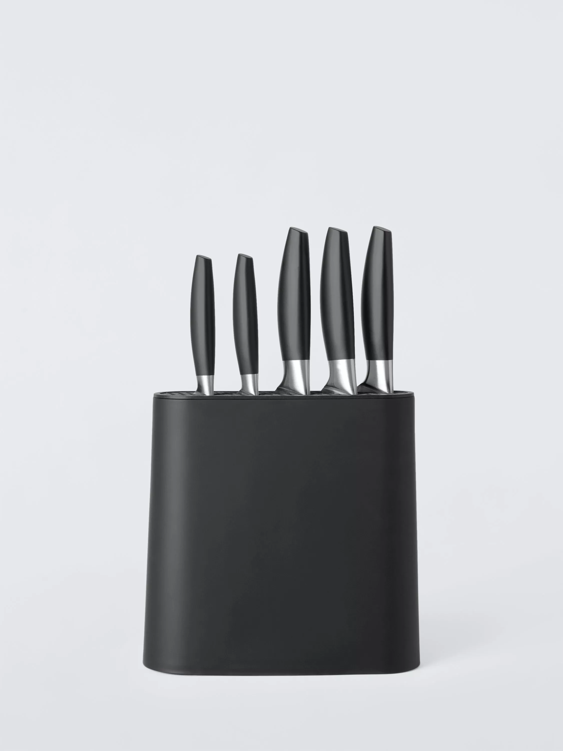 A five-piece knife set for all your food prep needs. A soft-touch coating on the ergonomic handles ensures a comfortable grip and use and matches the knife storage block, which includes three kitchen knife essentials: paring, utility and a cook's knife. The stainless steel knife blades are strong and durable, and the knives are easy to keep clean.
