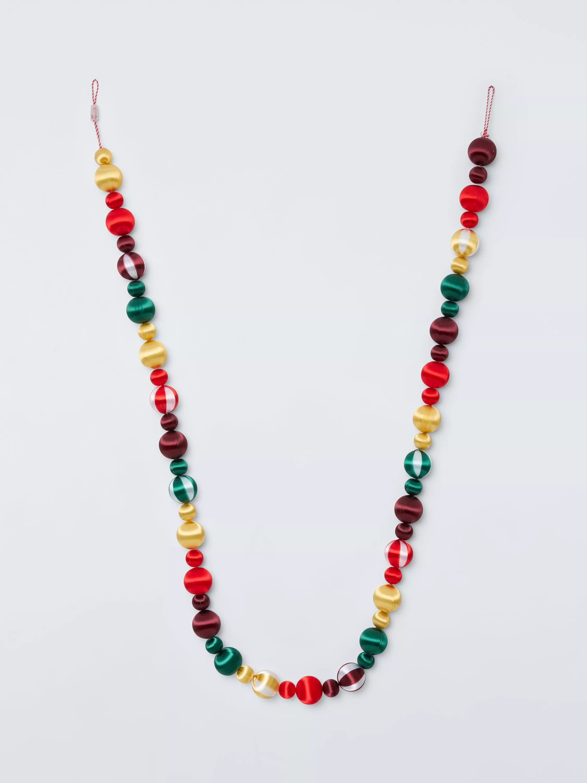This colourful garland is made up of dozens of polyester silk-wrapped baubles, in a range of sizes with plain and striped designs.