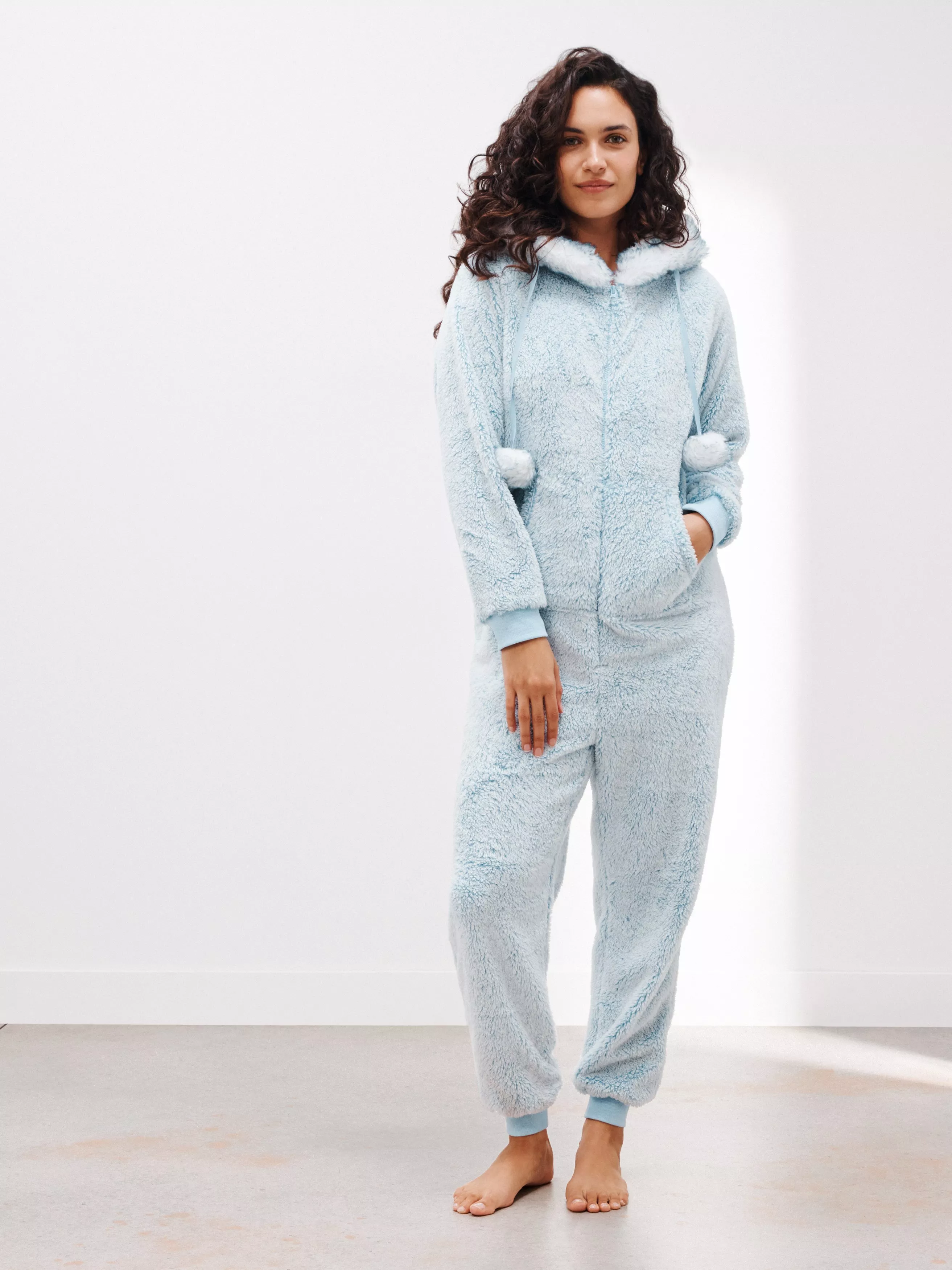 An ultimate lounge piece to snuggle down in, our onesie is made from super soft fleece, lined with a faux fur trimmed hood for extra cosiness. We've kept the silhouette snug with tapered sleeves and cuffs gathered into ribbed trims and included a front kangaroo pocket that separates with the front zip and playful pom poms.