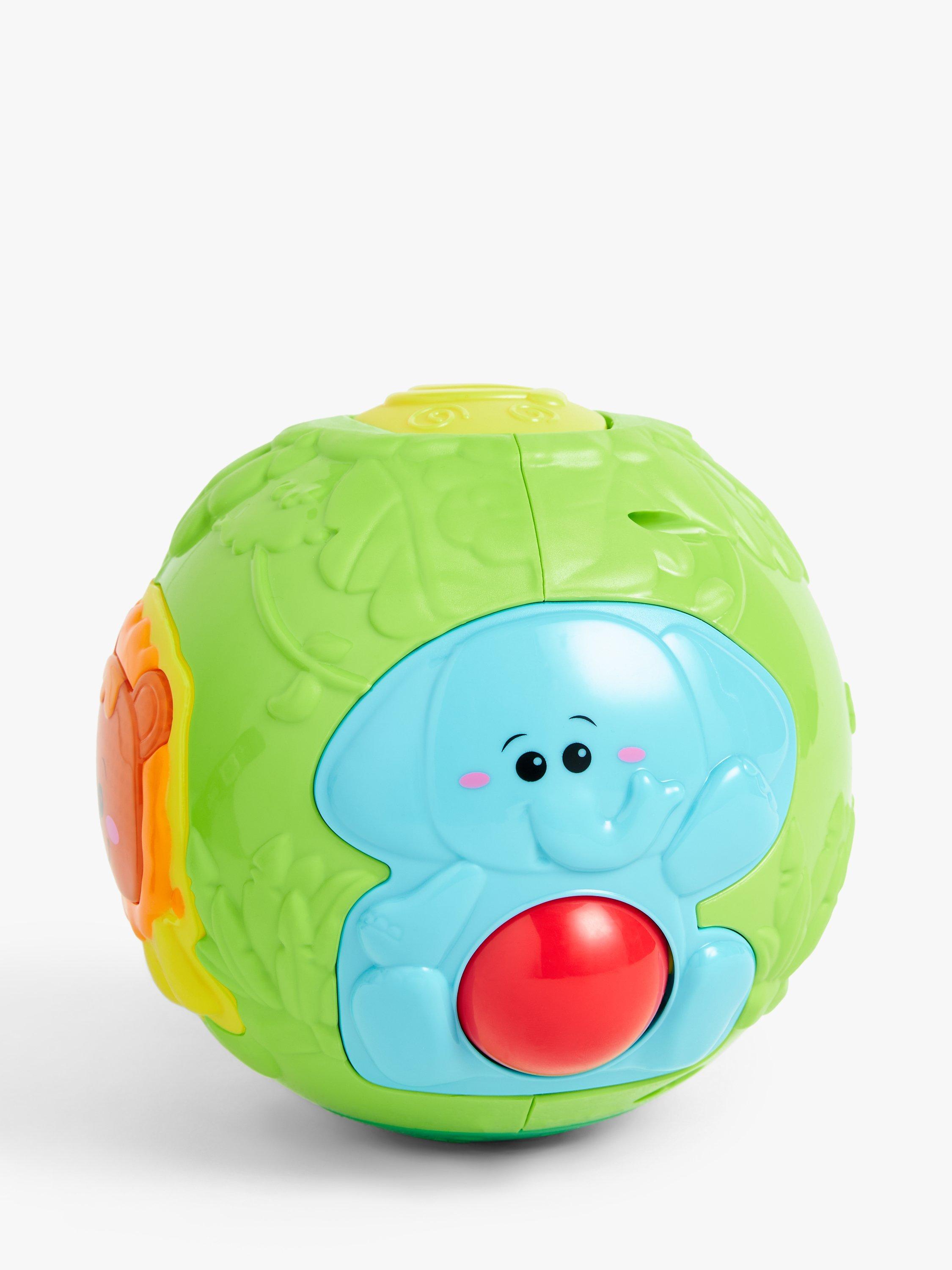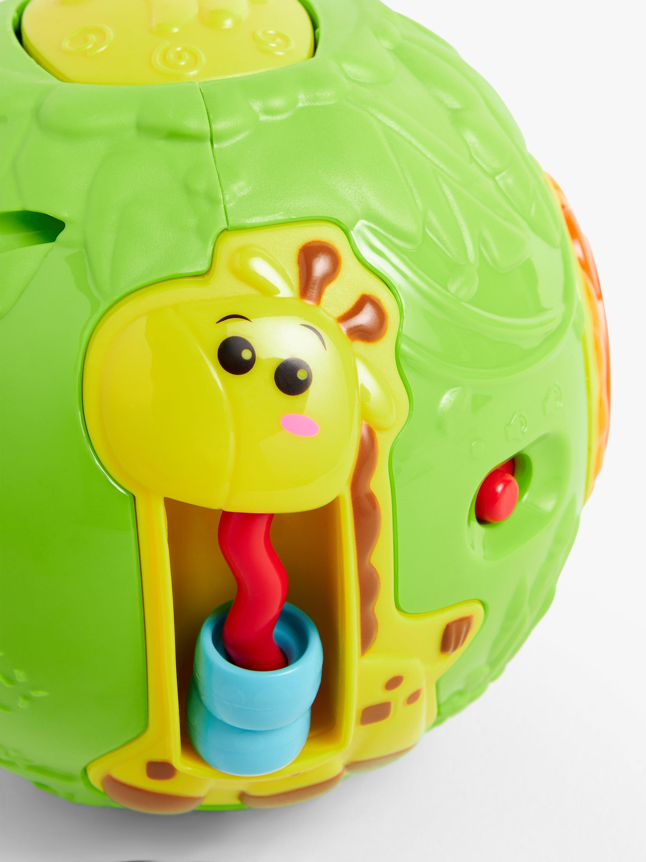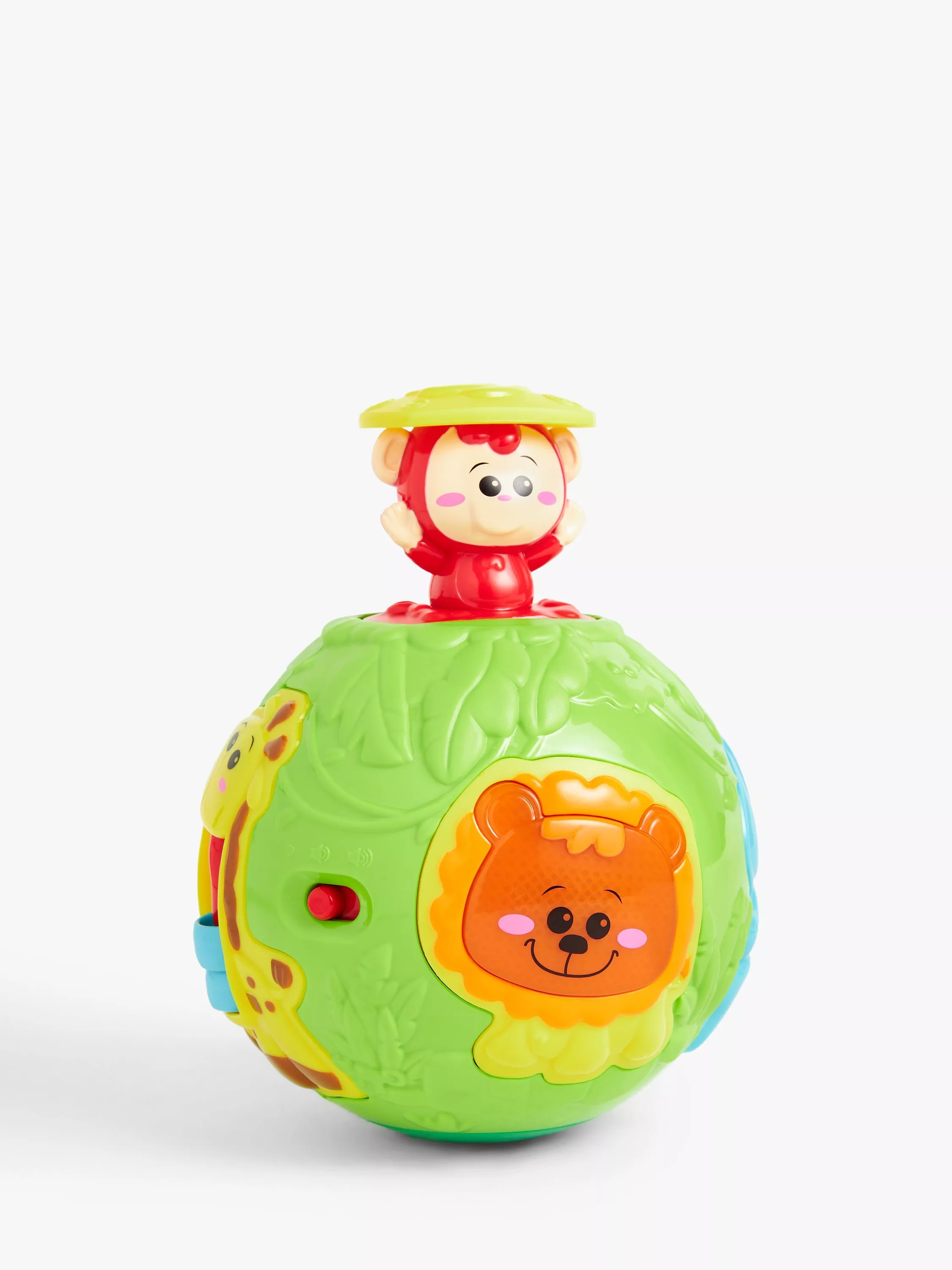 This pop-up monkey ball features a friendly lion with push-button melodies and flashing lights, a giraffe with sliding beads, and an elephant with a roller ball toy.