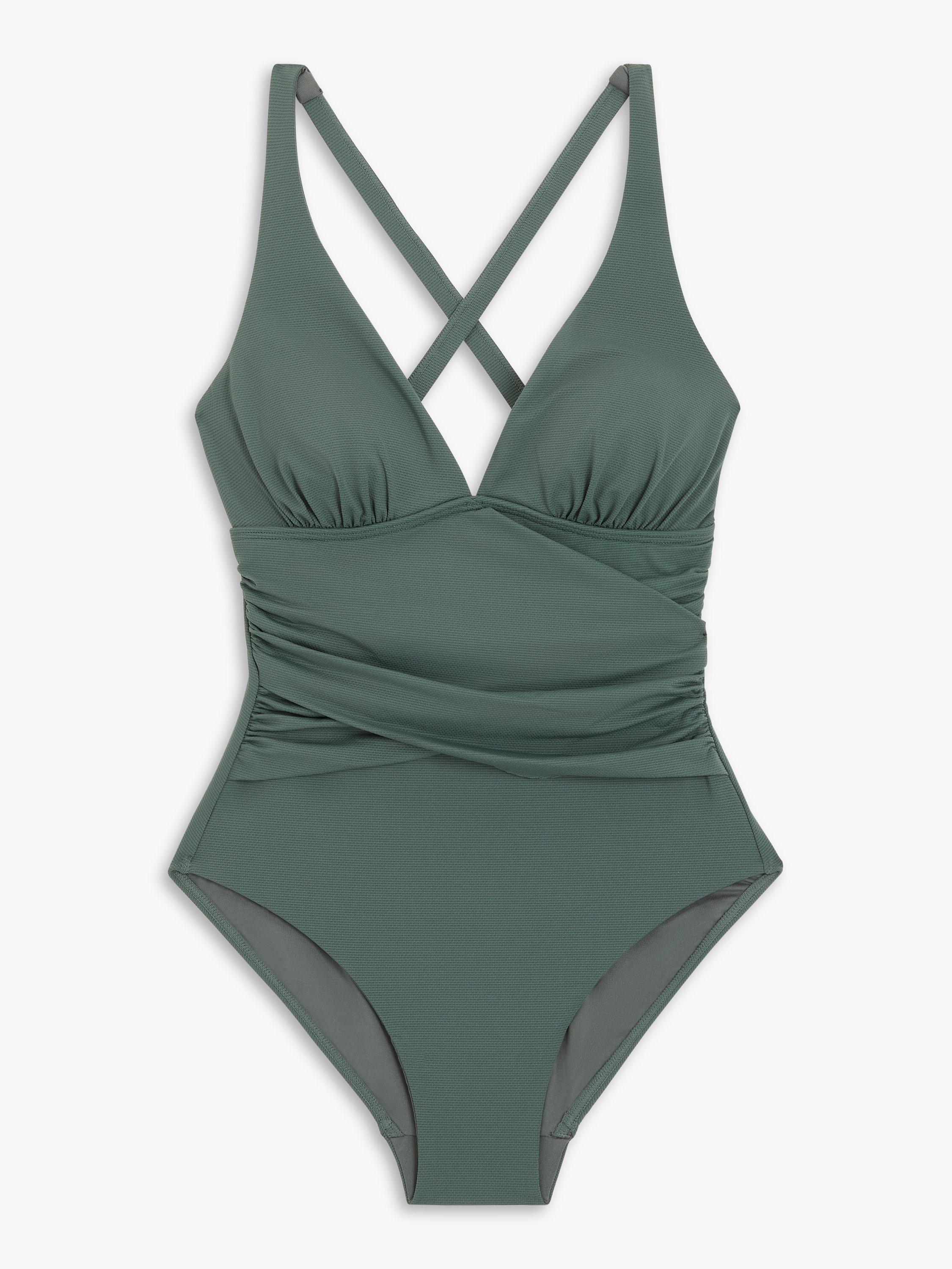At the top we've used a high apex cut and plunging neckline to open up and lengthen your neck. For the body we've used a wrap design that flattens your tummy and provides medium control. And we've crossed the straps over at the back to give extra assurance of support.