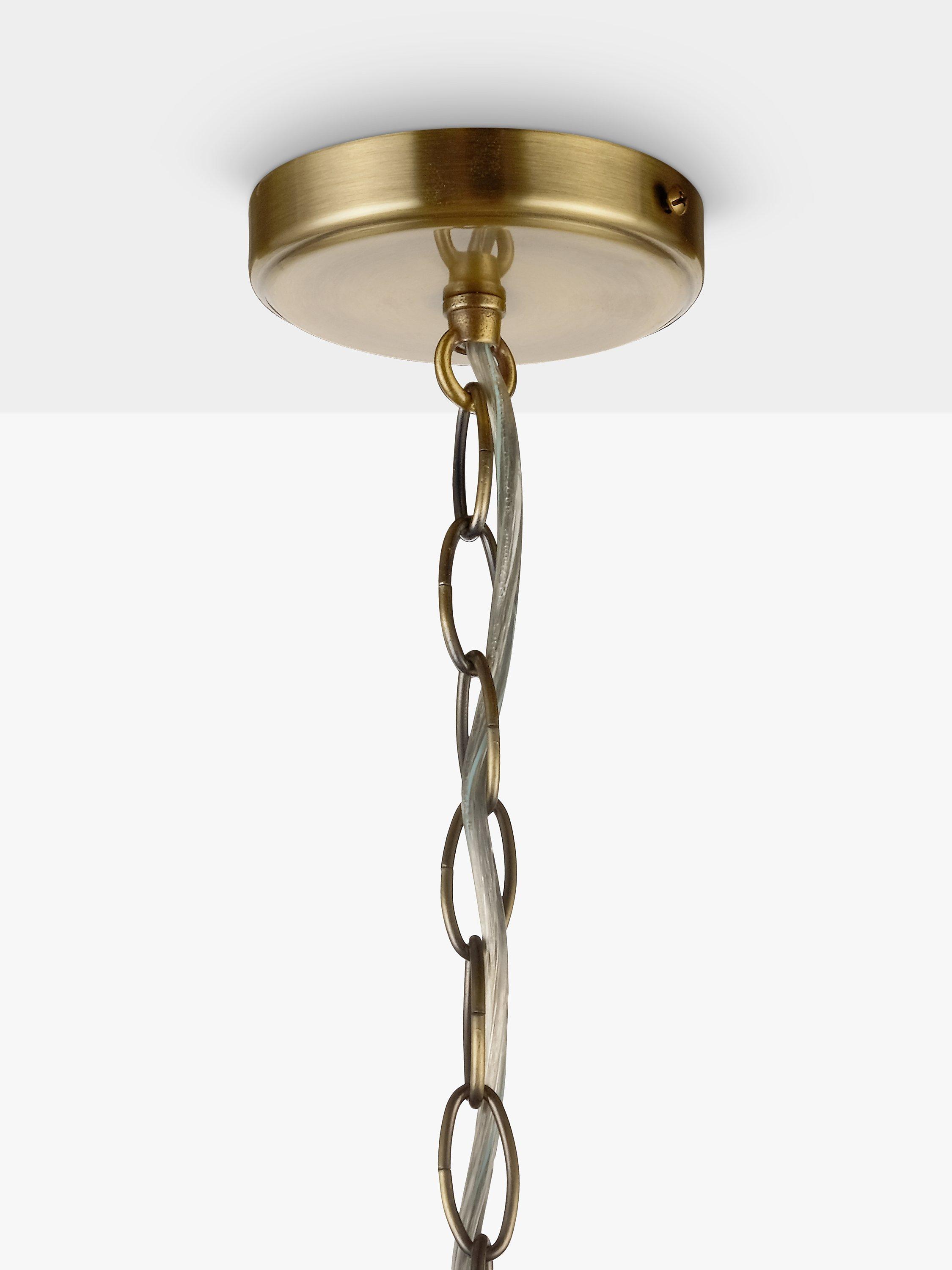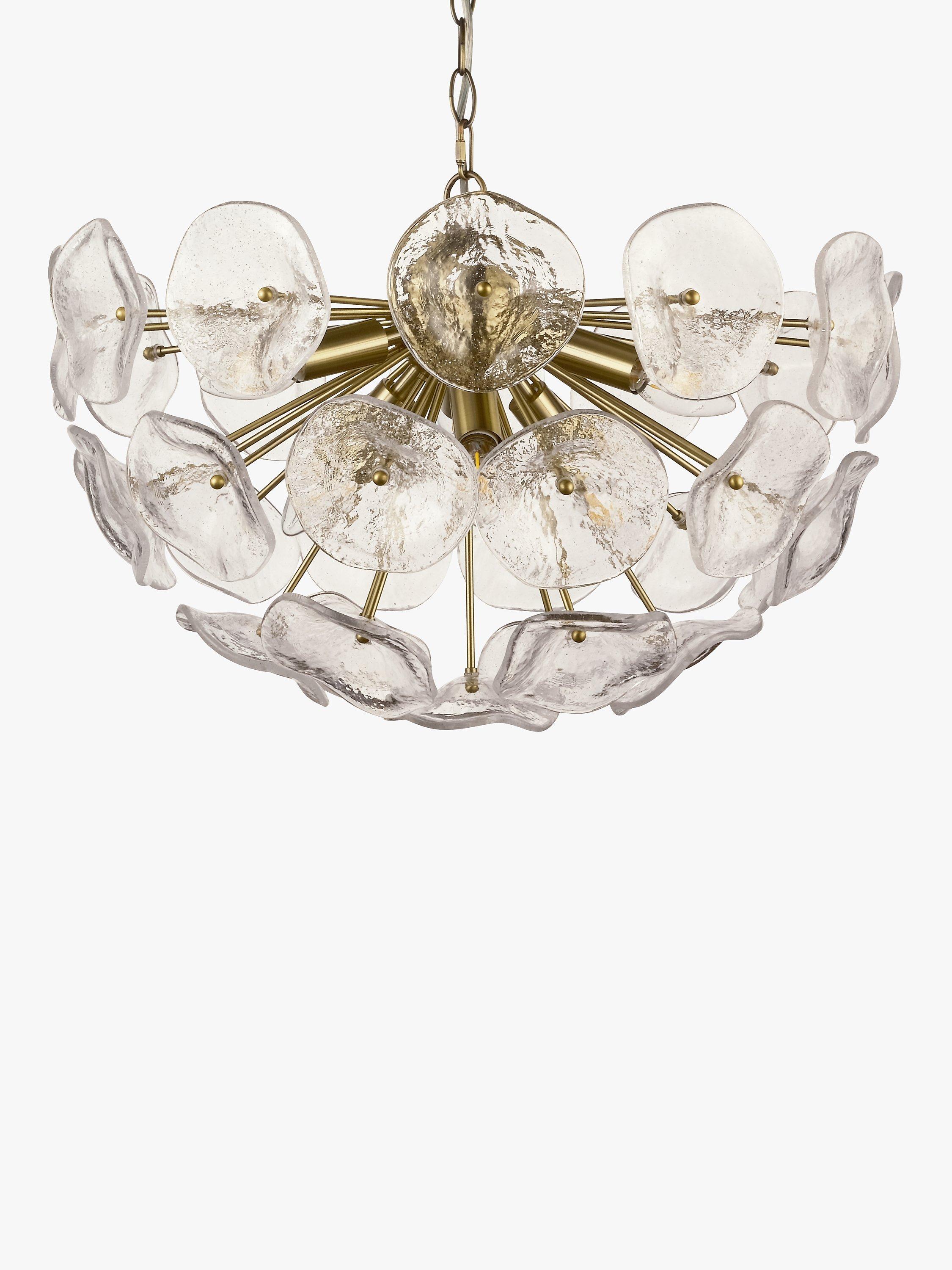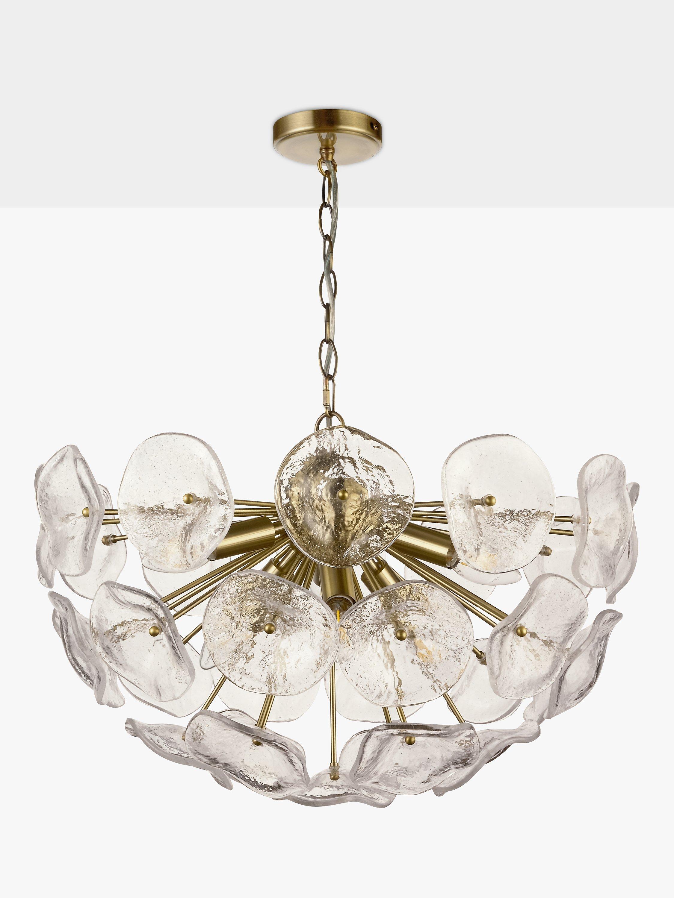 Elevate your space with this captivating pendant light. Finished in antique brass and adorned with frosted glass "poppies", this eccentric design will cast a welcoming glow of light over any room.