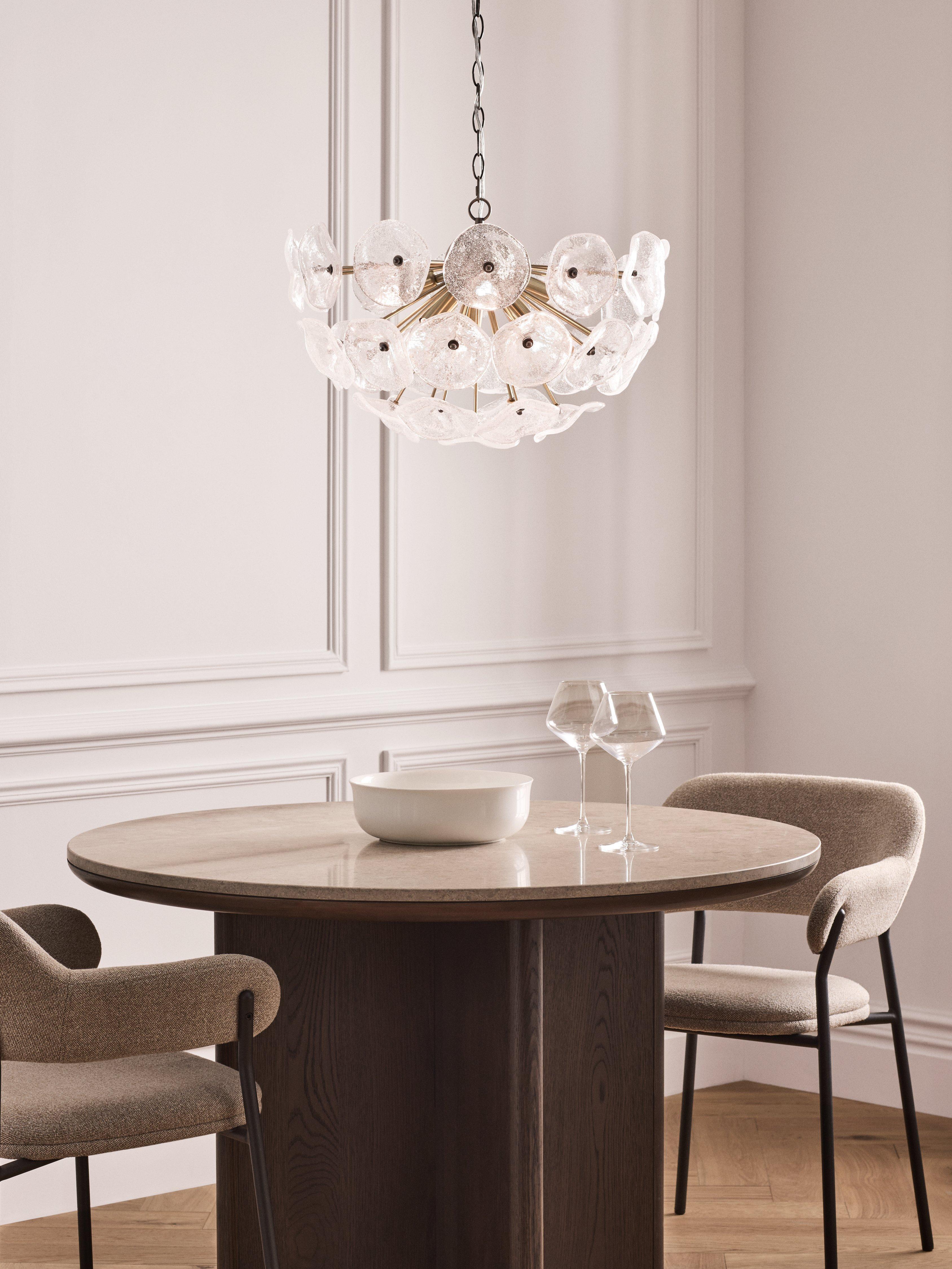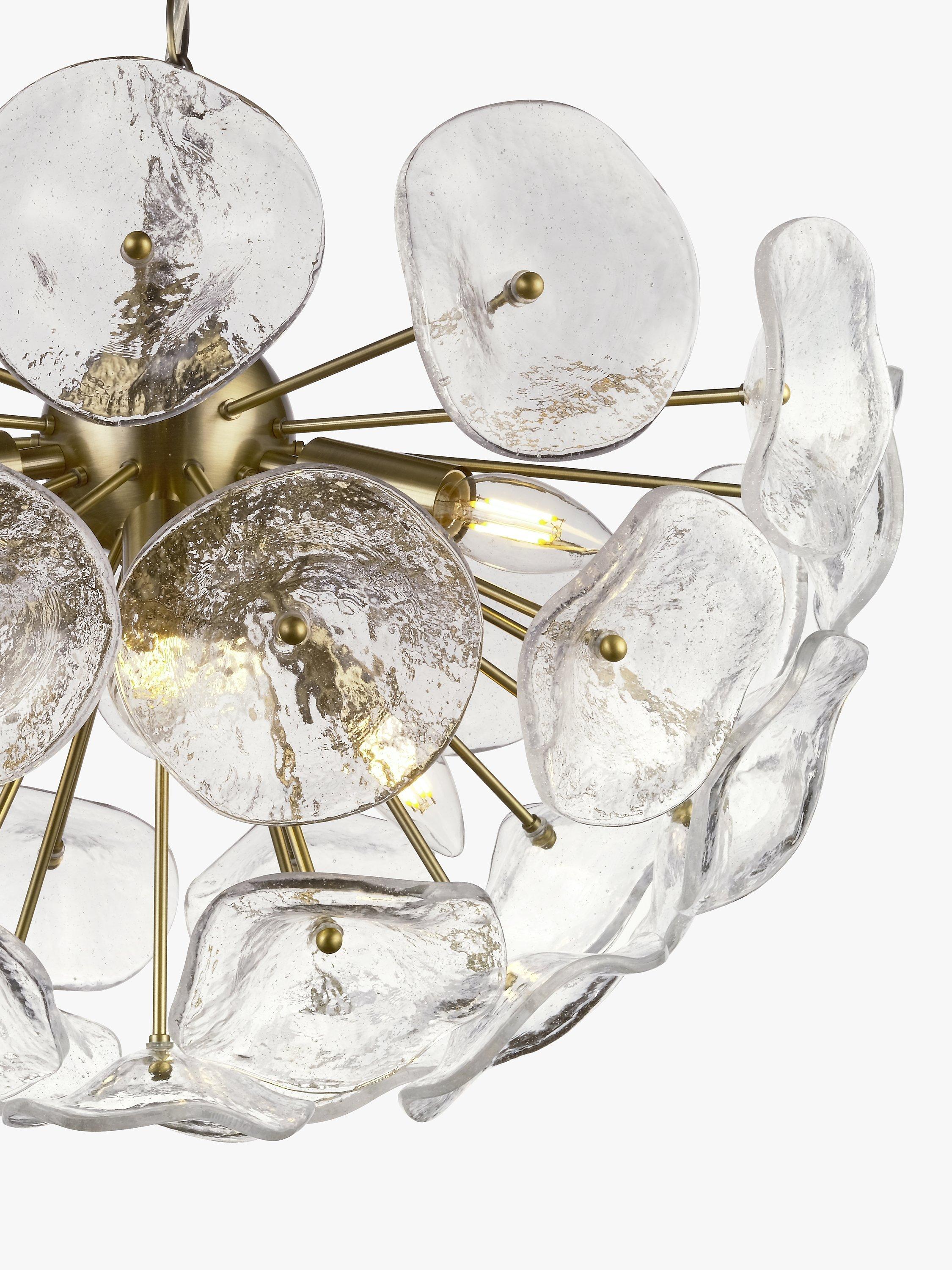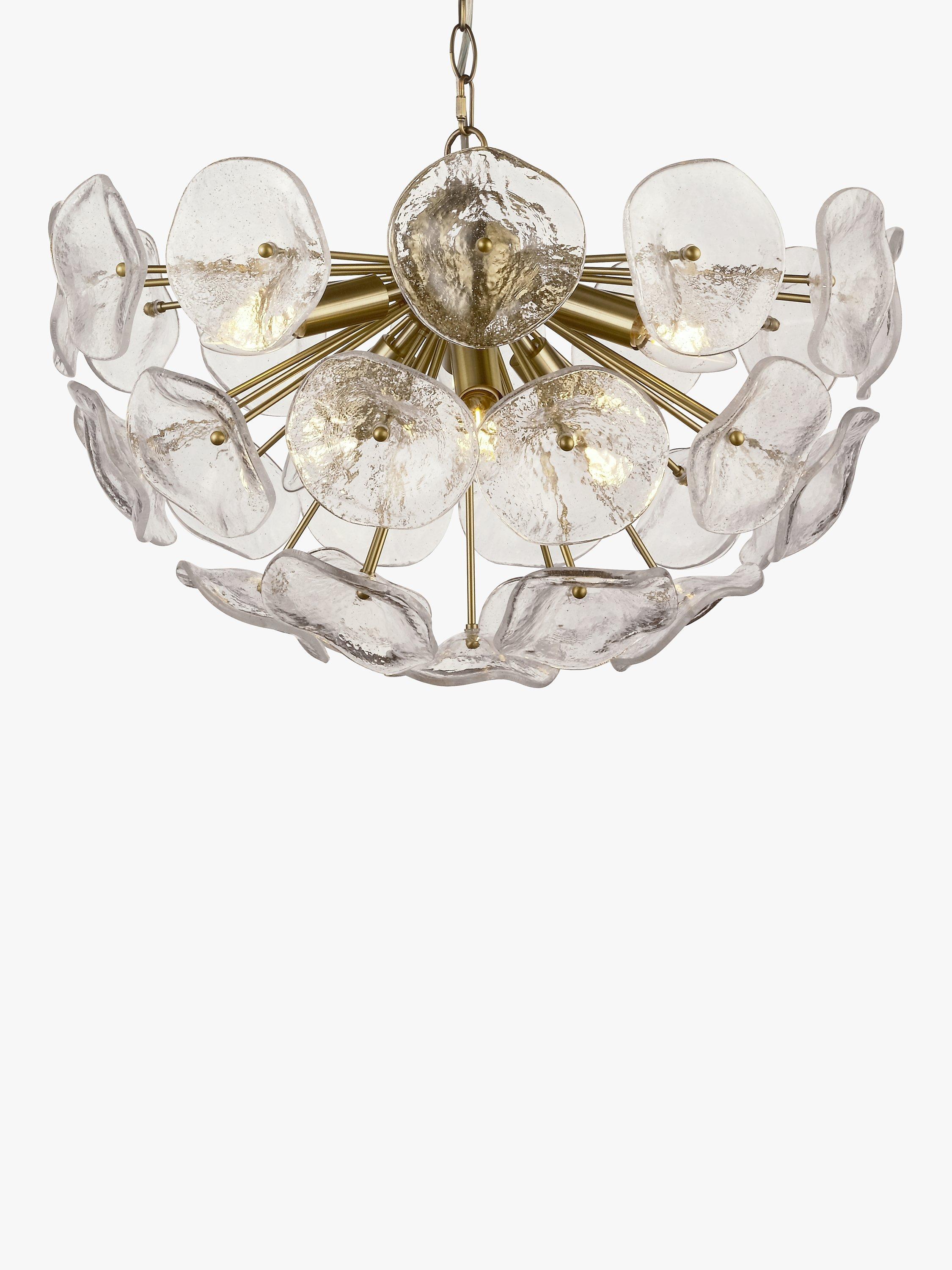 Elevate your space with this captivating pendant light. Finished in antique brass and adorned with frosted glass "poppies", this eccentric design will cast a welcoming glow of light over any room.