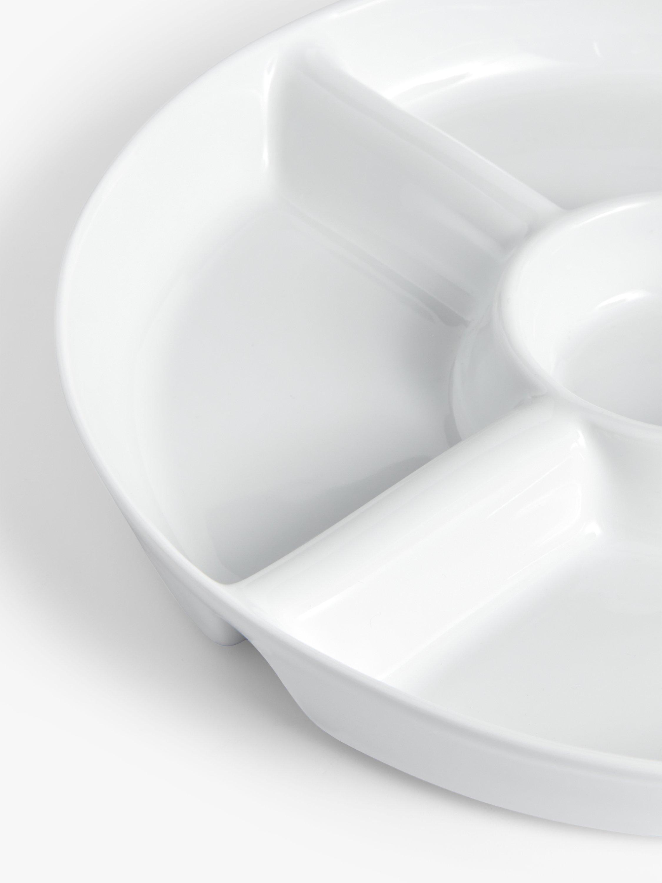 A five-section chip and dip platter and serving solution. This porcelain dish is dishwasher and microwave save for everyday use.