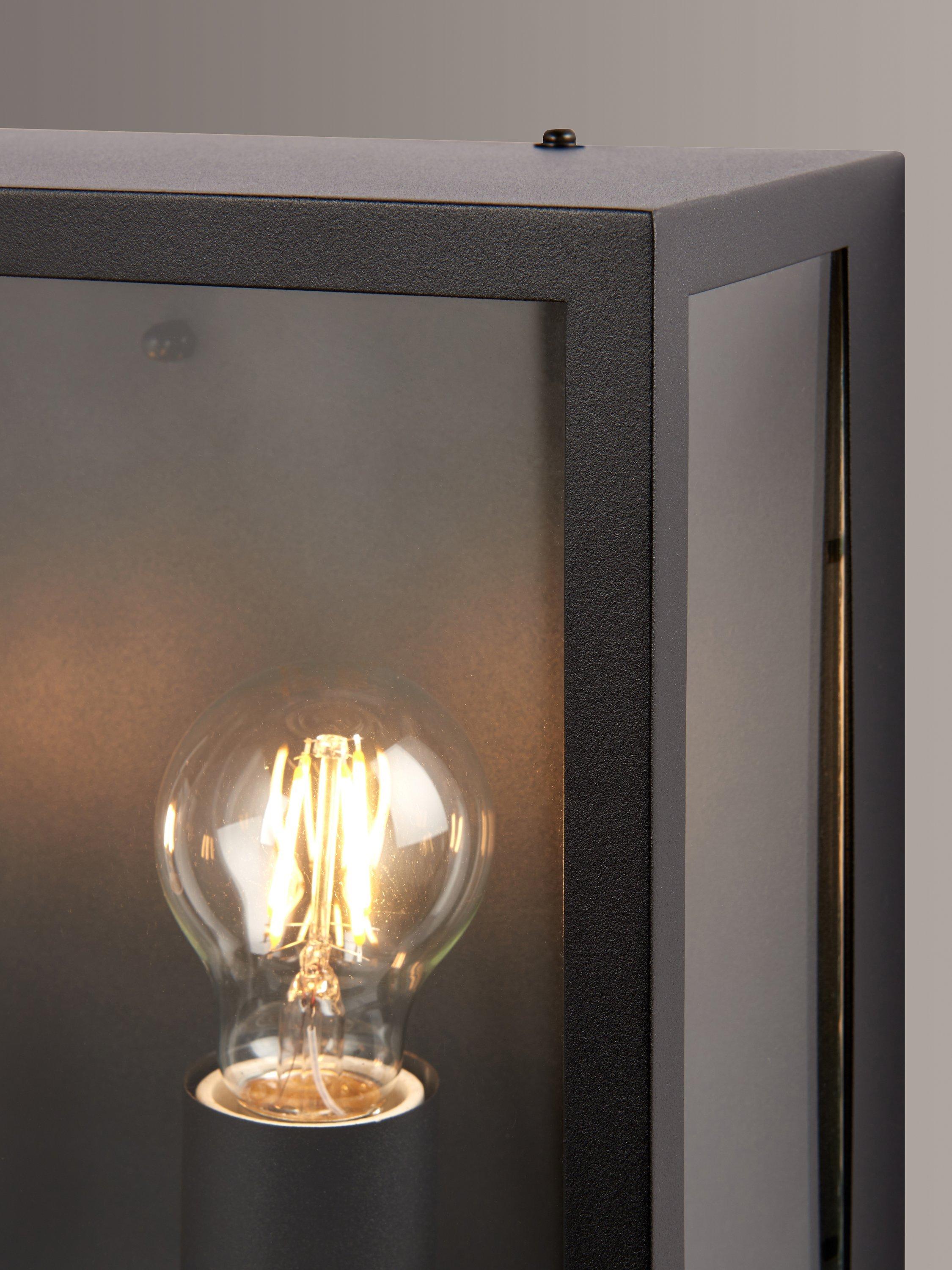 This wall light is made from sturdy steel with clear glass panels. It's a modern and functional lighting solution for your outdoor space and will look impressive when installed on either side of an entryway. Complete the look with two decorative filament LED bulbs.