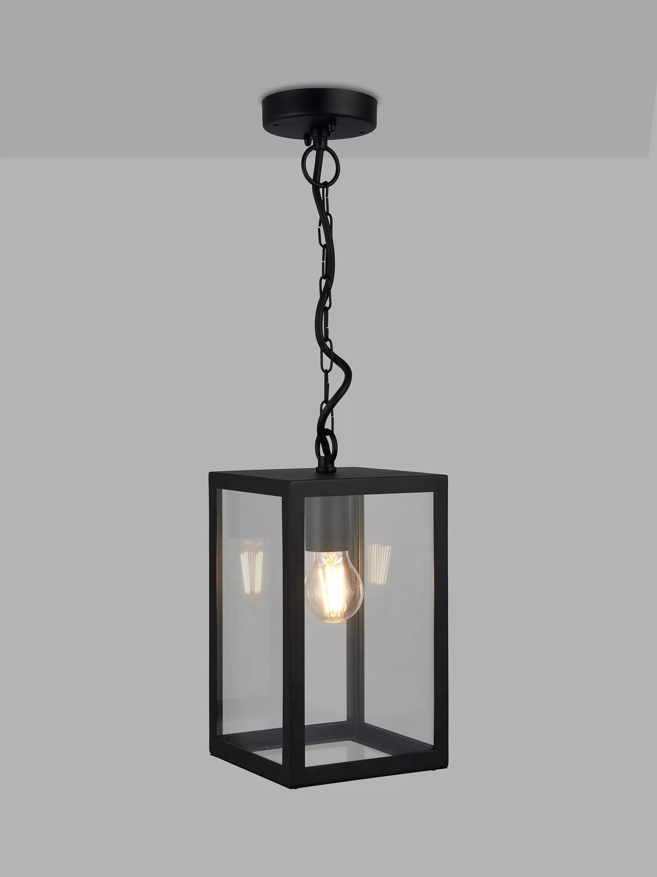 This pendant is made from sturdy steel with clear glass panels. It's a modern and functional lighting solution for both indoor and outdoor spaces and will look impressive when installed either in a porch or over an outdoor dinning space. Complete the look with a decorative filament LED bulb.