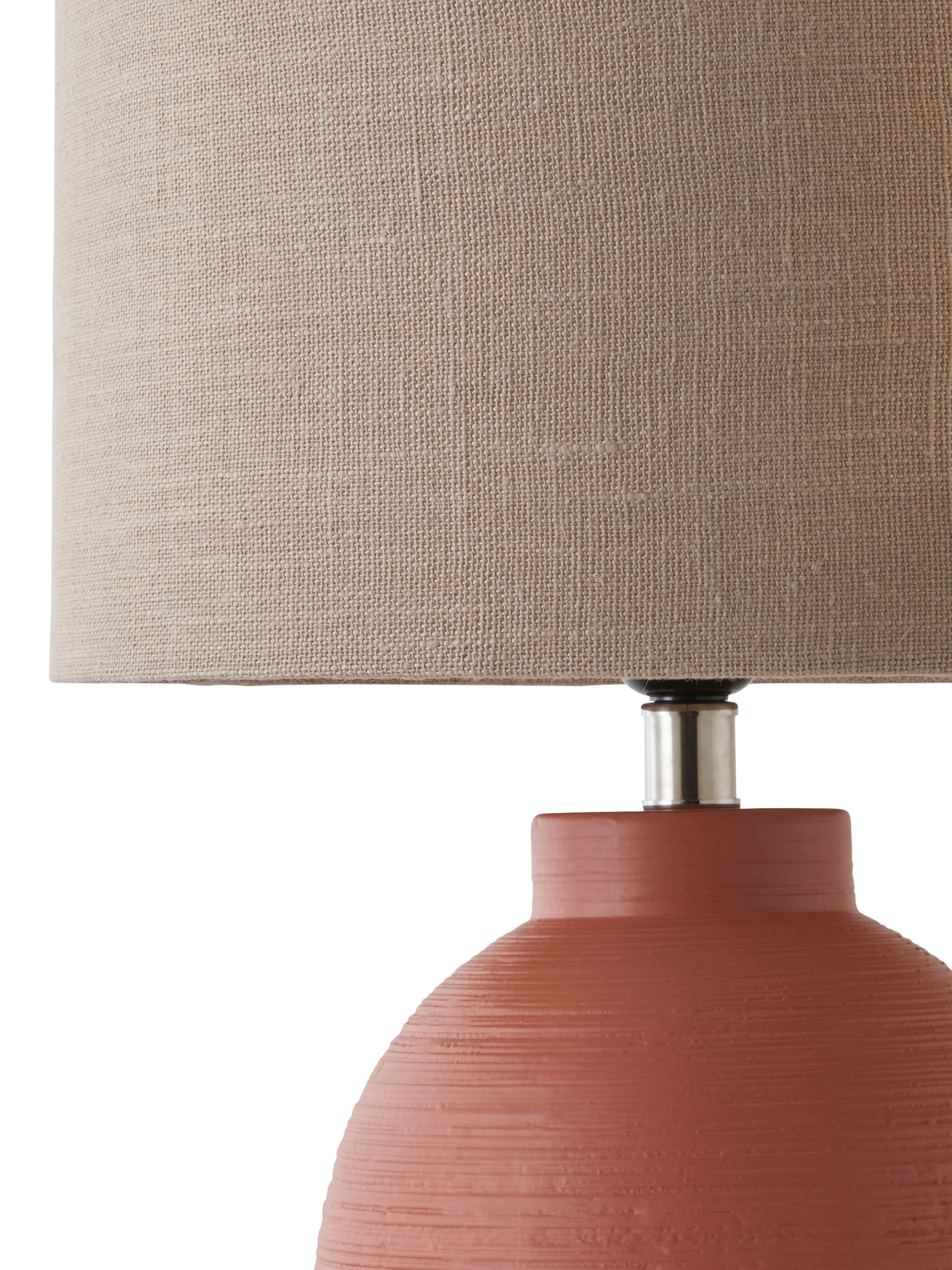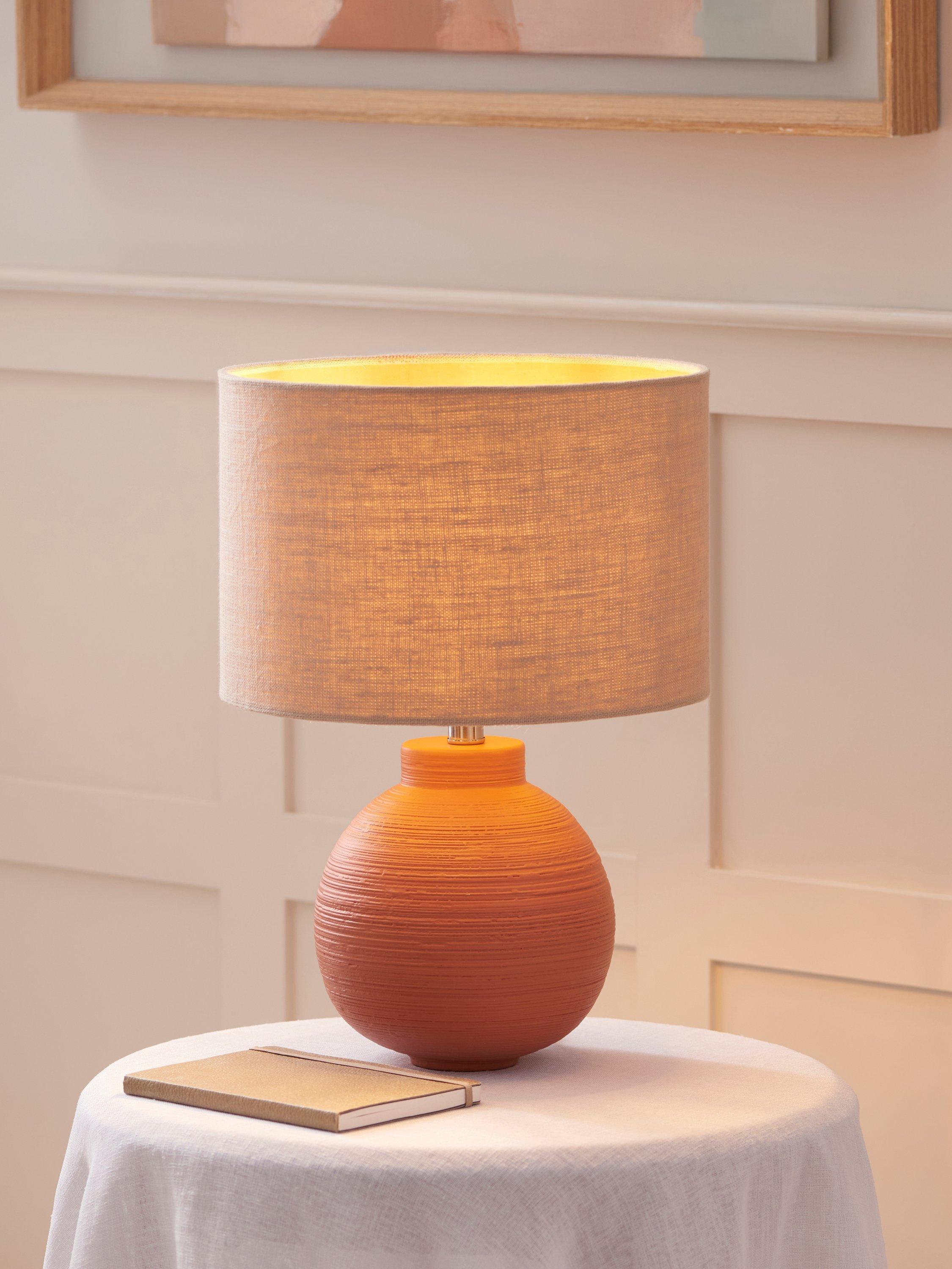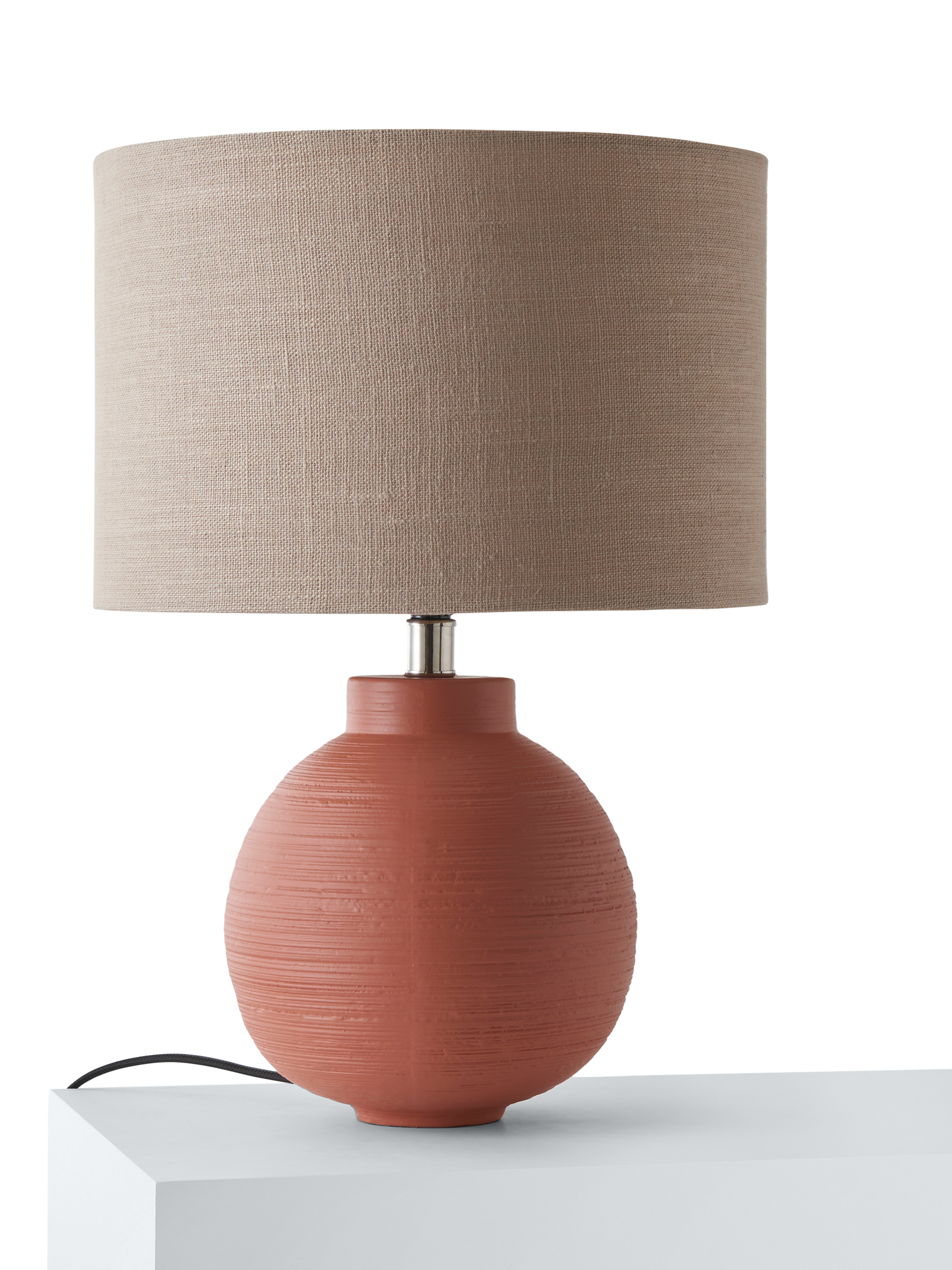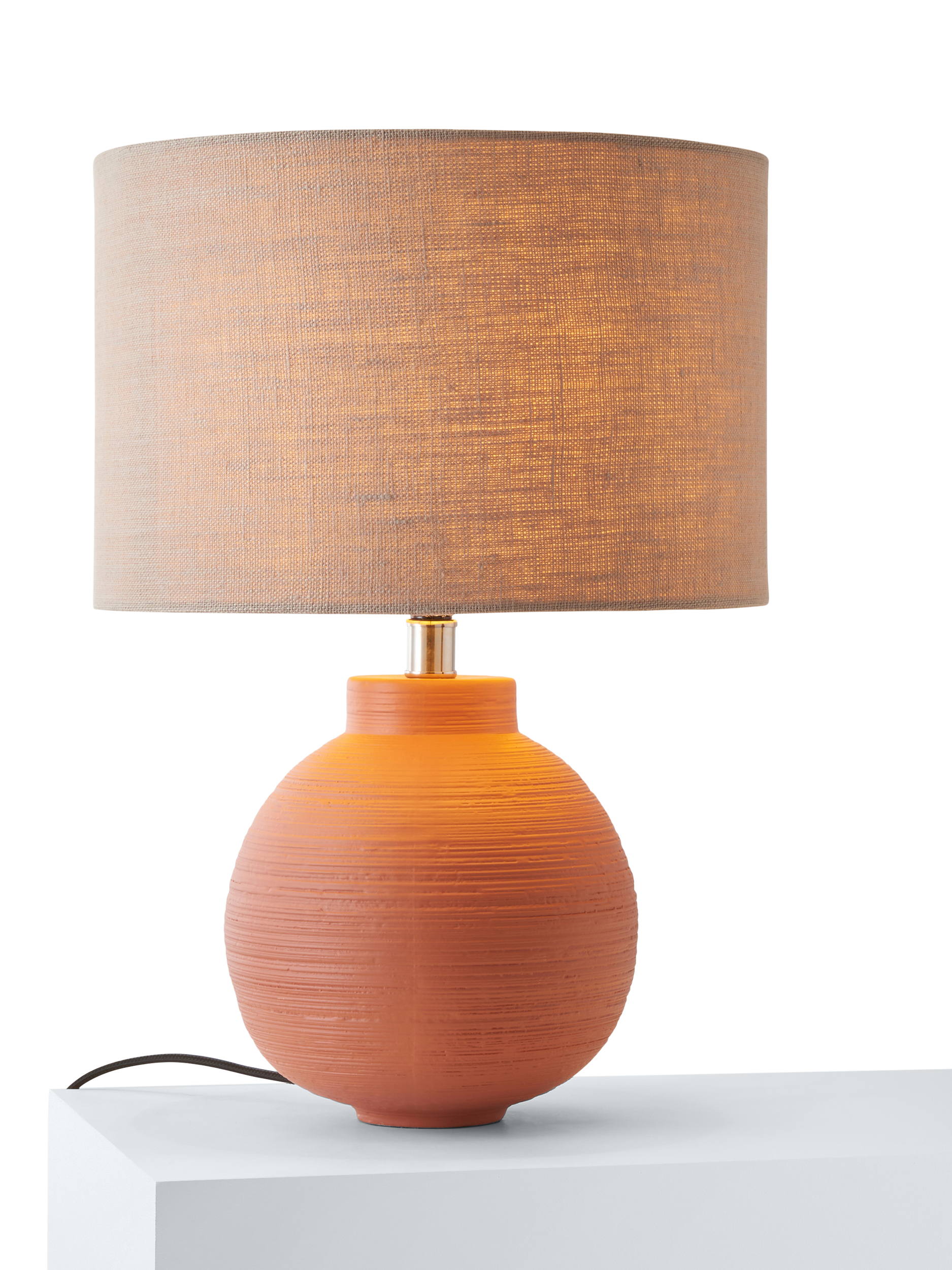 The Potter's Wheel round table lamp adds warmth and rustic charm to any space with ribbed detailing on the ceramic base. Ideal for consoles or side tables, its deep tones are enhanced by a matt antique brass-effect plate and a natural faux-linen subtly textured shade. A cosy yet stylish accent to suit a range of interiors.