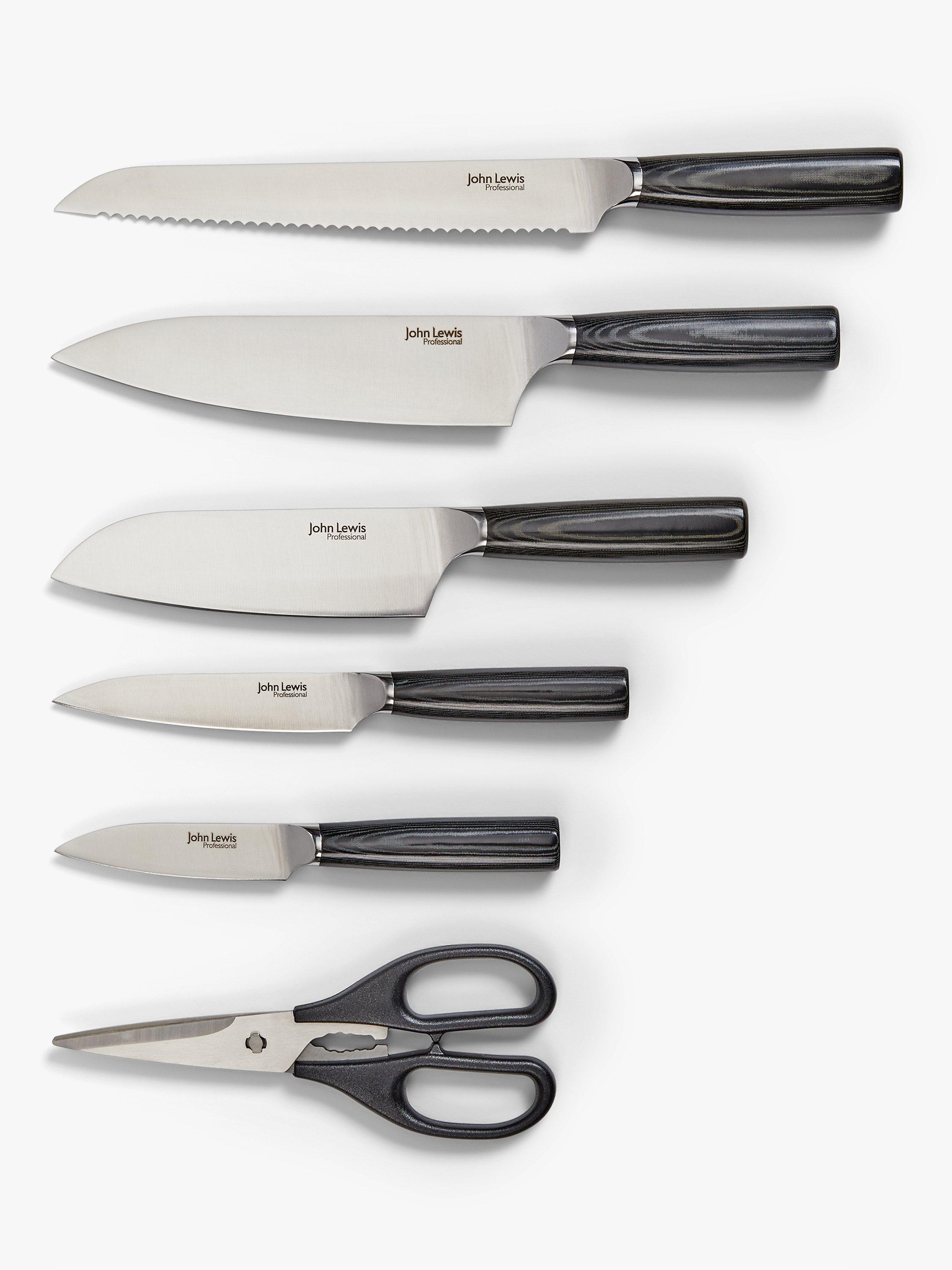 All your food prep needs in one place. This filled knife block includes five popular kitchen knives and a pair of kitchen scissors, kept together in an upright knife block. Our Professional knives are made with tough stainless steel blades and Micarta handles that are comfortable to hold and use.