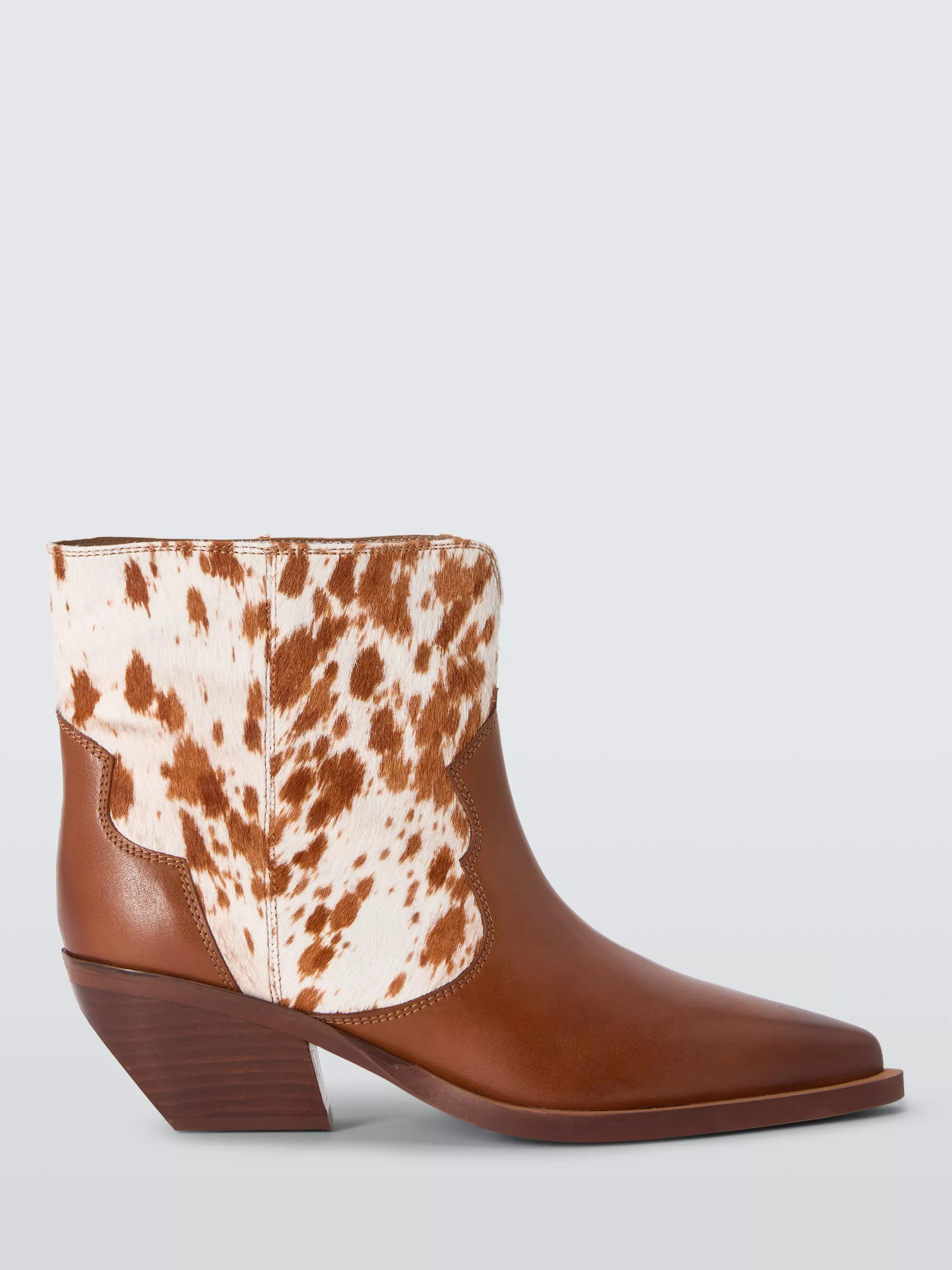 Promise is a sleek, western-inspired ankle boot that strikes a chic balance between heritage and high fashion. The structured silhouette, low-angled Cuban heel and classic cowboy toe shape is finished in a statement mix of hair-on-hide texture with deep chocolate brown leather, making them a capsule wardrobe essential.