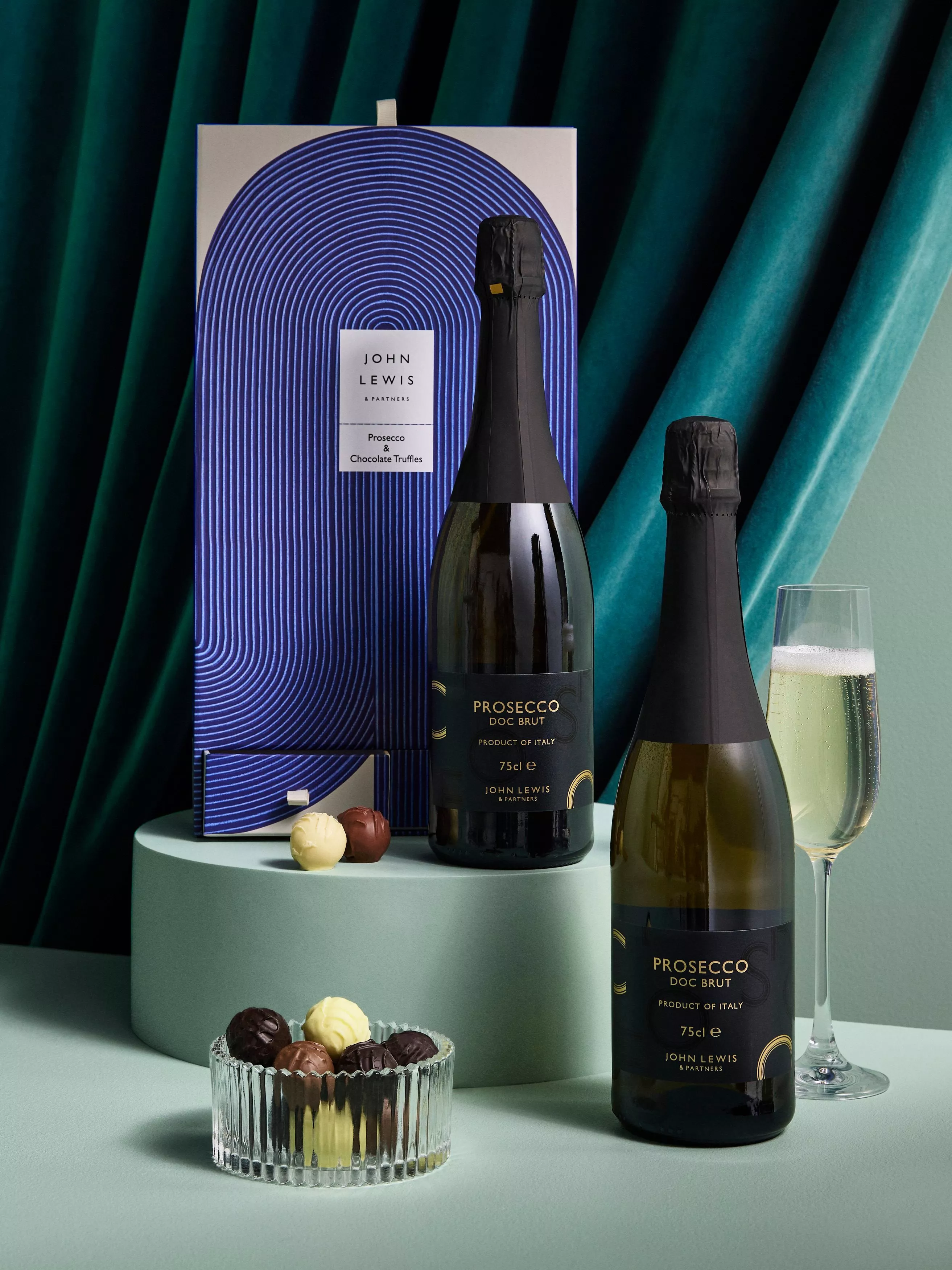 Two bottles of Prosecco, 2x 75cl and two trays of six indulgent white chocolate, dark chocolate and milk chocolate truffles with a ganache filling, 2x 35g. Perfect for sharing or for giving, makes a classic celebration gift.