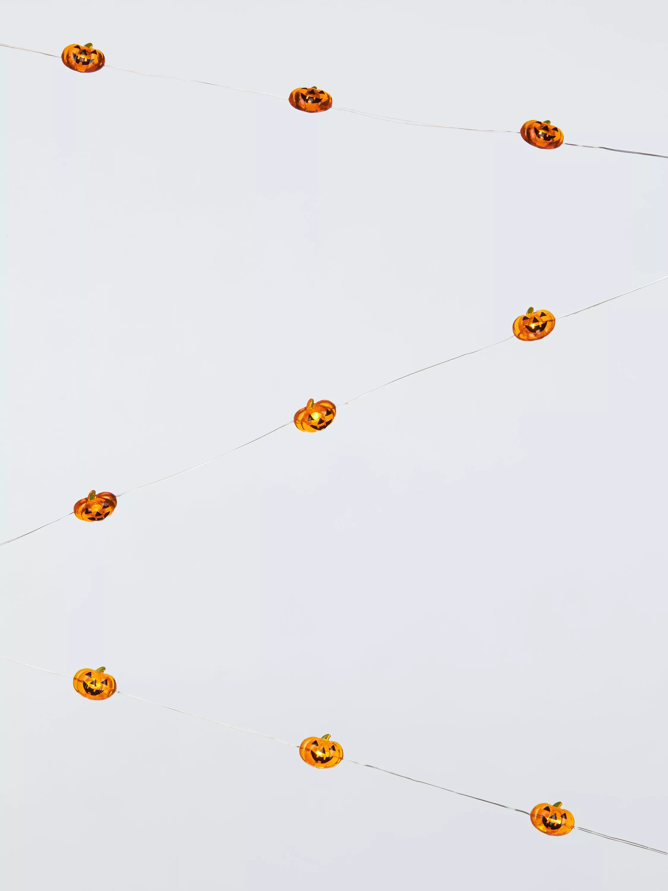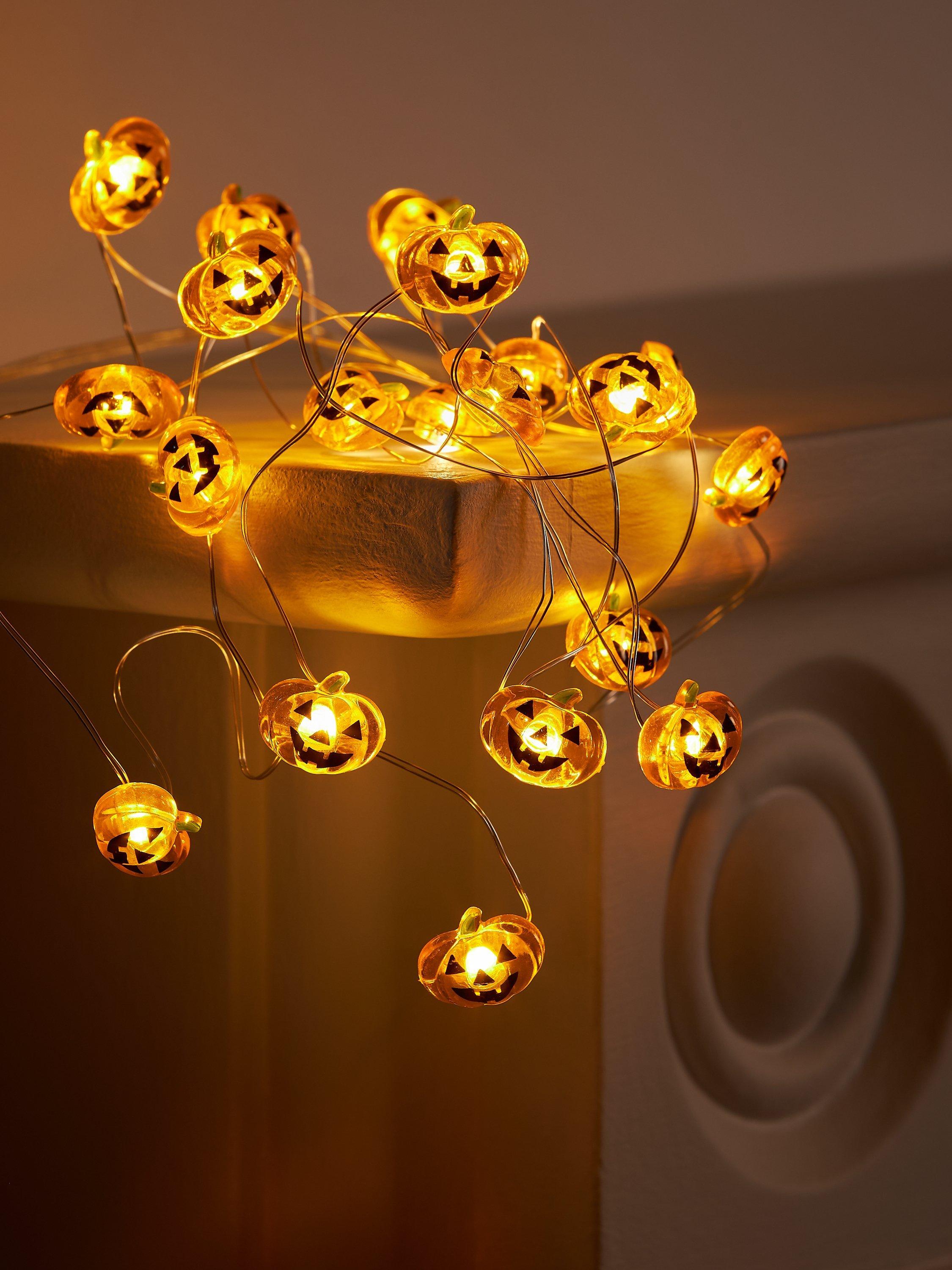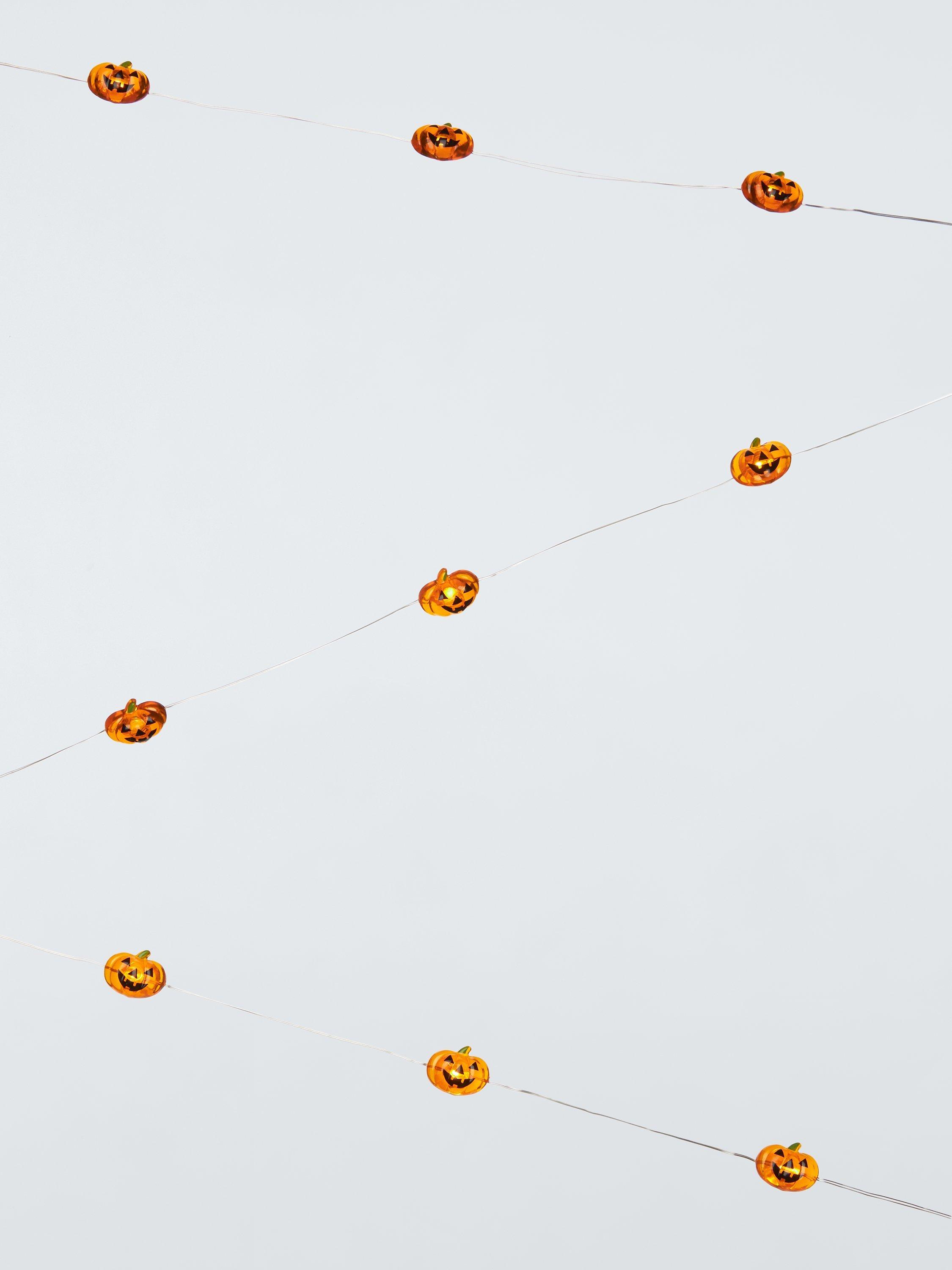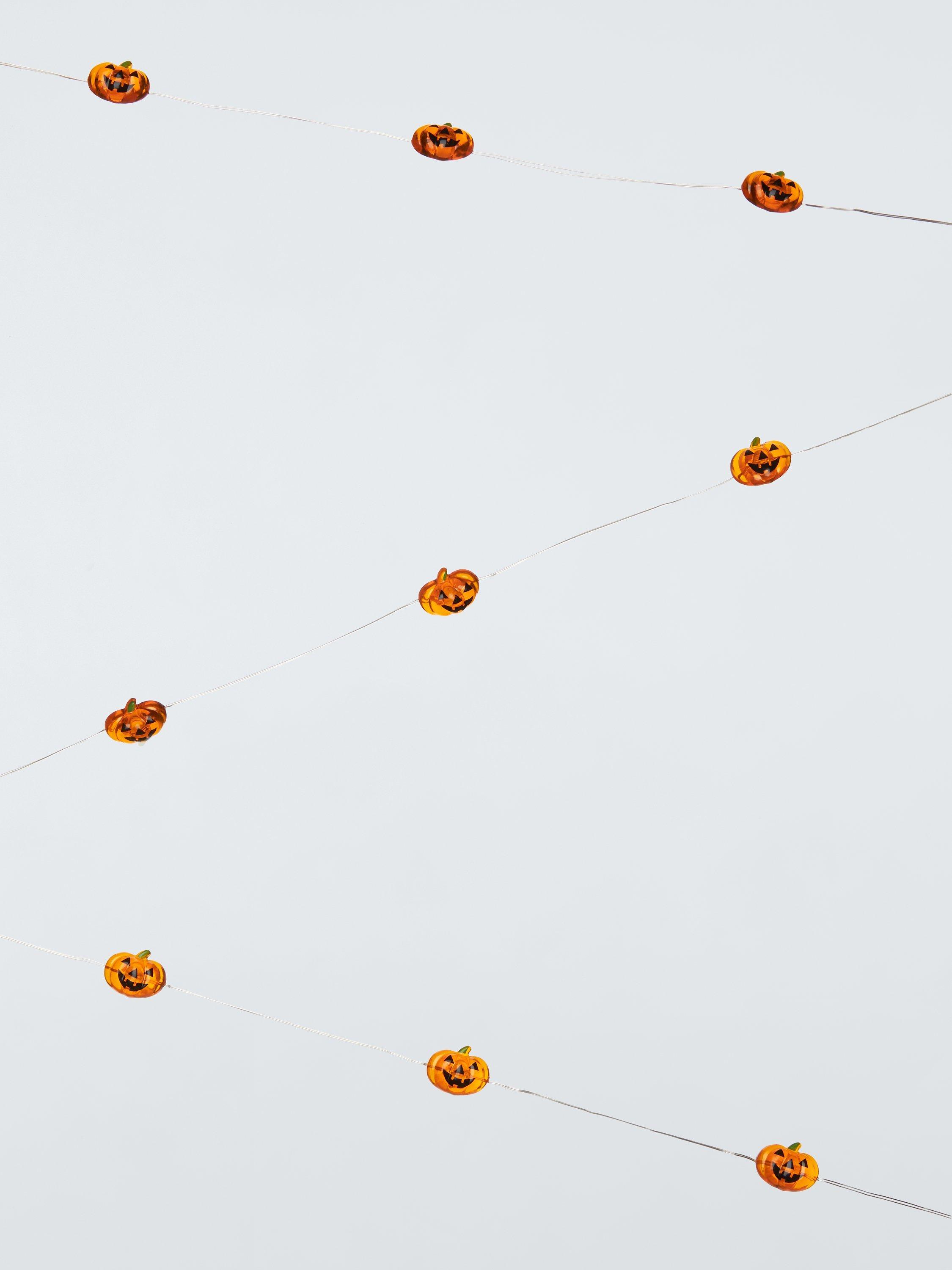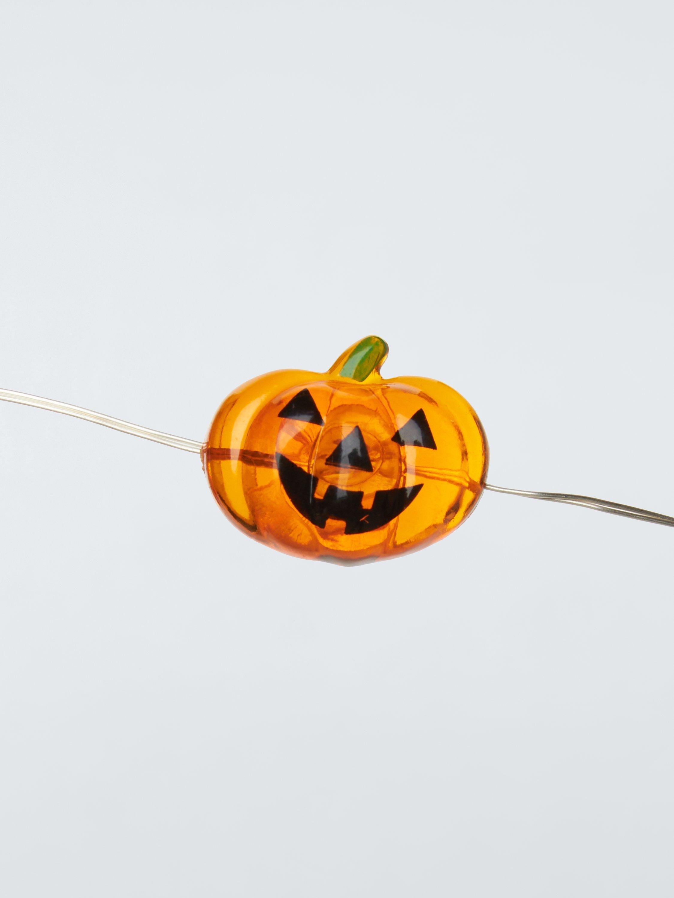 Battery-operated pumpkin string lights on silver fine wire, ideal for creating a spooky glow for your Halloween celebrations. Featuring 20 LEDs.
