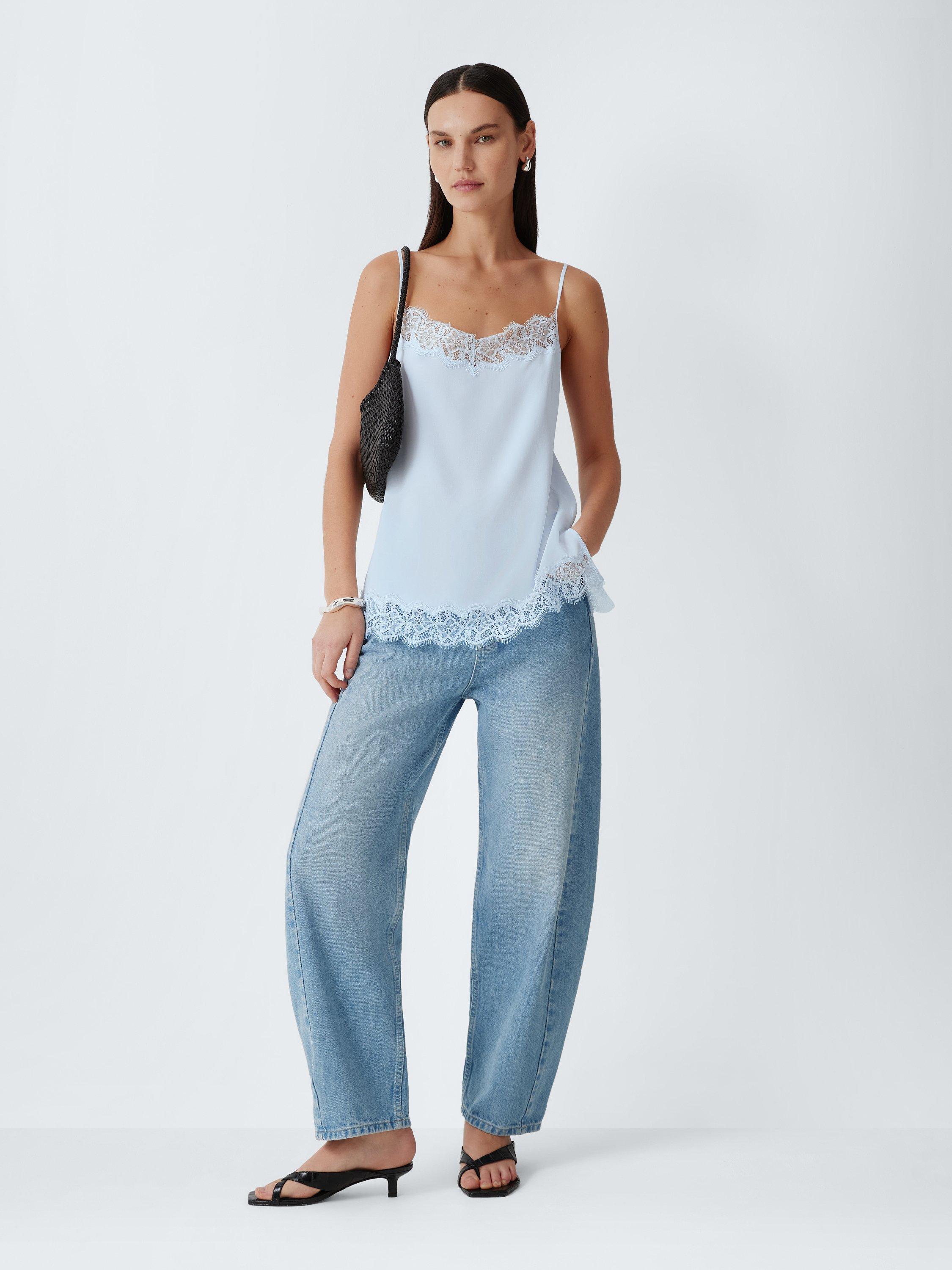 The delicate design features adjustable spaghetti straps and intricate eyelash lace trim along the neckline and hem. This feminine detailing adds a romantic touch, allowing the cami to transition effortlessly from a refined base layer to a stand-alone evening top.