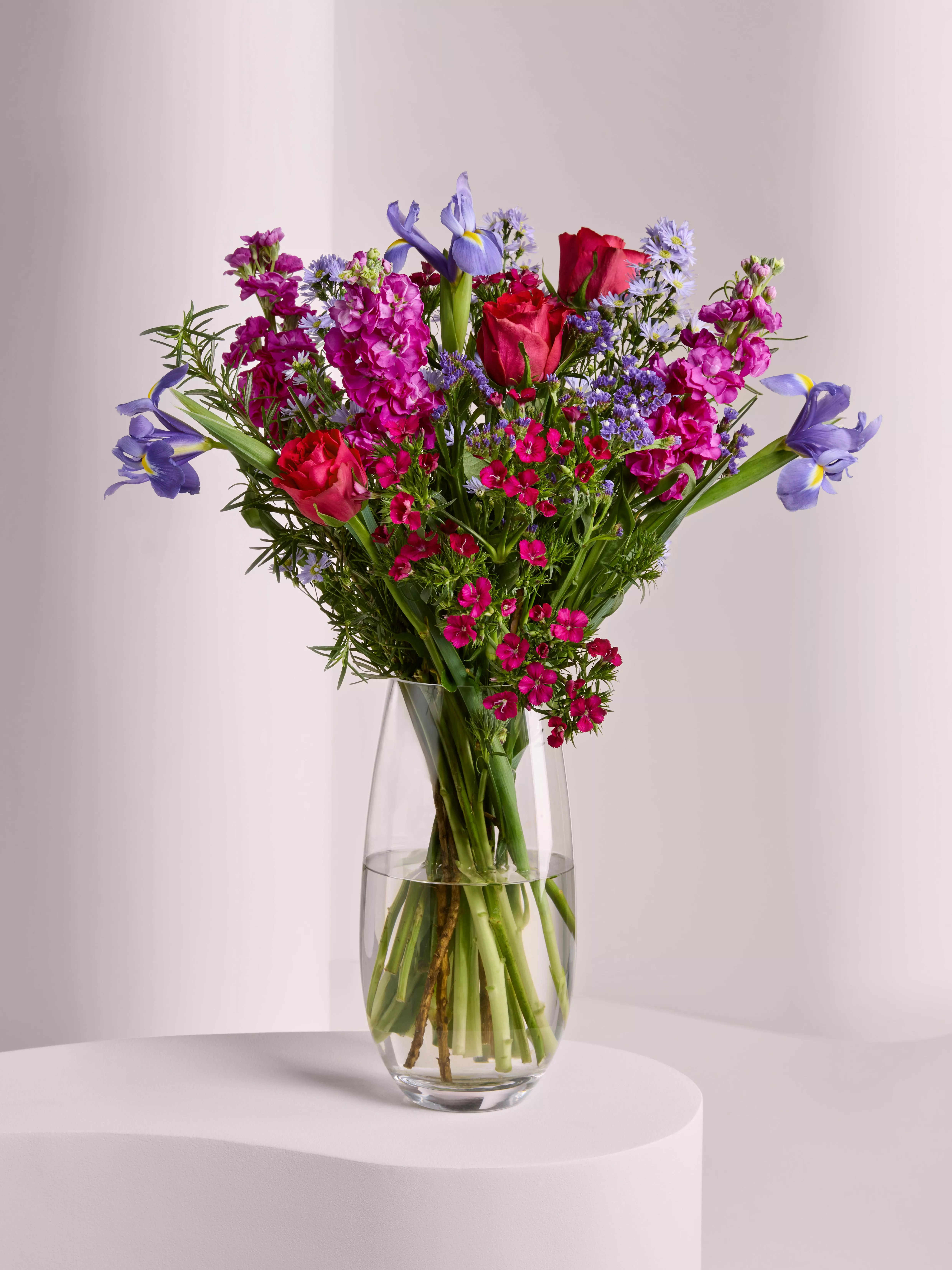 This striking mix includes cerise matthiola, blue iris, blue statice, blue september - flowers that look like daisies, cerise dianthus barbatus and rosemary - for texture, conveniently packed and delivered through the letterbox.