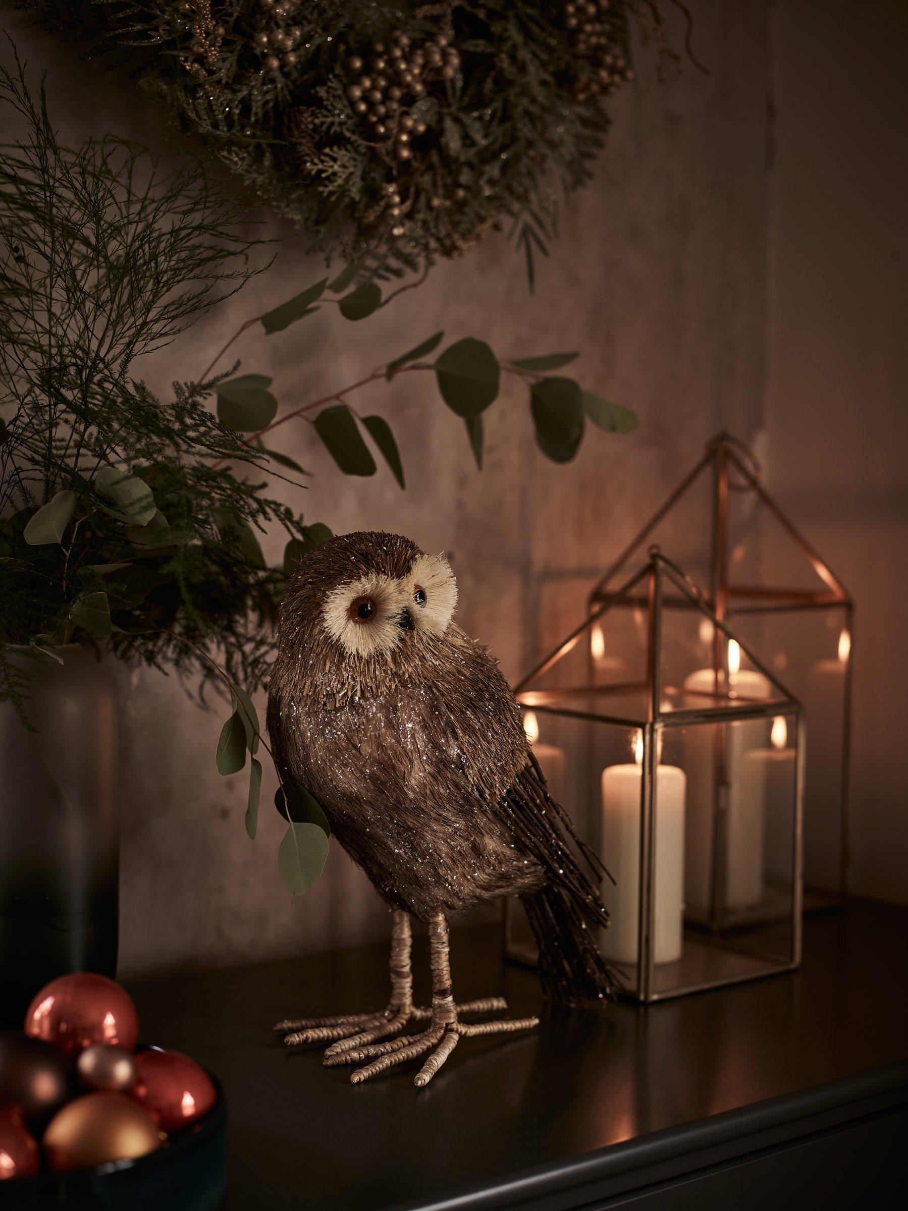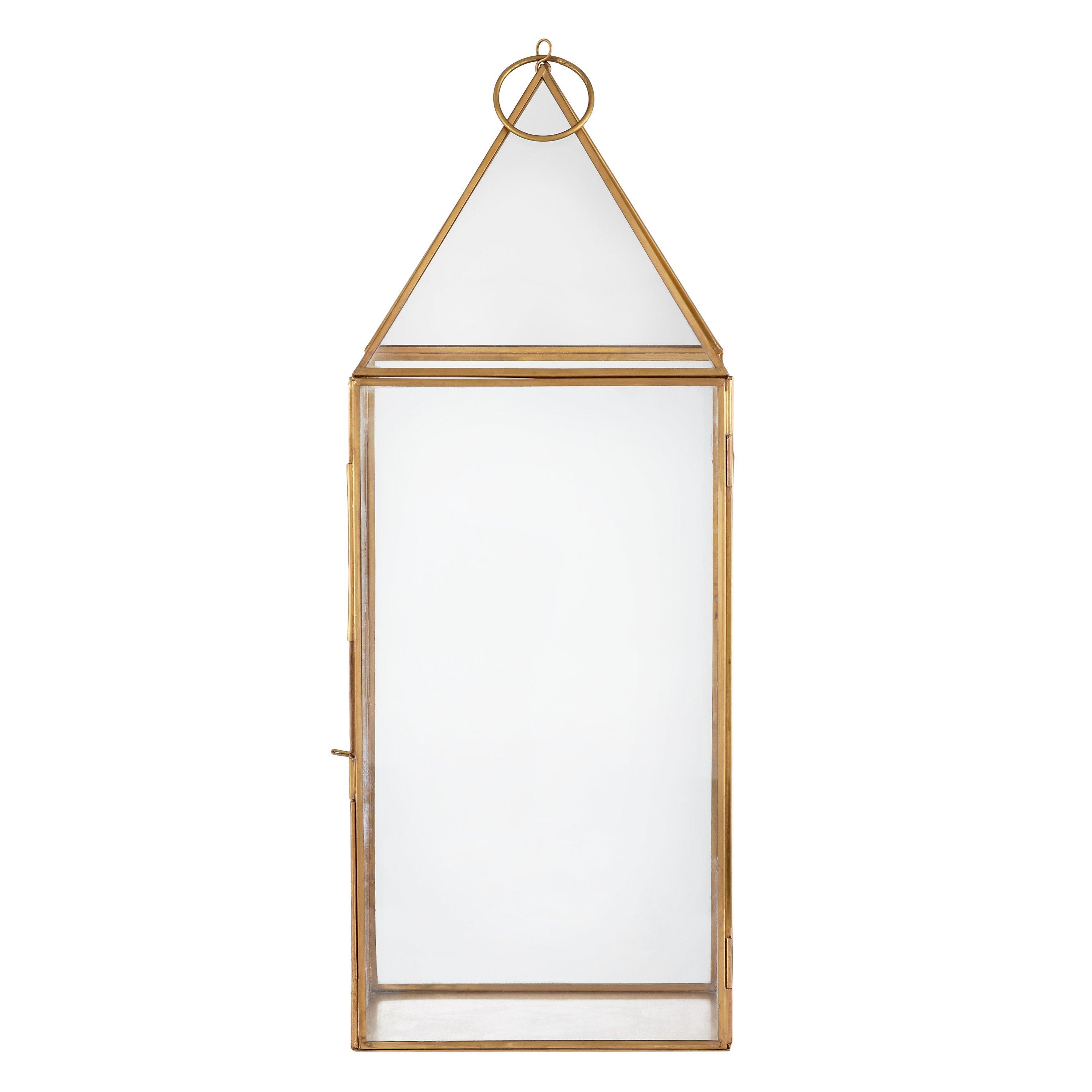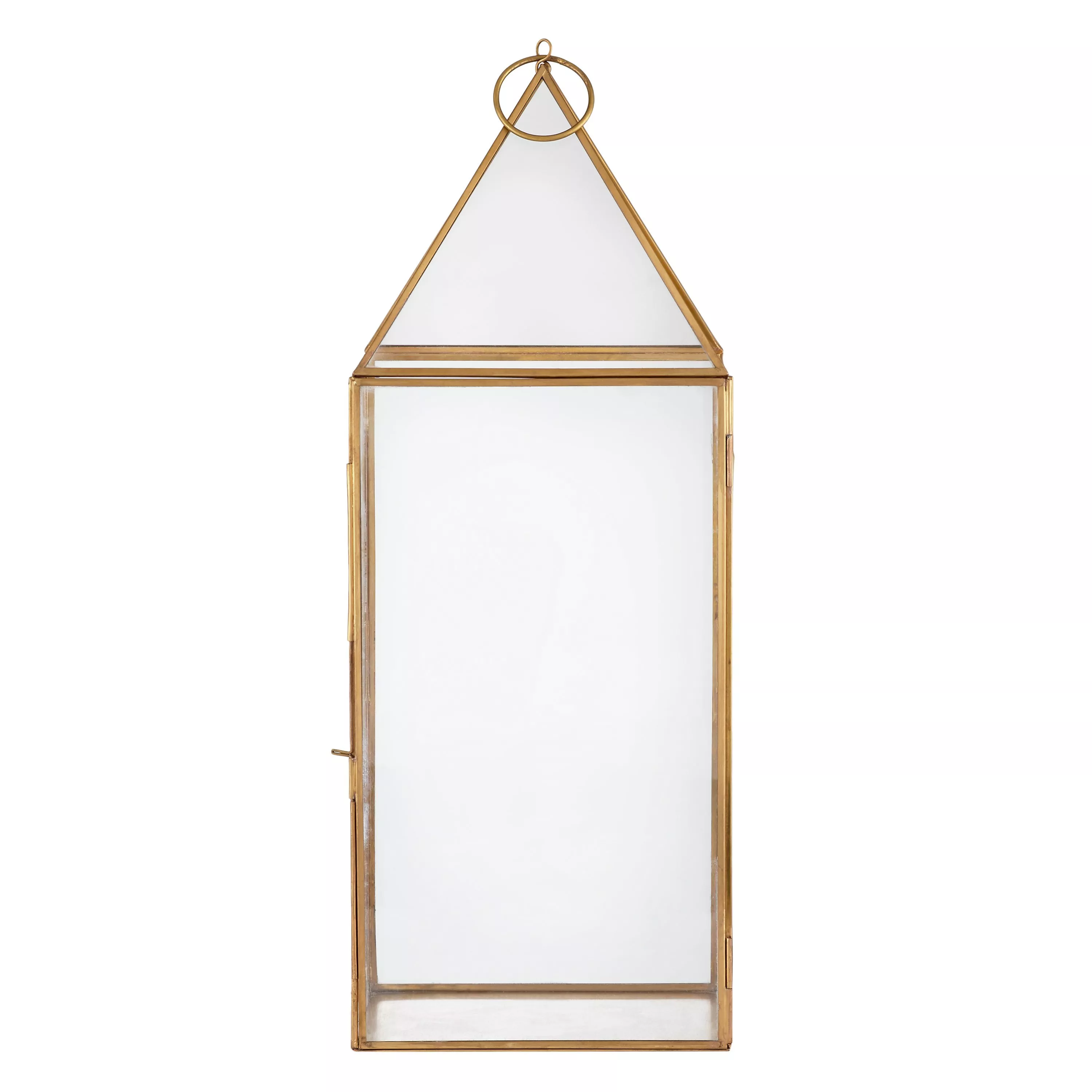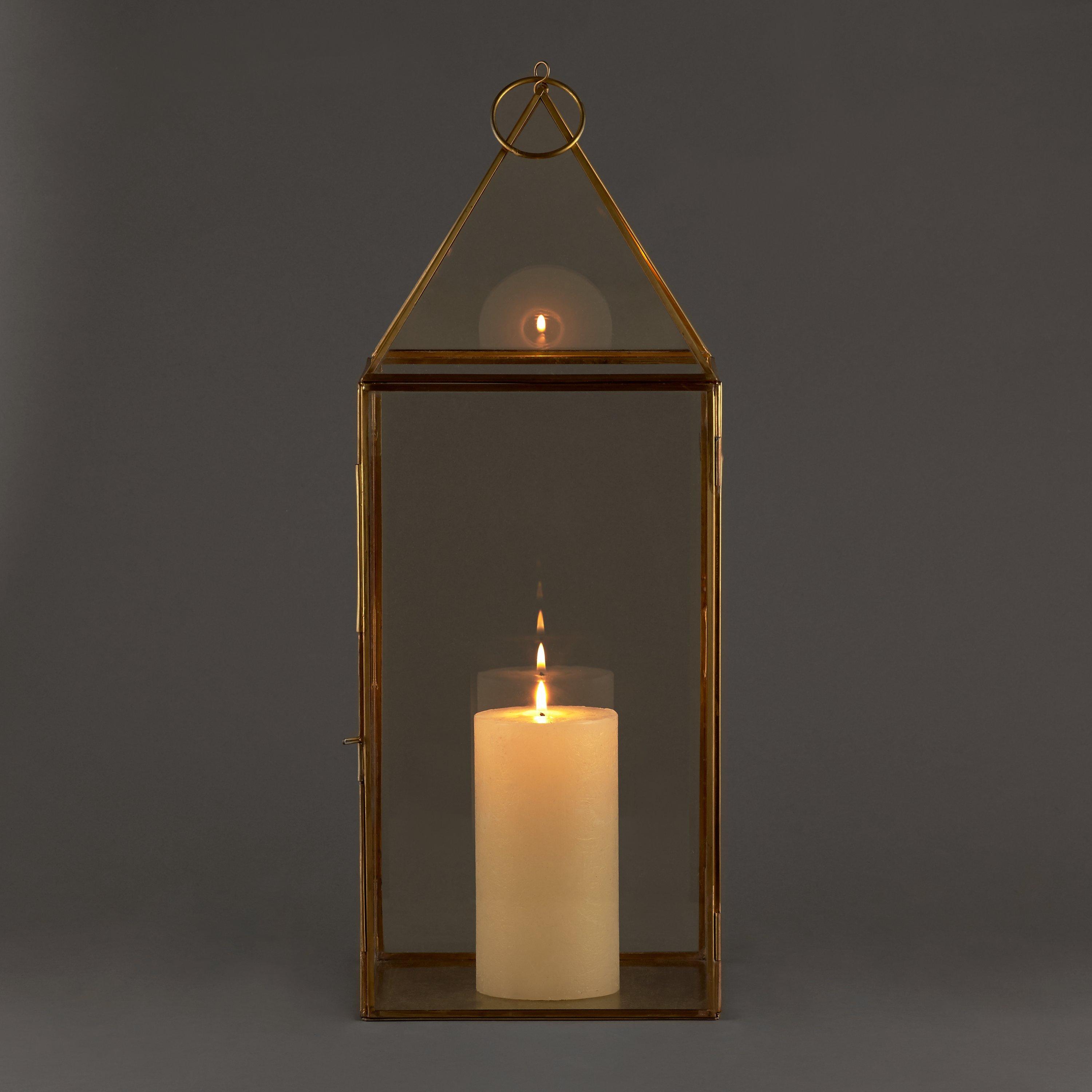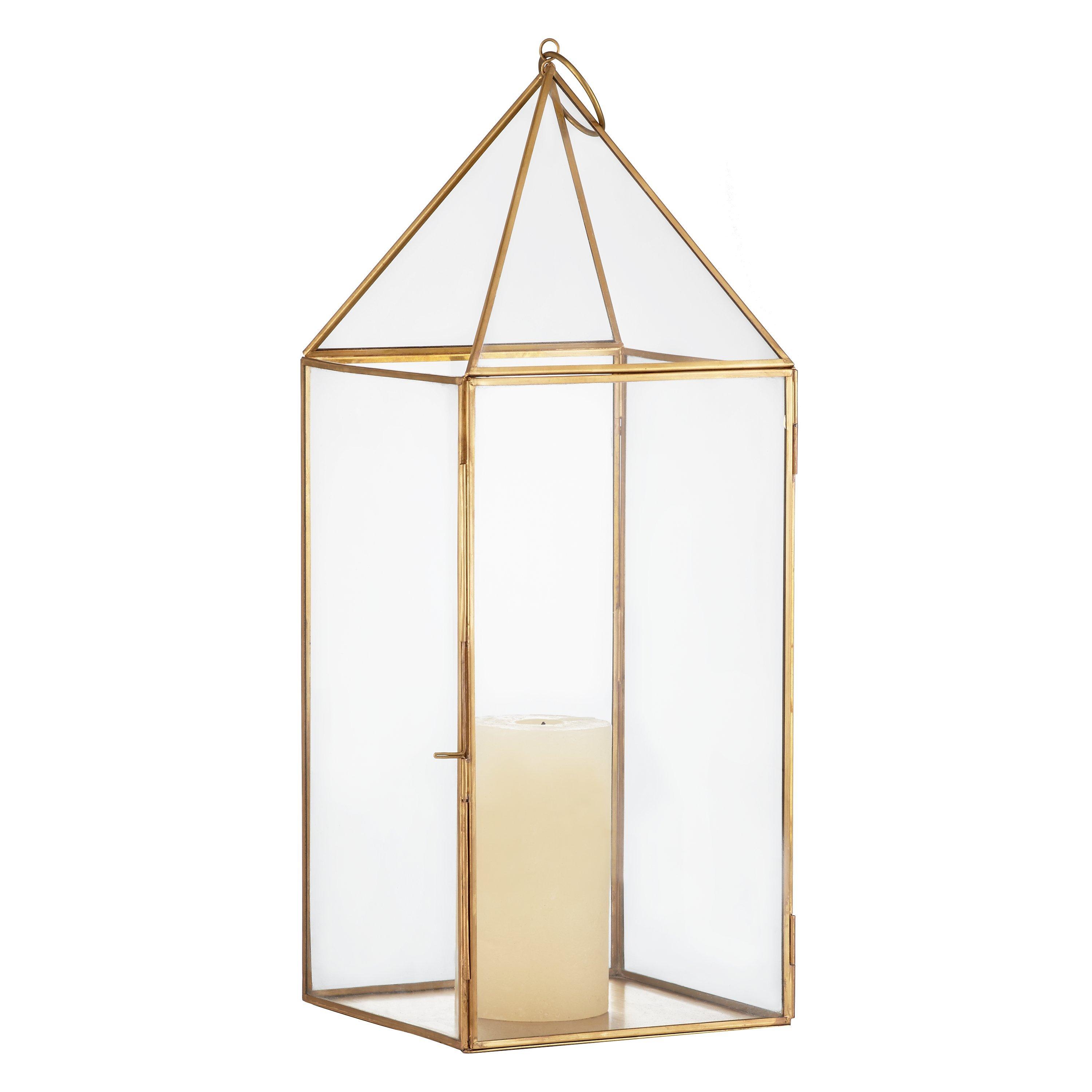 A matte brass effect finish with glass panelled sides and a simple pyramid shaped top allows the light to shine through brilliantly, creating a warm ambience.